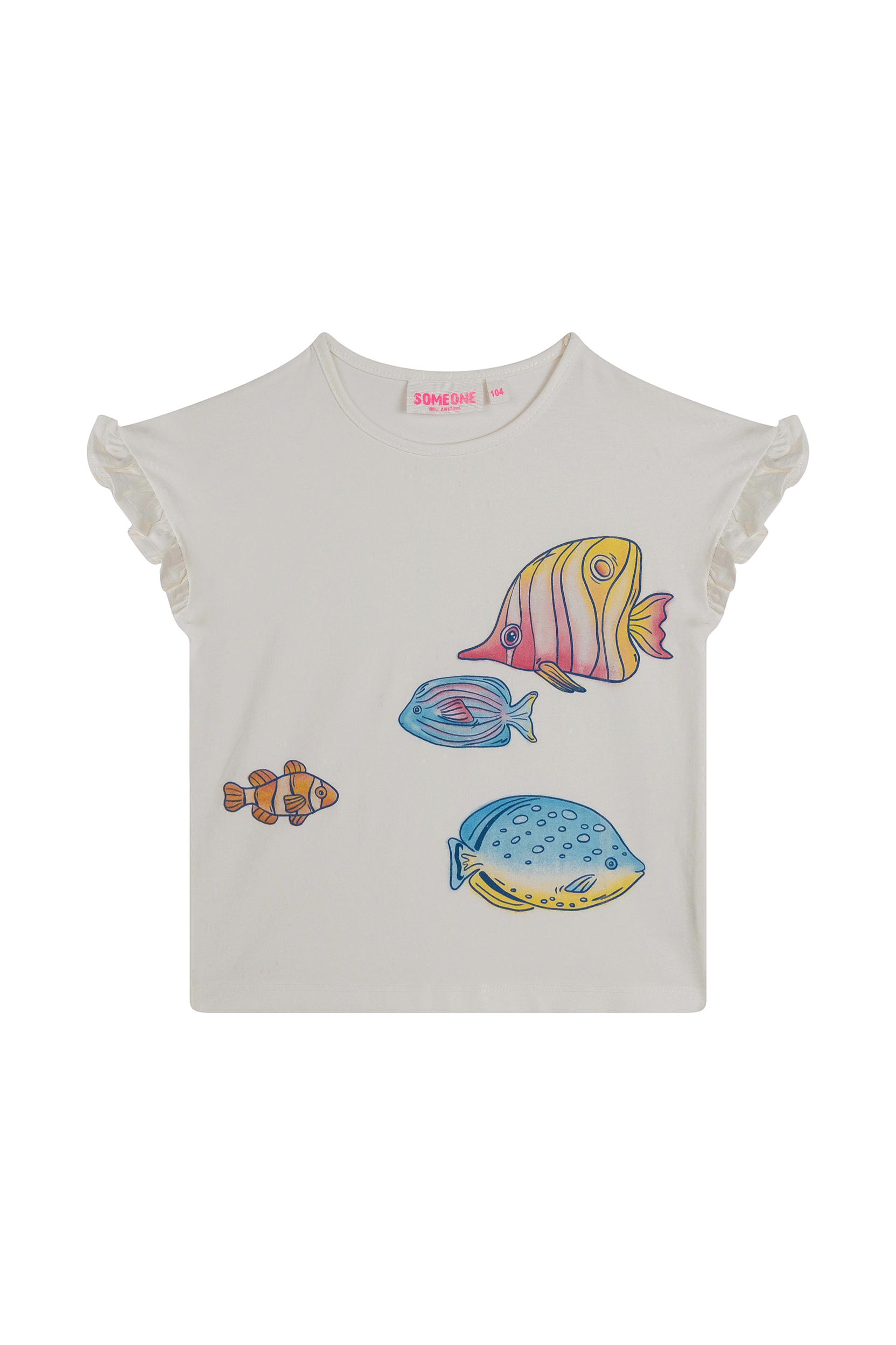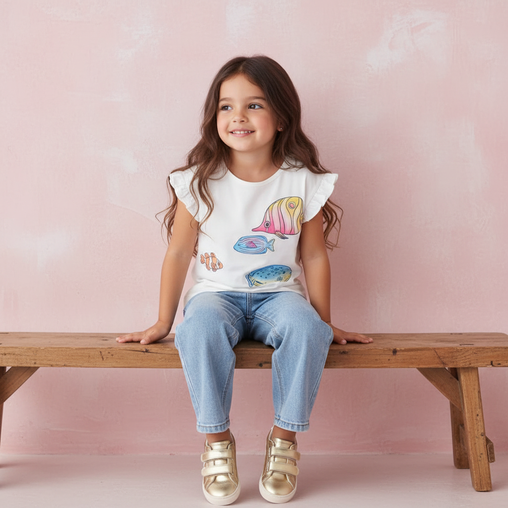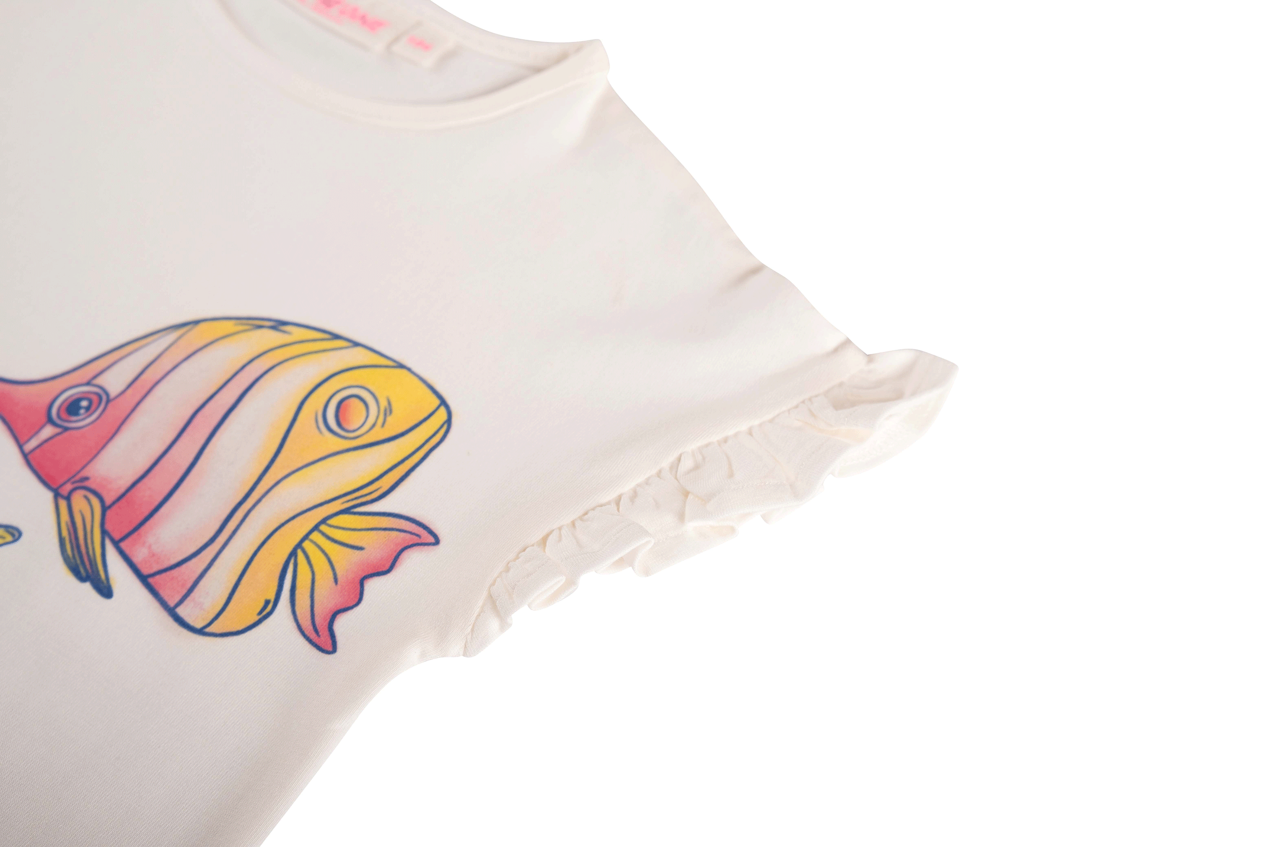 Dit T-shirt voelt alsof je een glimp opvangt van een vrolijk rif. De kleurrijke visjes lijken bijna langs te zwemmen, ieder met zijn eigen karakter. De kleine ruches aan de mouwtjes geven het shirt net dat speelse extraatje. Ideaal voor dagen waarop er een beetje fantasie in de outfit mag zitten.