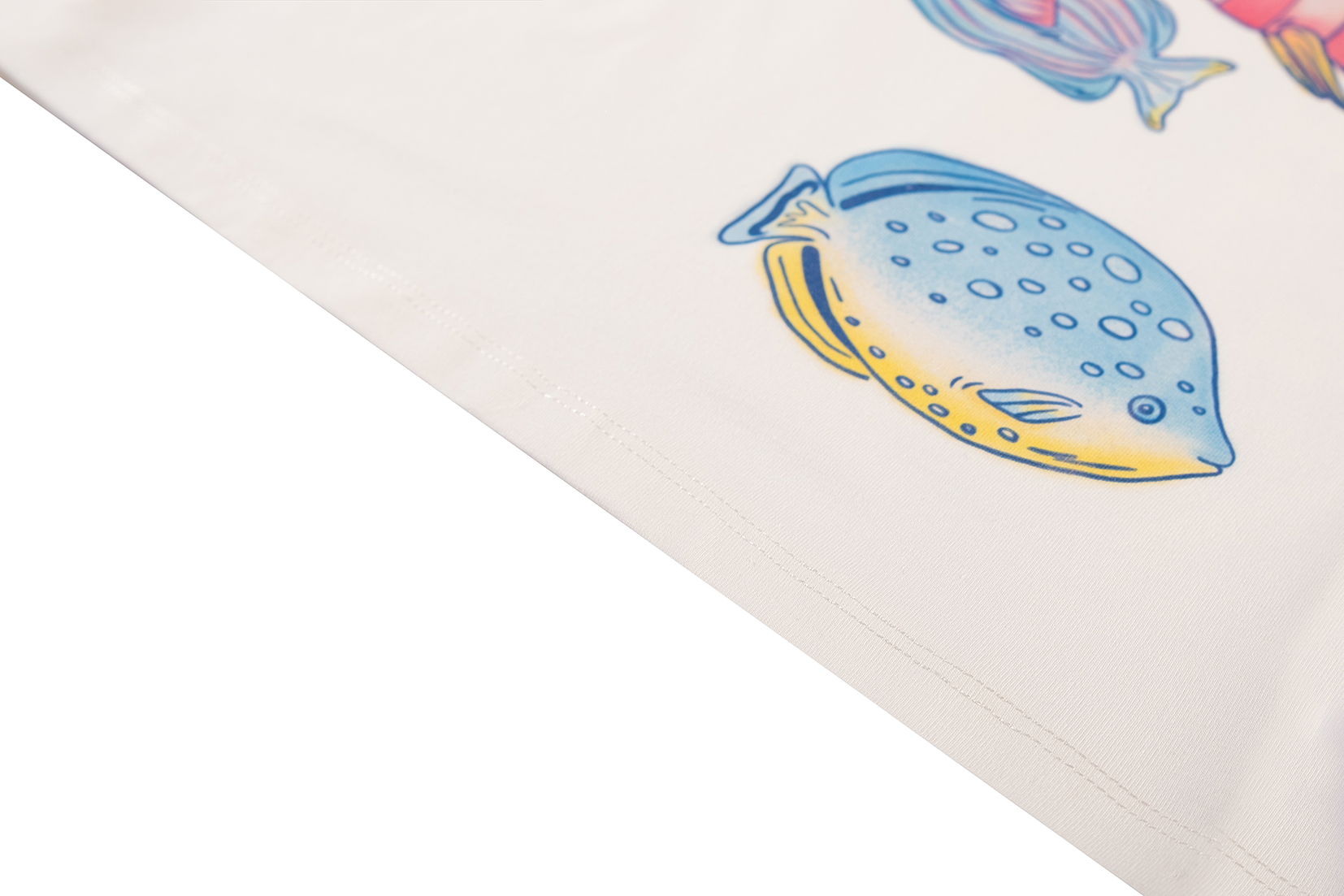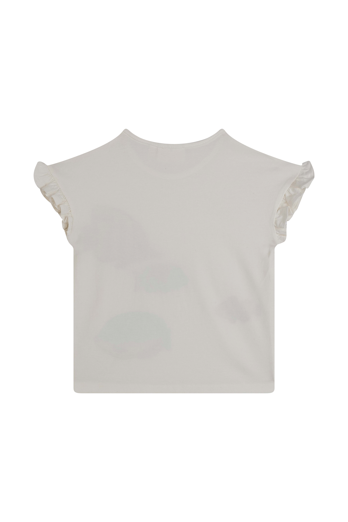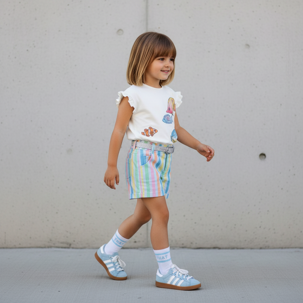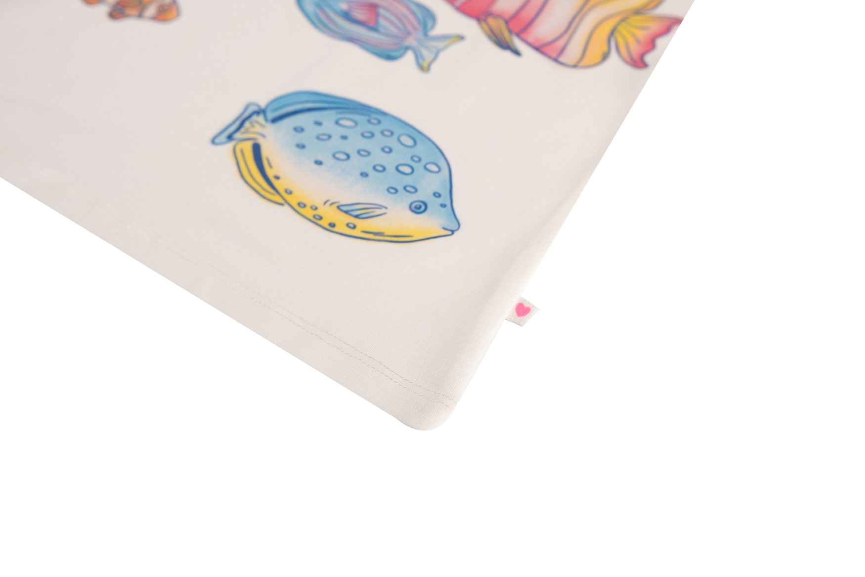 Dit T-shirt voelt alsof je een glimp opvangt van een vrolijk rif. De kleurrijke visjes lijken bijna langs te zwemmen, ieder met zijn eigen karakter. De kleine ruches aan de mouwtjes geven het shirt net dat speelse extraatje. Ideaal voor dagen waarop er een beetje fantasie in de outfit mag zitten.