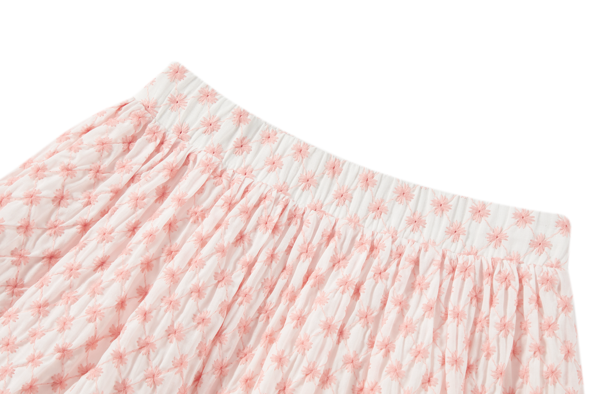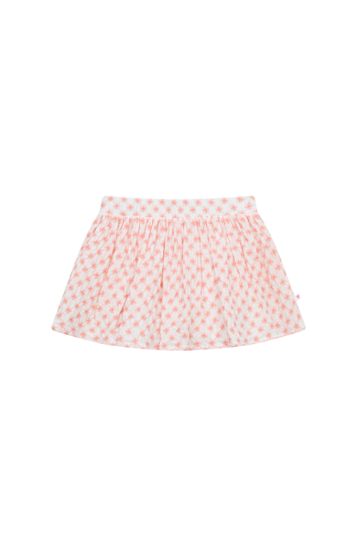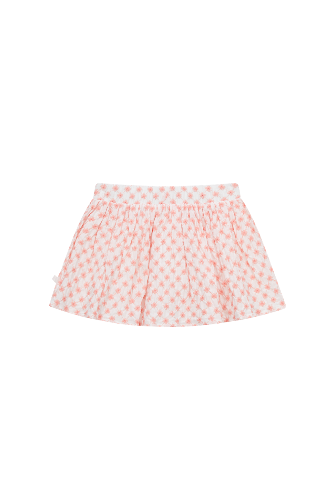 Deze zachte, licht uitgewaaierde rok heeft een subtiel maar vrolijk patroon van kleine perzikroze palmblaadjes. Het geheel oogt fris en luchtig, perfect voor warme dagen. Dankzij de comfortabele elastische tailleband zit het rokje meteen goed. Een lieve, zomerse stijl die makkelijk te combineren is.