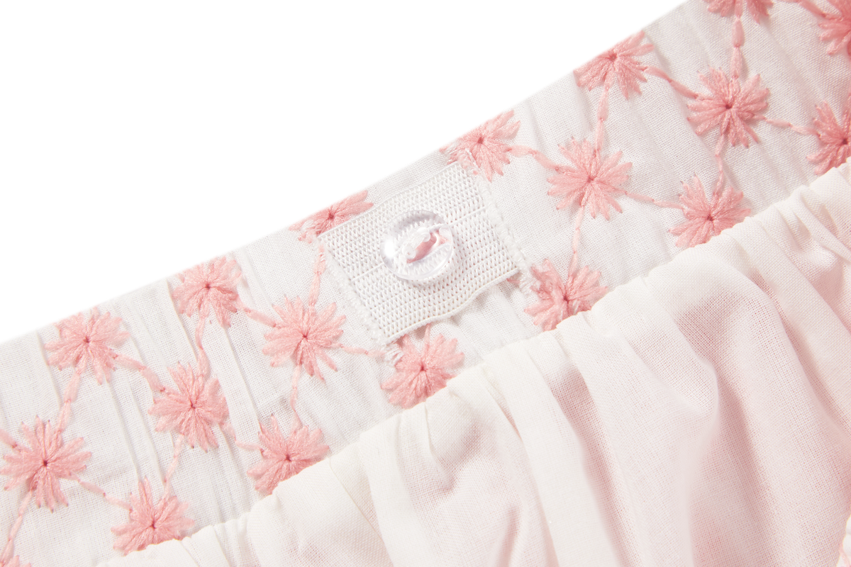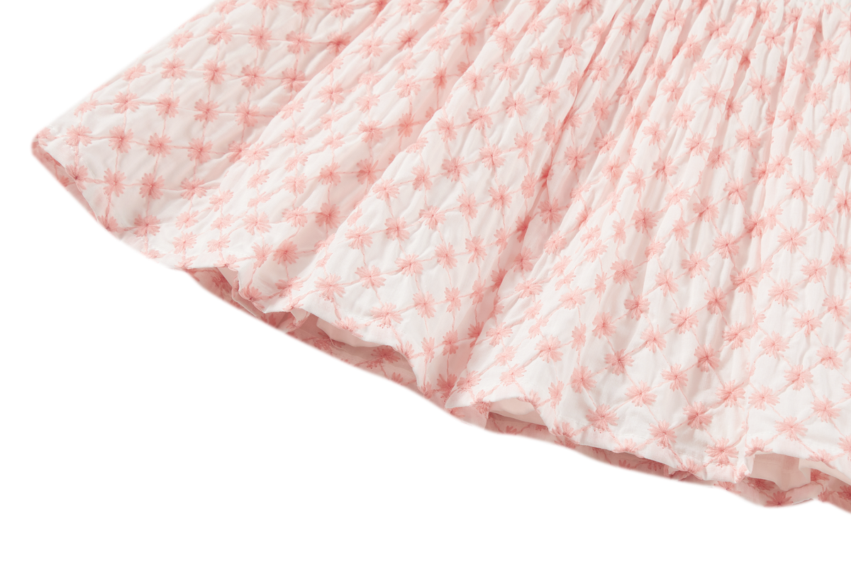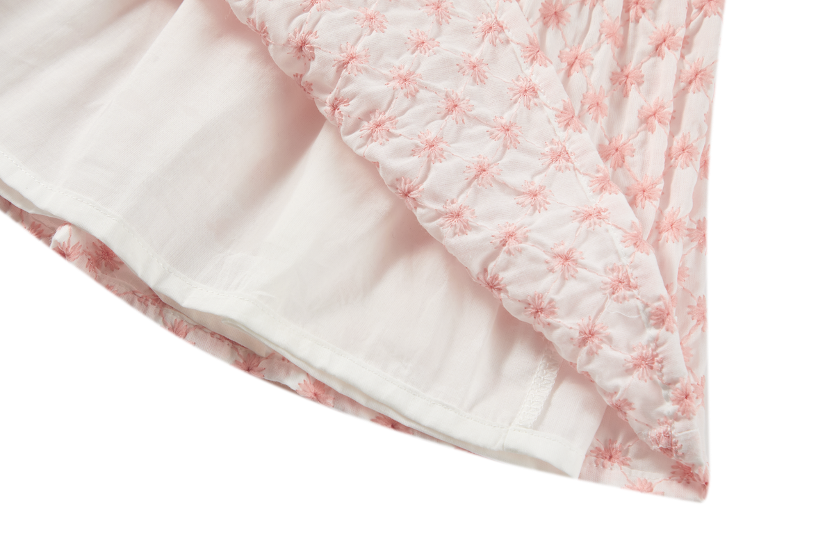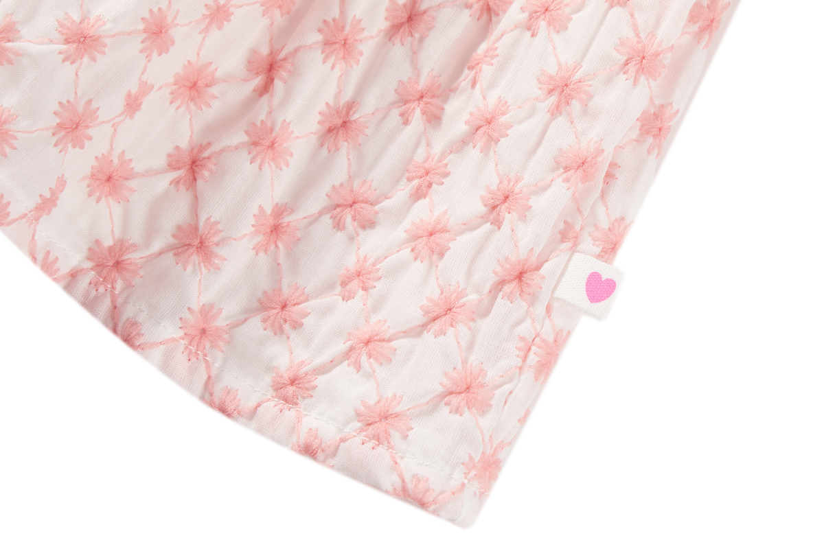 Deze zachte, licht uitgewaaierde rok heeft een subtiel maar vrolijk patroon van kleine perzikroze palmblaadjes. Het geheel oogt fris en luchtig, perfect voor warme dagen. Dankzij de comfortabele elastische tailleband zit het rokje meteen goed. Een lieve, zomerse stijl die makkelijk te combineren is.