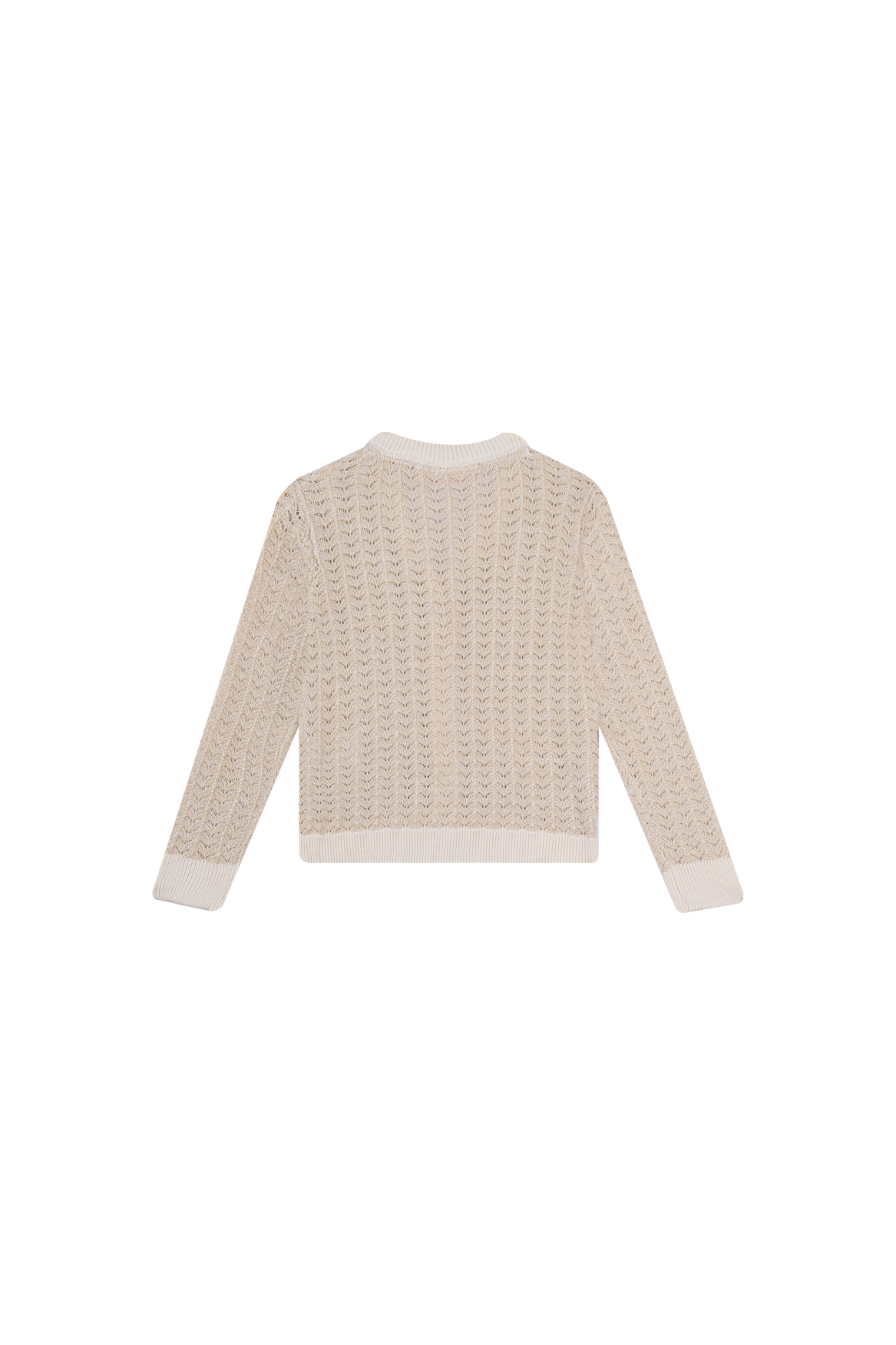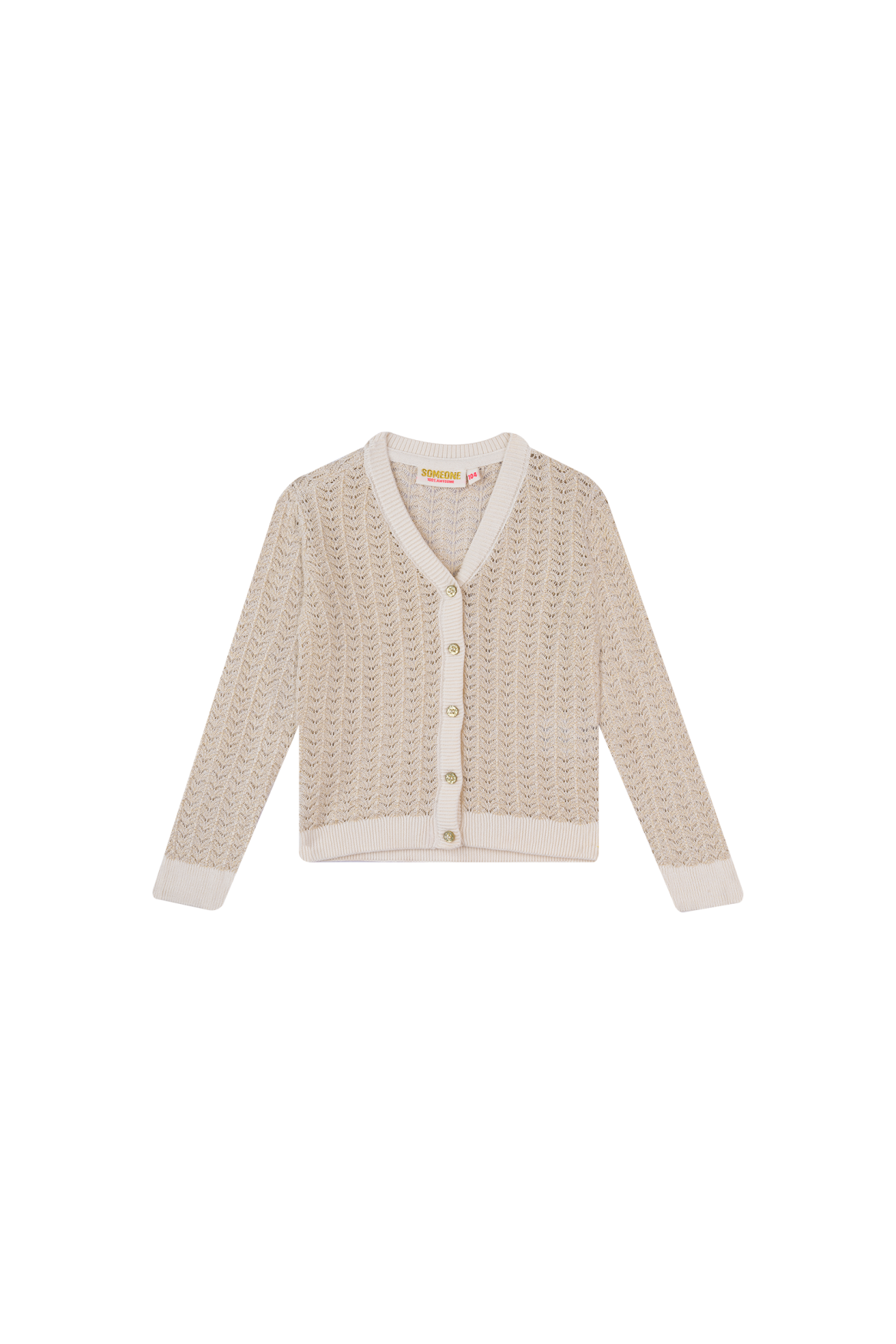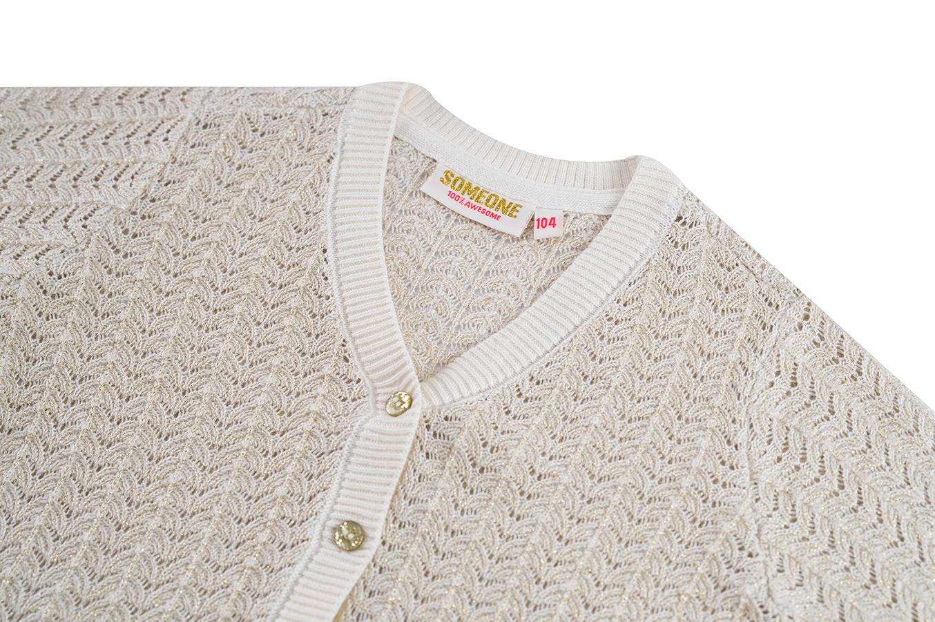 A stylish girls’ cardigan in ecru with a delicate openwork pattern and a hint of shimmer. The V-neck and button closure make it easy to wear open over a top or closed as an elegant sweater. Perfect for school, parties or special occasions.