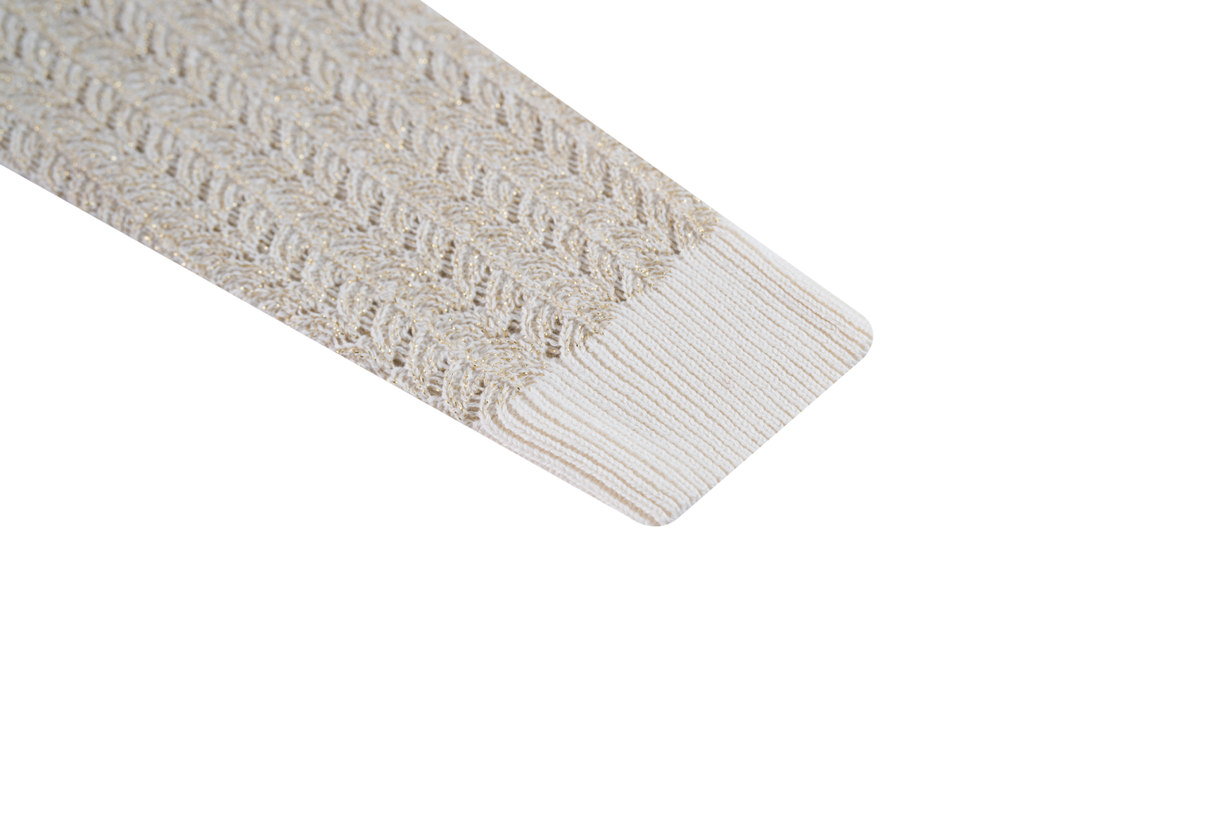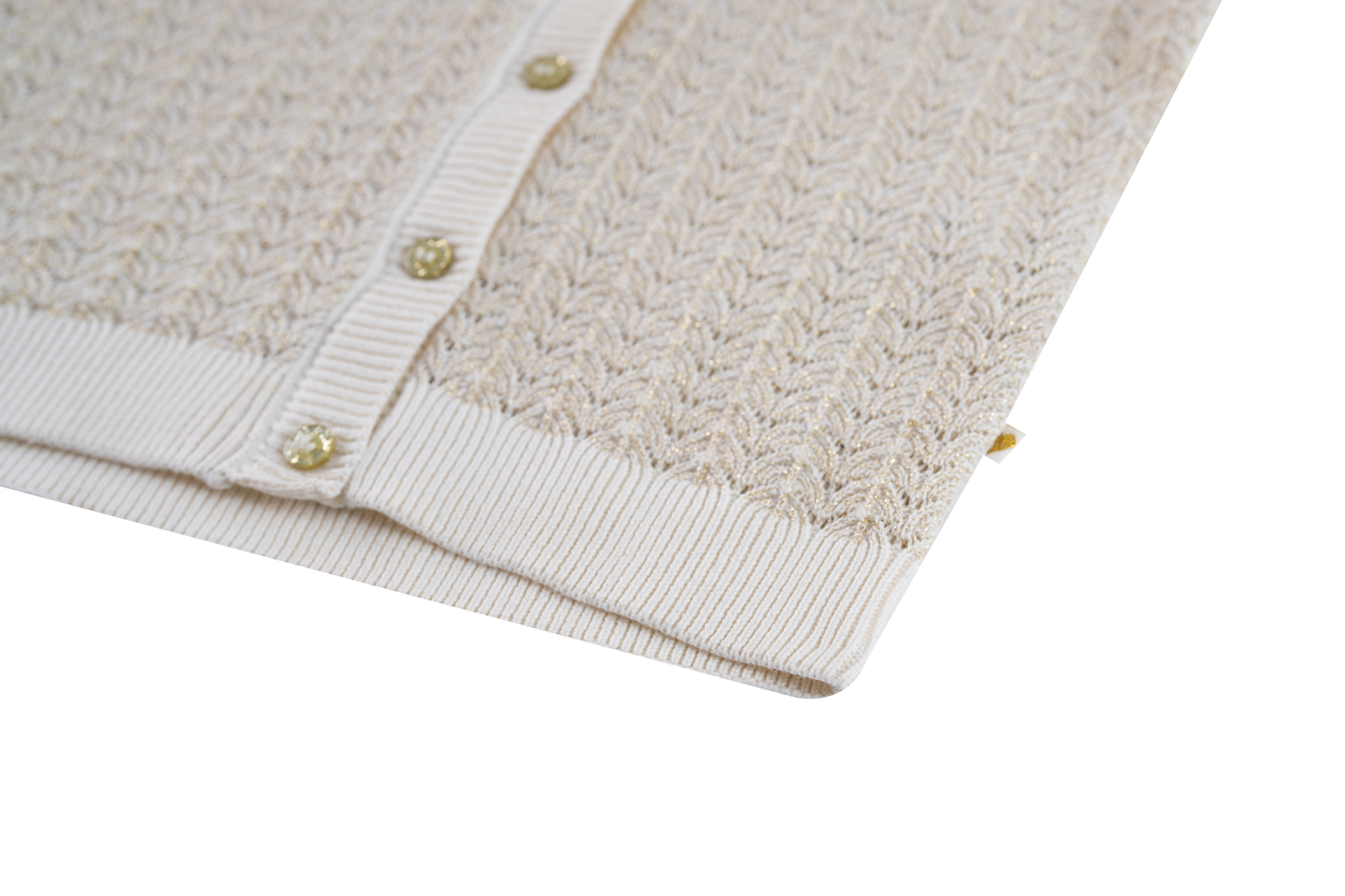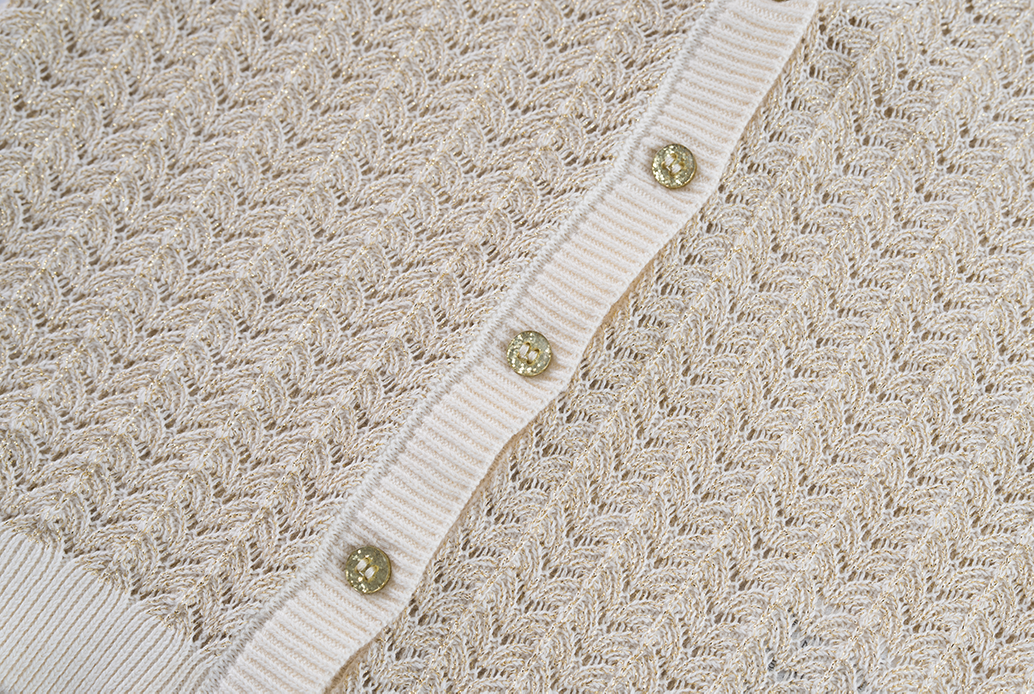 A stylish girls’ cardigan in ecru with a delicate openwork pattern and a hint of shimmer. The V-neck and button closure make it easy to wear open over a top or closed as an elegant sweater. Perfect for school, parties or special occasions.