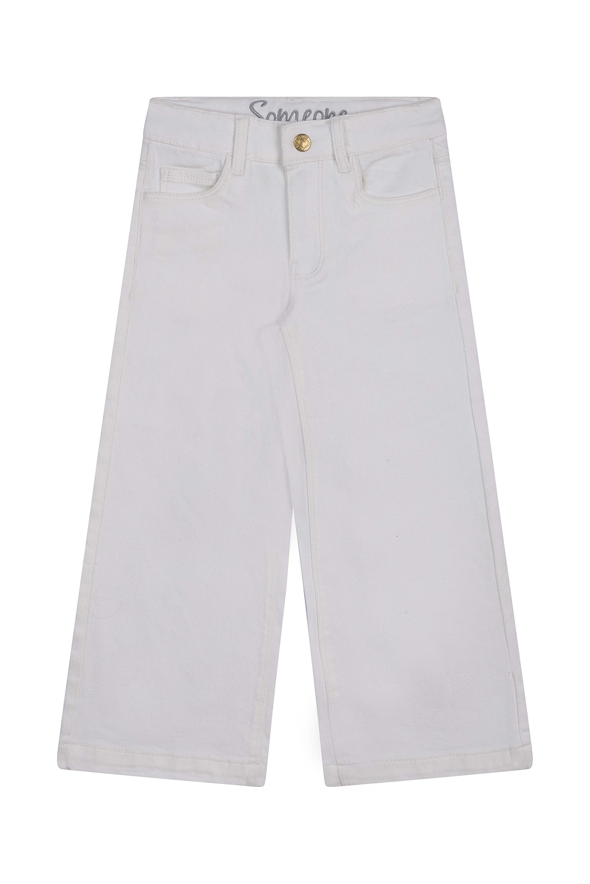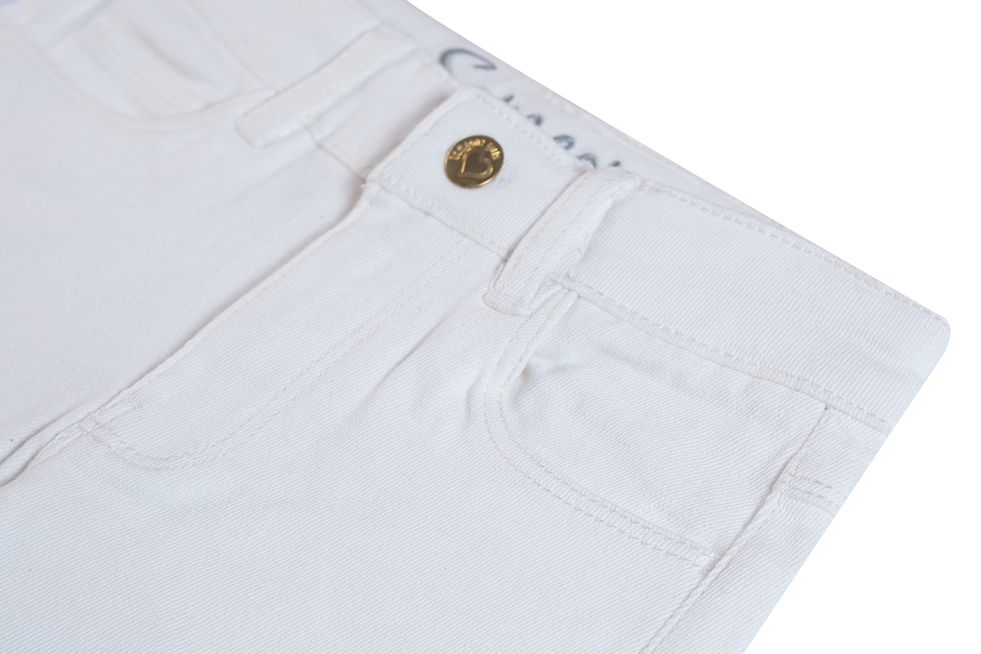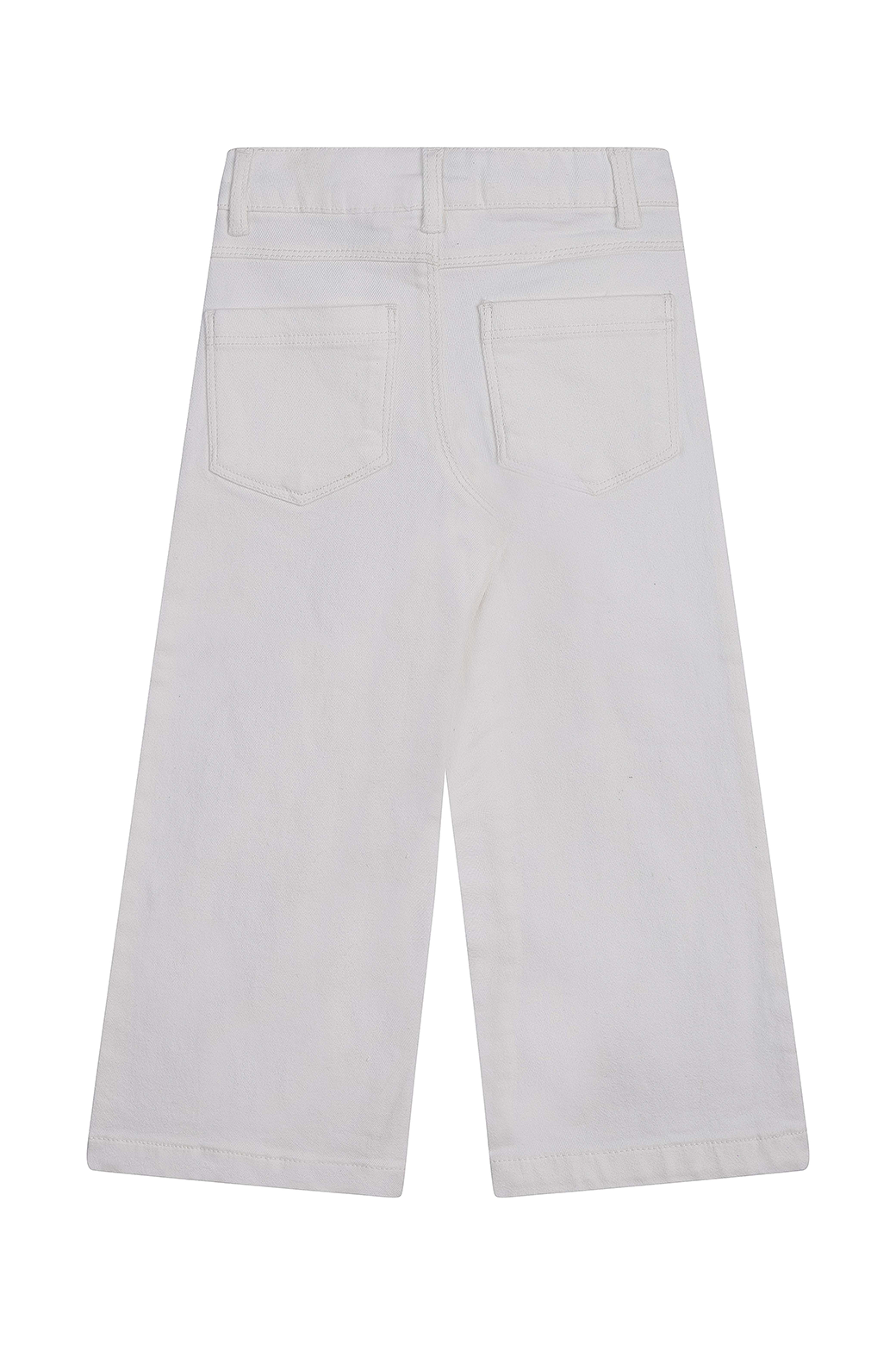 Trendy kids’ trousers in white denim. Designed with a straight, slightly wide fit for comfort and easy styling. Features classic jeans details such as side pockets, back pockets, and a button closure. Perfect for a fresh spring and summer outfit.