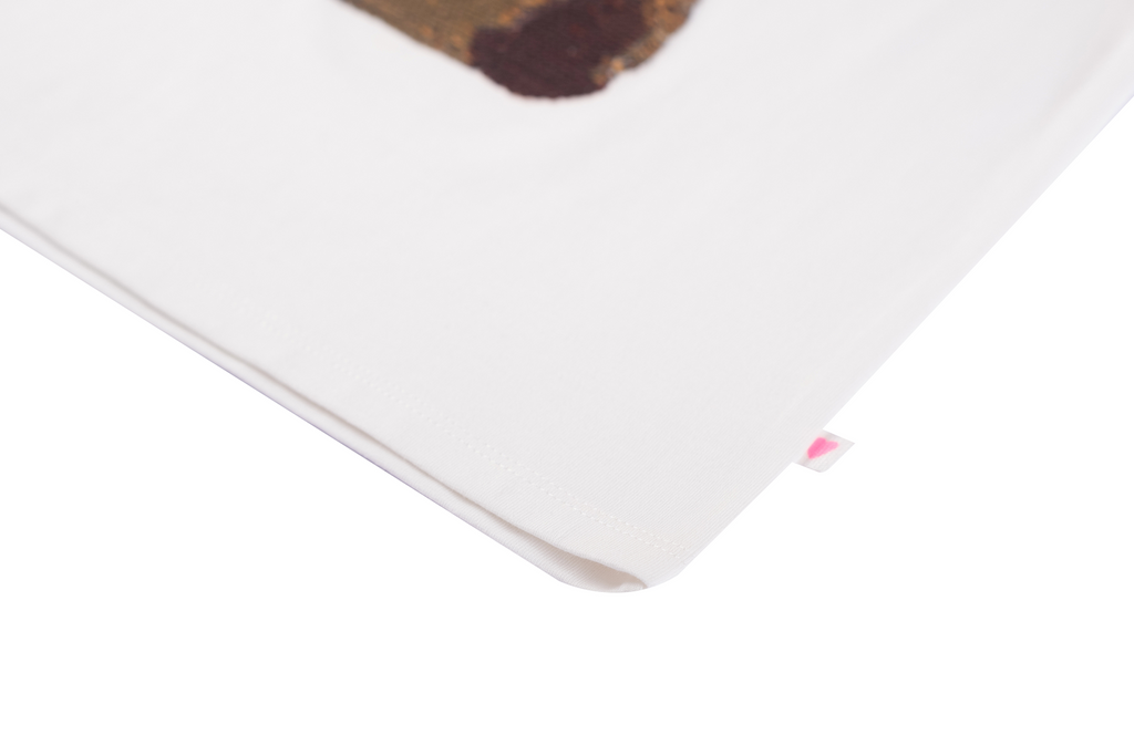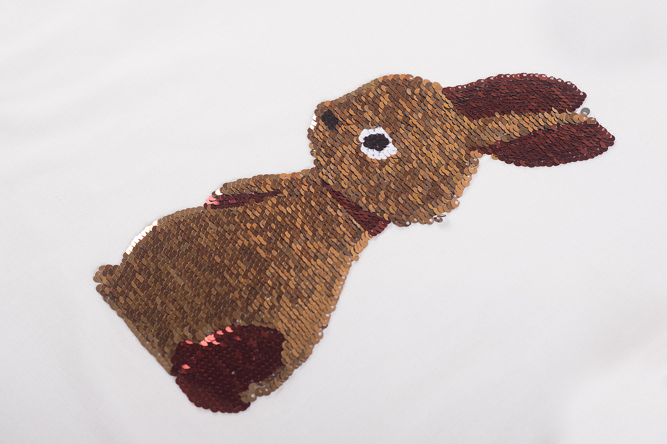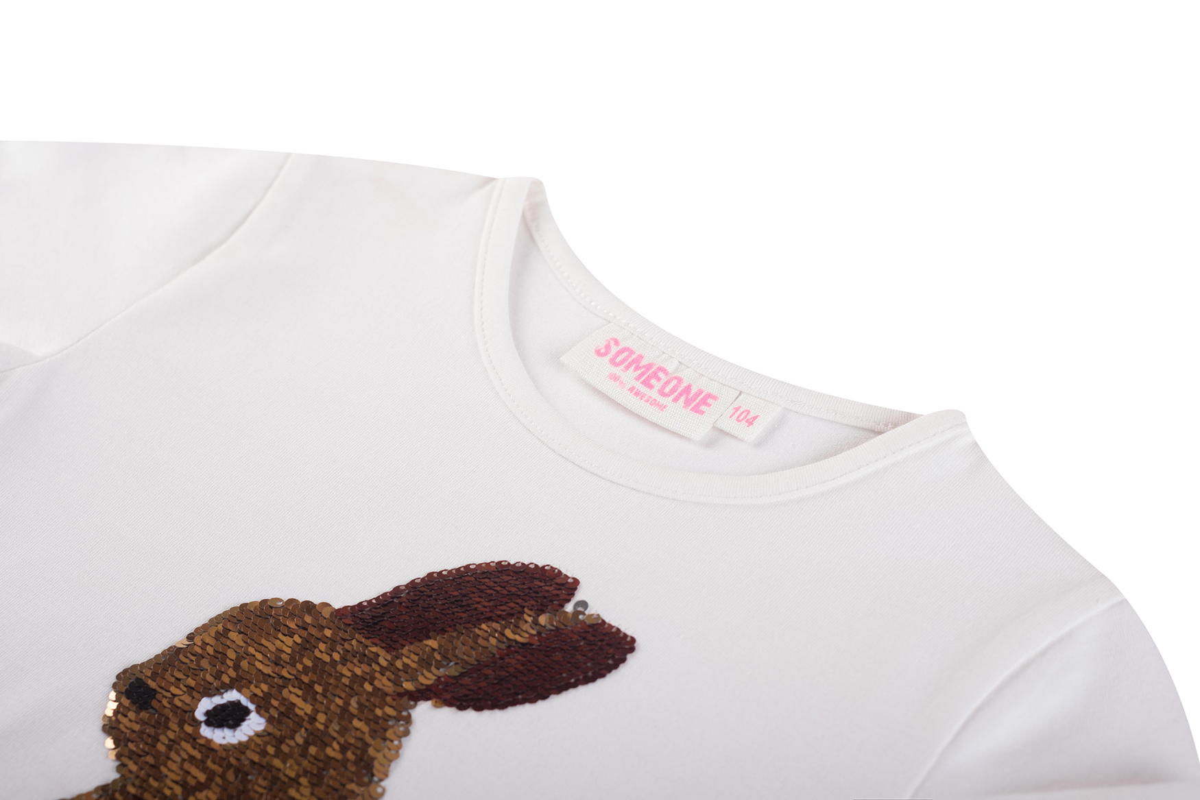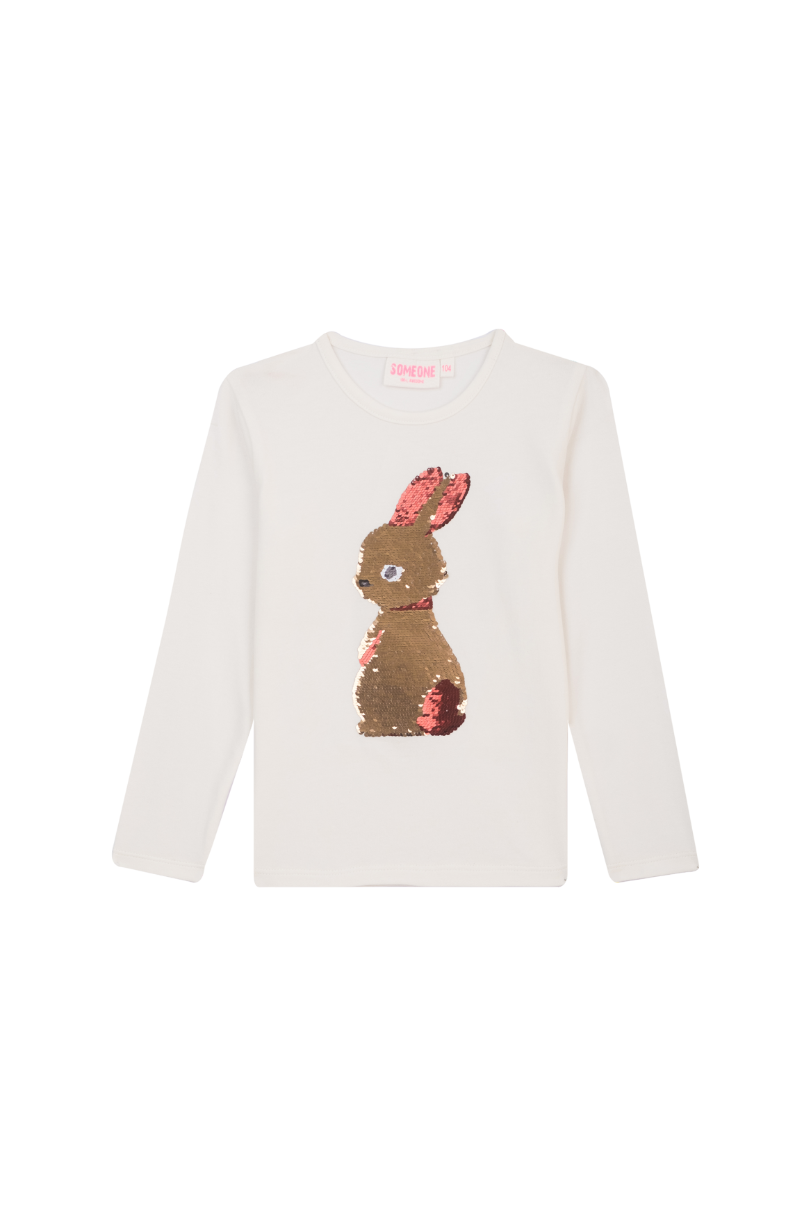This white long-sleeved top is a playful and charming garment with a striking design. On the chest, a bunny is shown in profile, made of shimmering sequins in shades of brown and pink. The bunny features a blue eye and a red collar, giving the design a lively and imaginative feel. The mix of color and sparkle makes this shirt a true eye-catcher. A top that’s perfect for girls who love animals and decorative touches in their outfit.