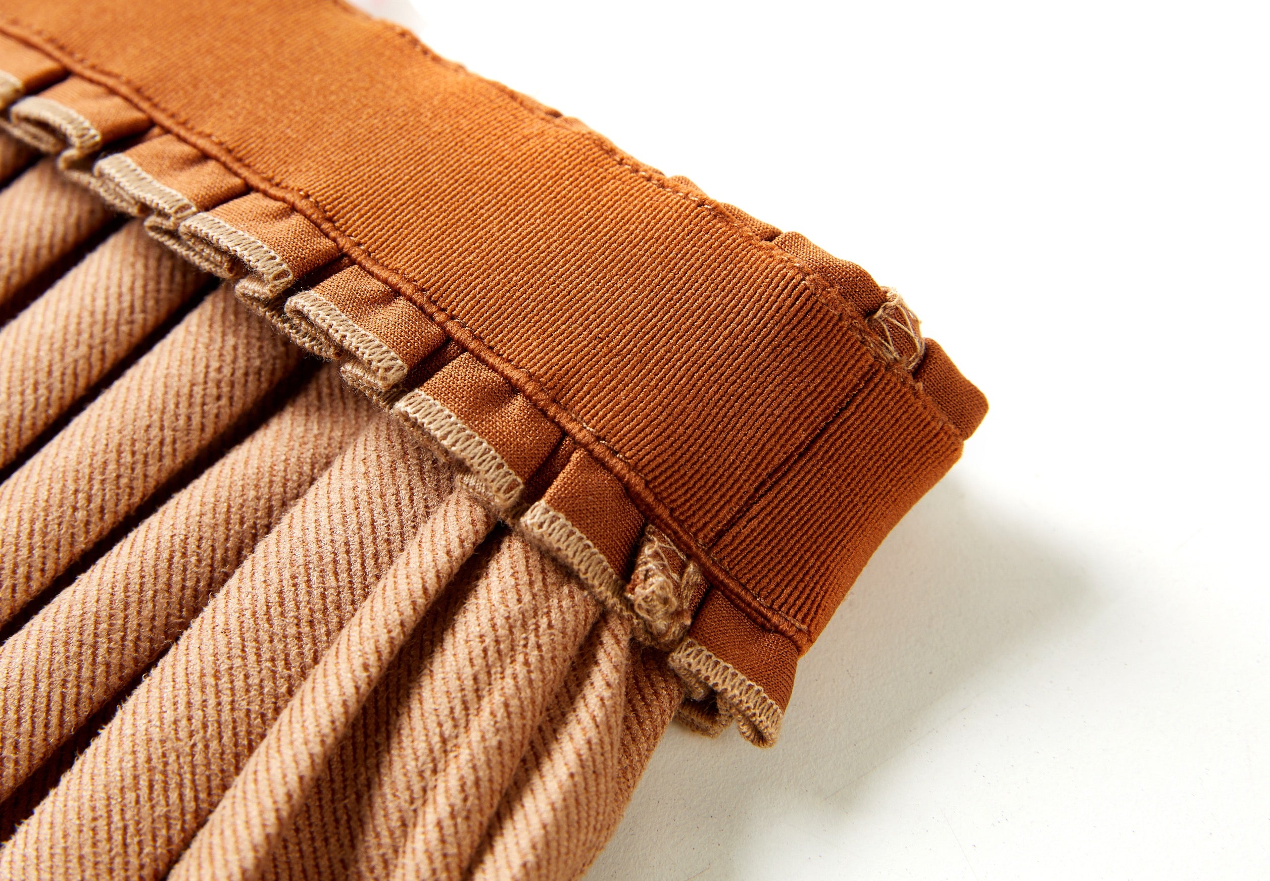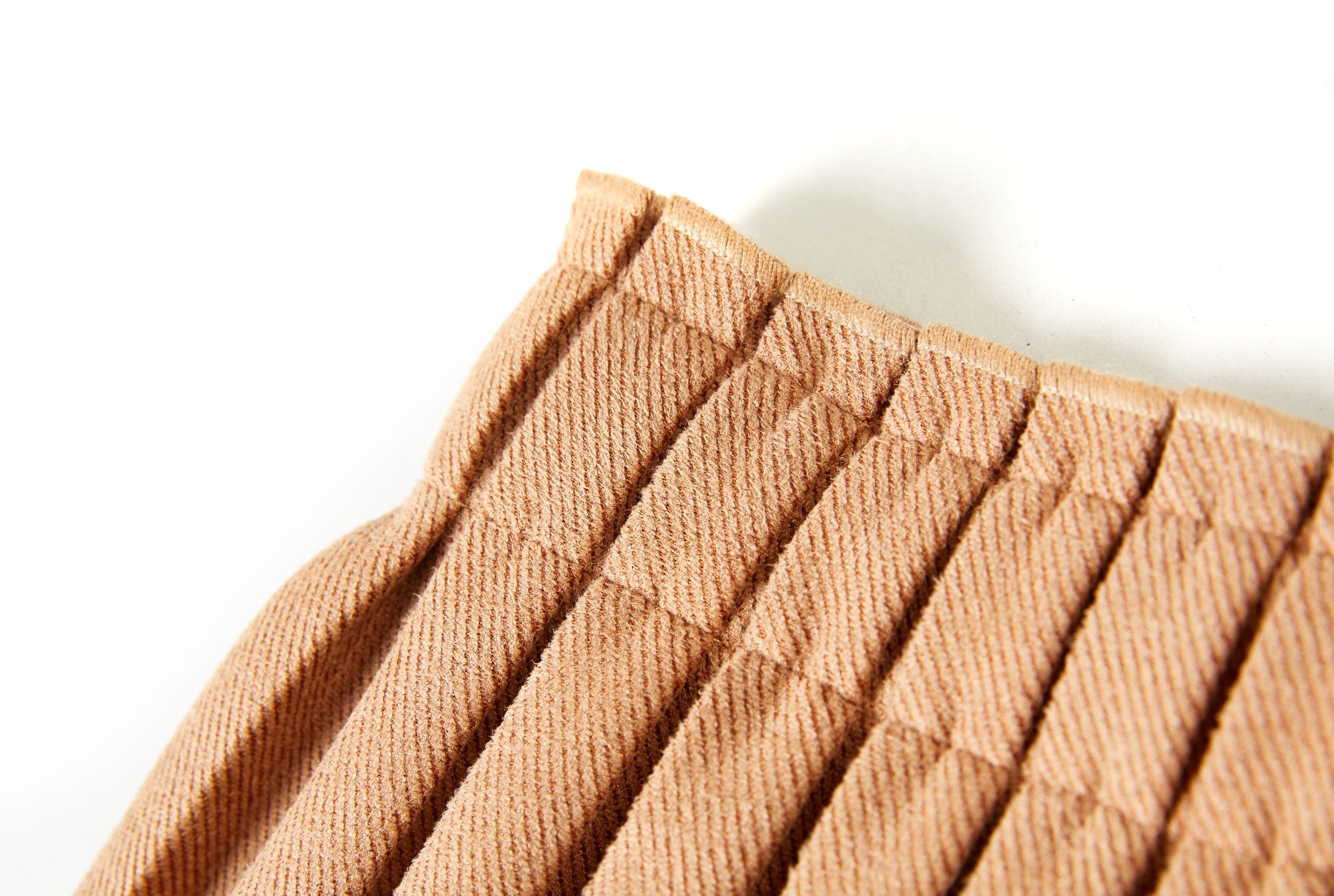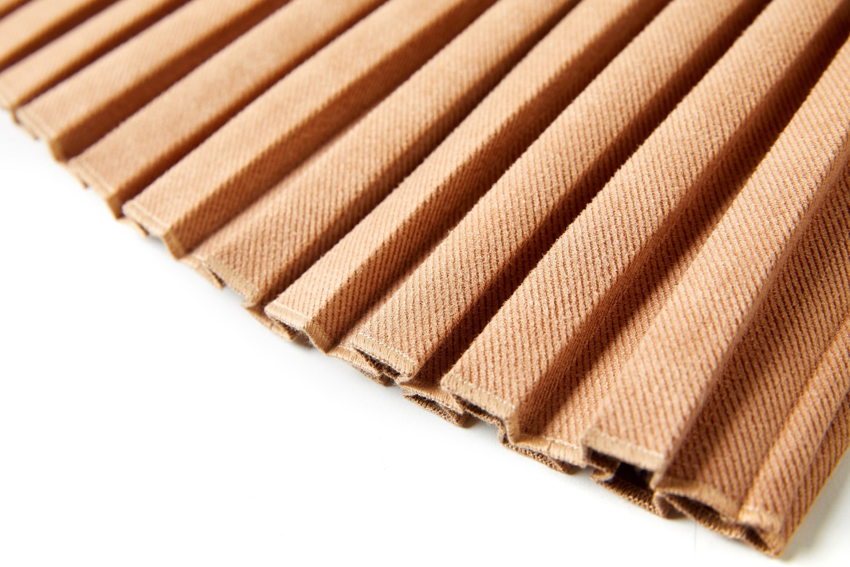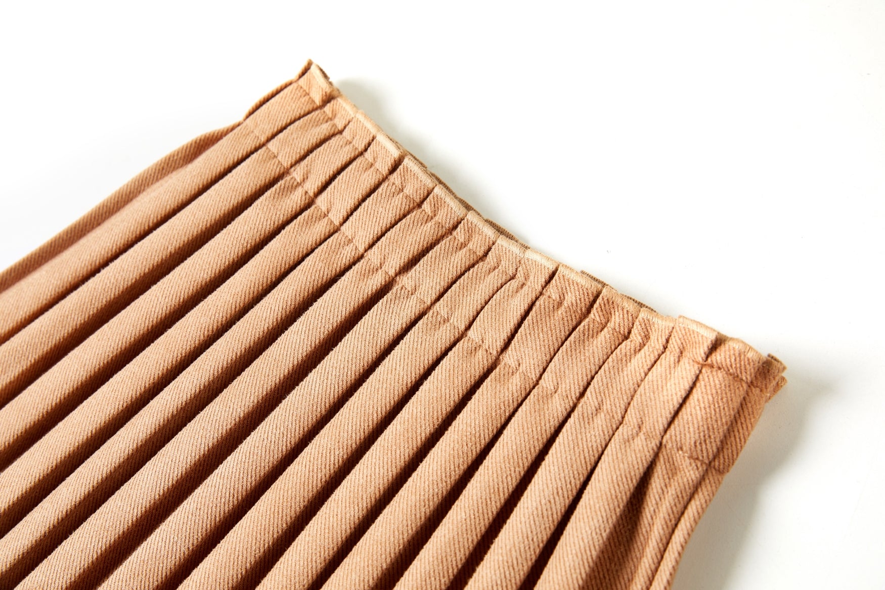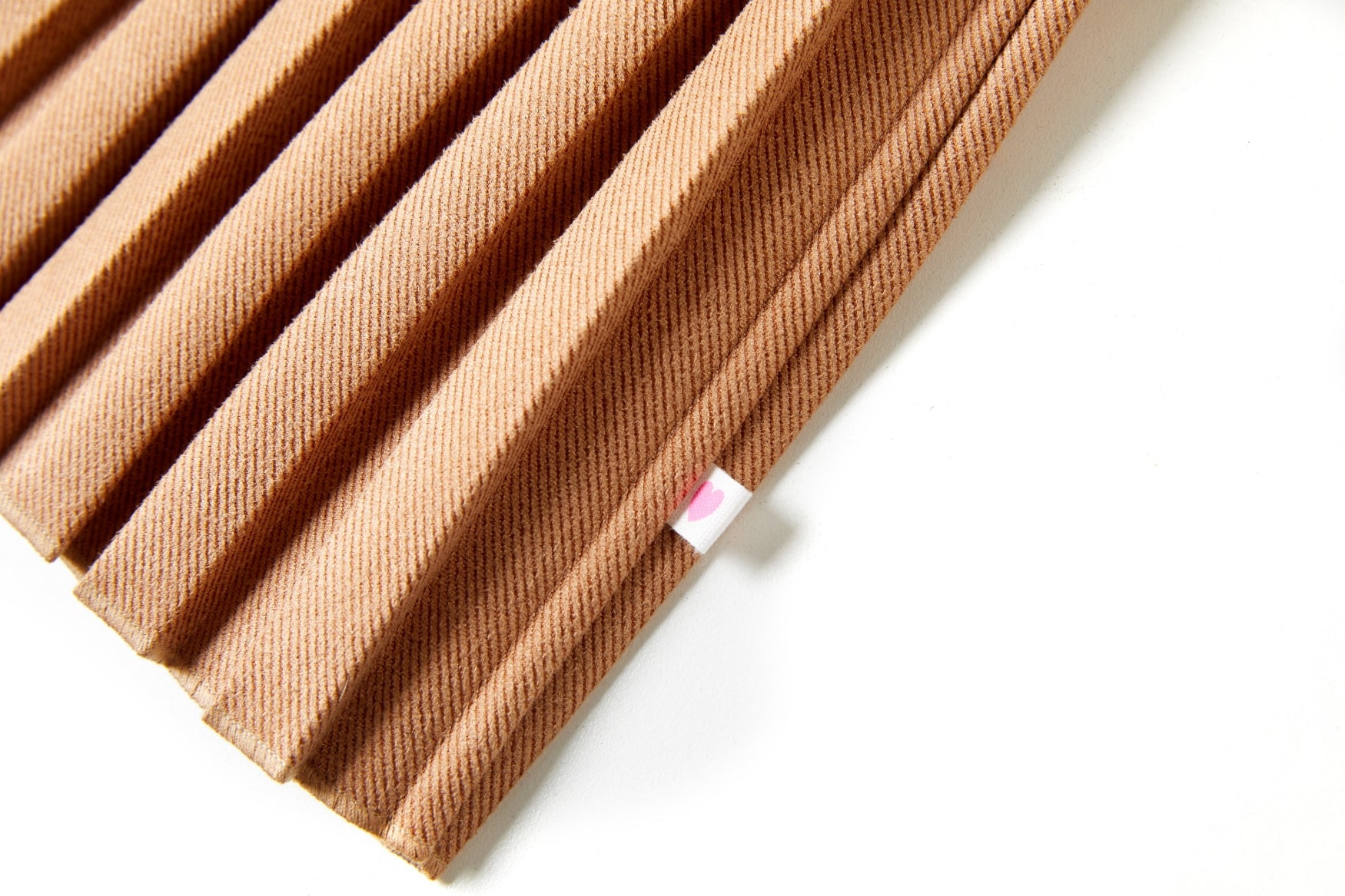 This dark beige pleated skirt has a classic, elegant look thanks to its fine, evenly spaced pleats. The skirt moves beautifully and adds a stylish, playful touch to any outfit. The elastic waistband ensures a comfortable fit, making it perfect for everyday wear or more festive occasions. A timeless piece that pairs easily with sweaters, blouses, or simple tops.