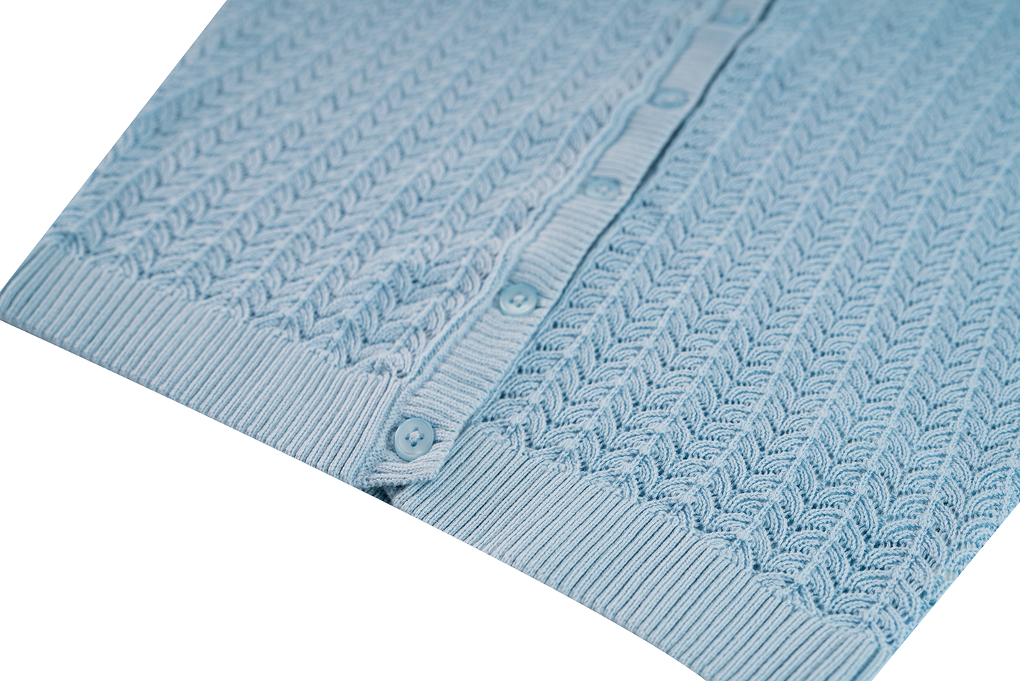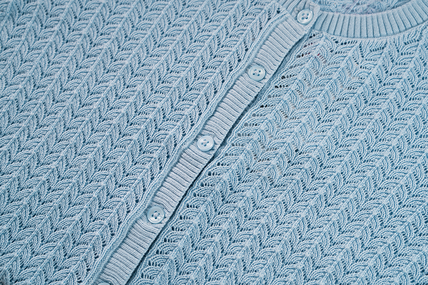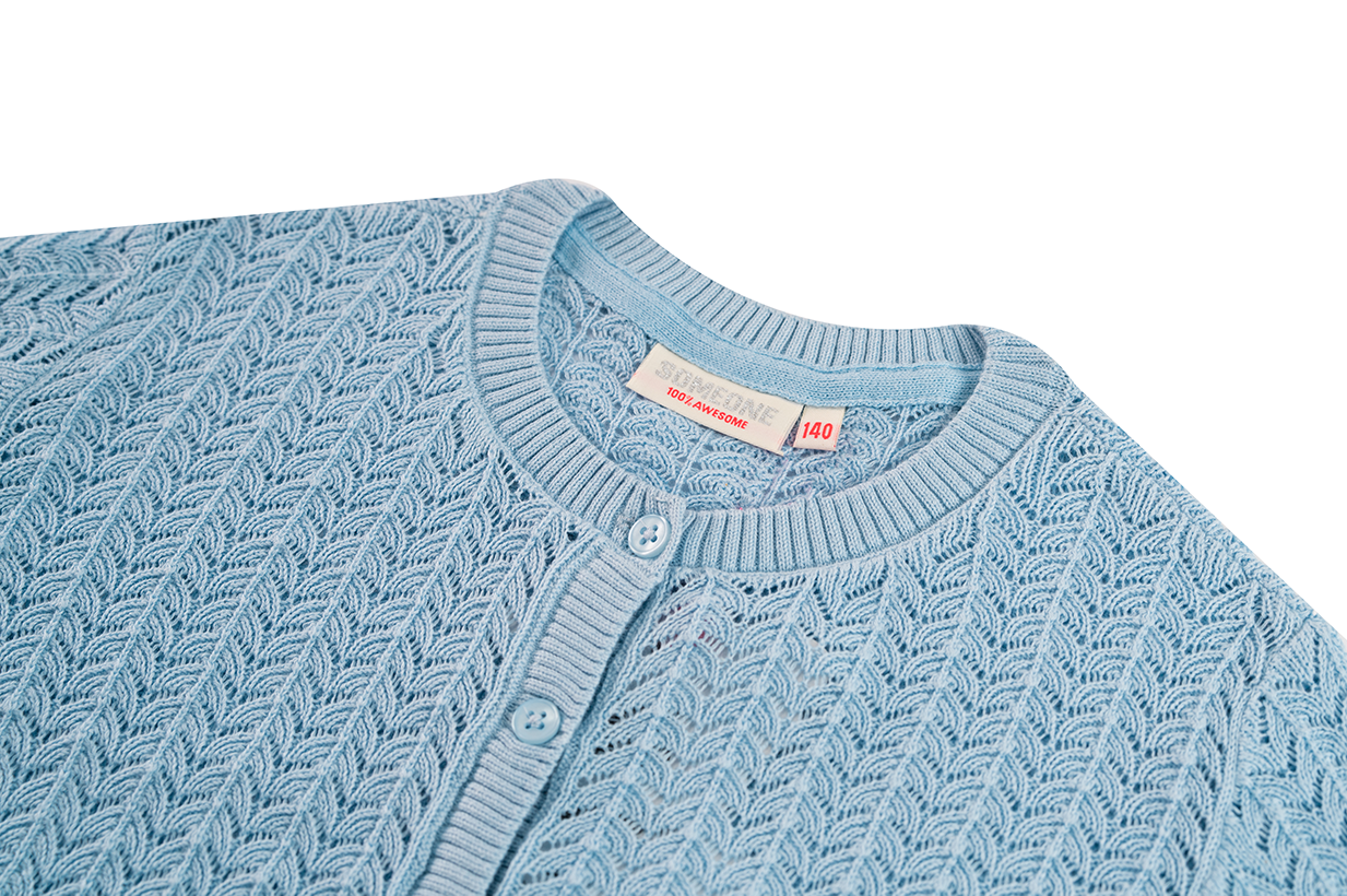 Light blue girls’ cardigan in fine open-knit design with button closure. The airy pattern and classic fit make this cardigan perfect for cooler days or as an extra layer over a dress or T-shirt. A timeless and versatile piece for any wardrobe.