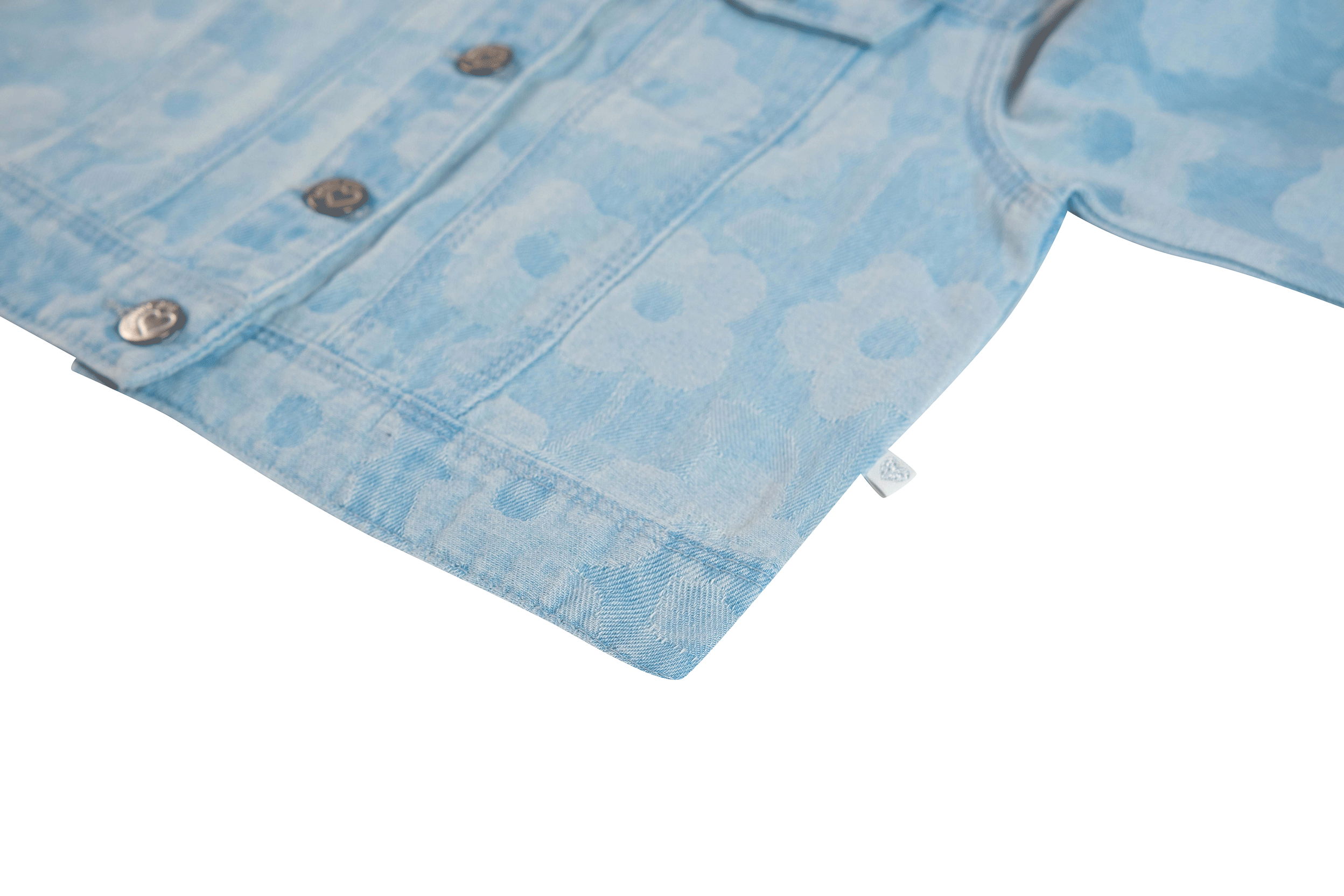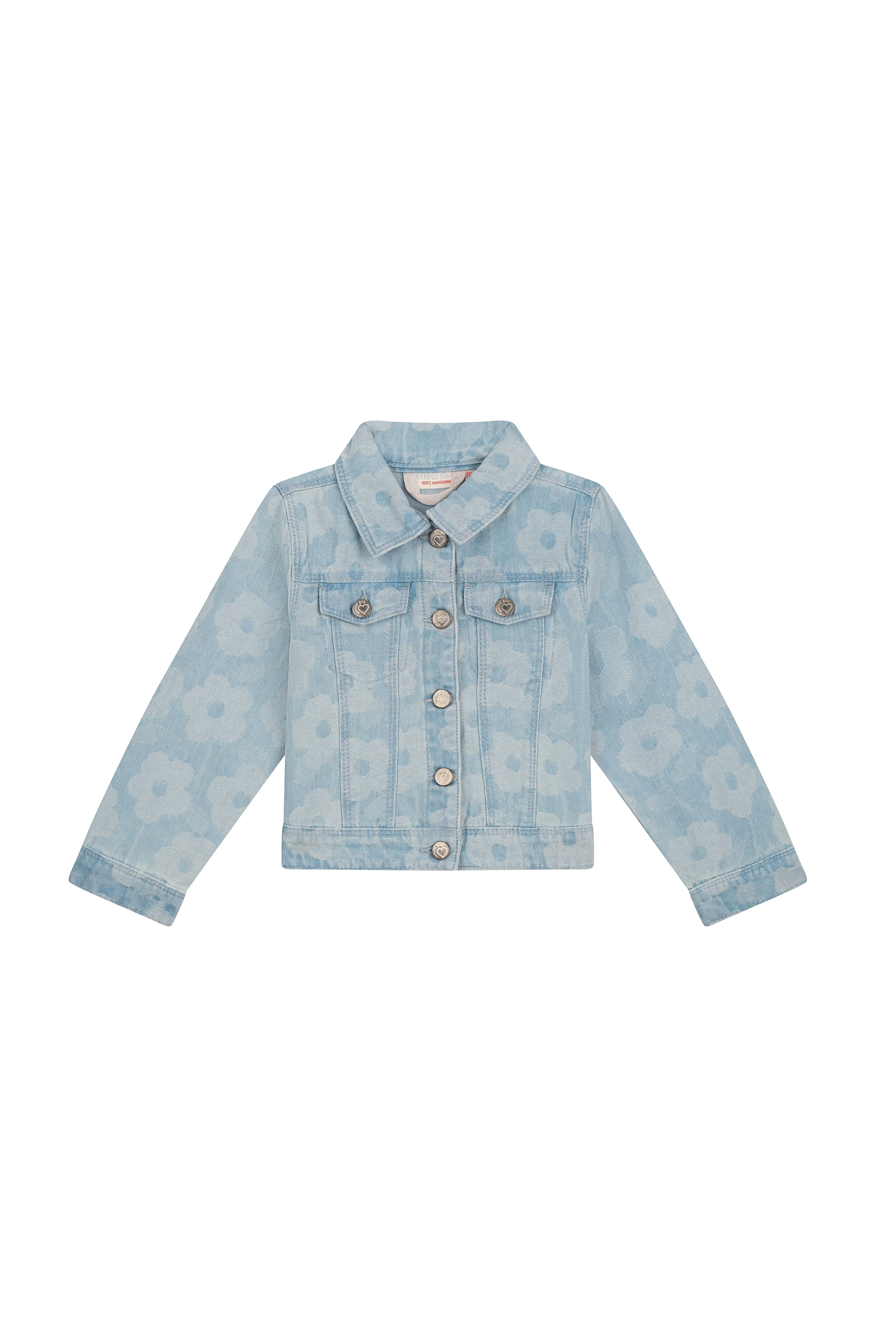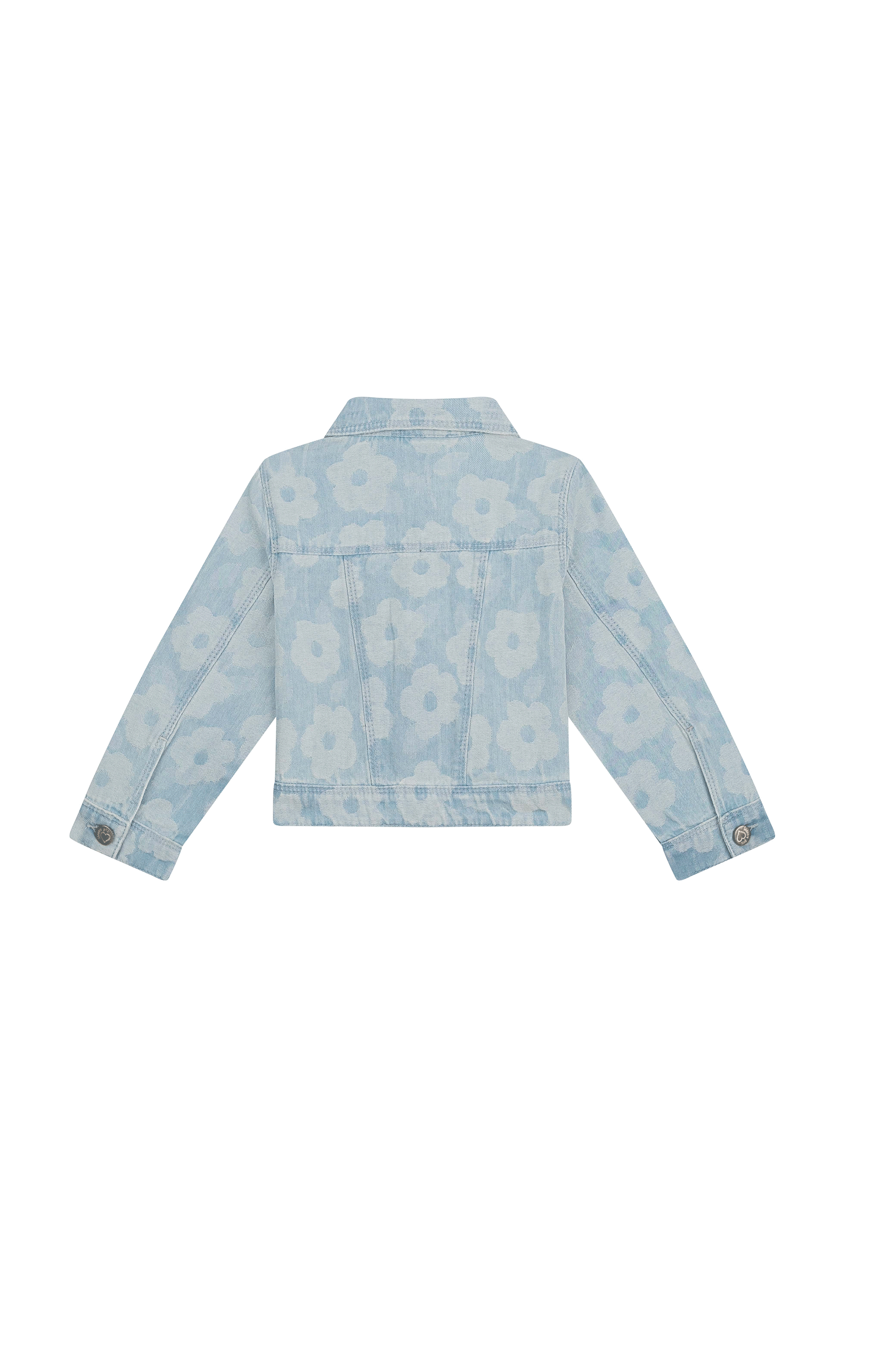 Trendy denim jacket for girls in light blue wash with an all-over flower print. The classic design with button closure and chest pockets is given a playful twist by the cheerful pattern. Perfect to combine with the matching jeans or a colourful summer outfit.