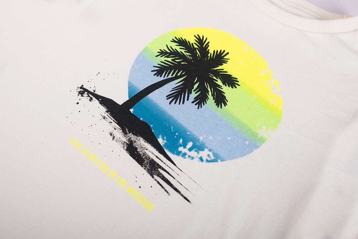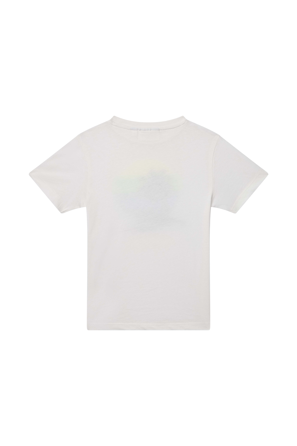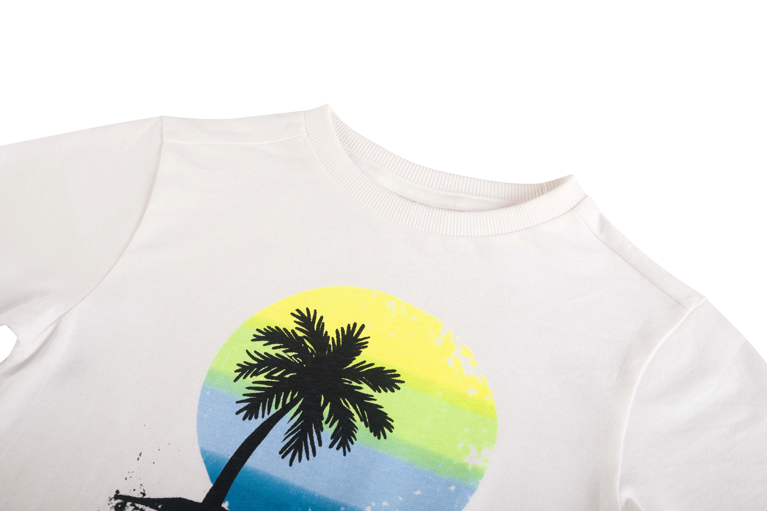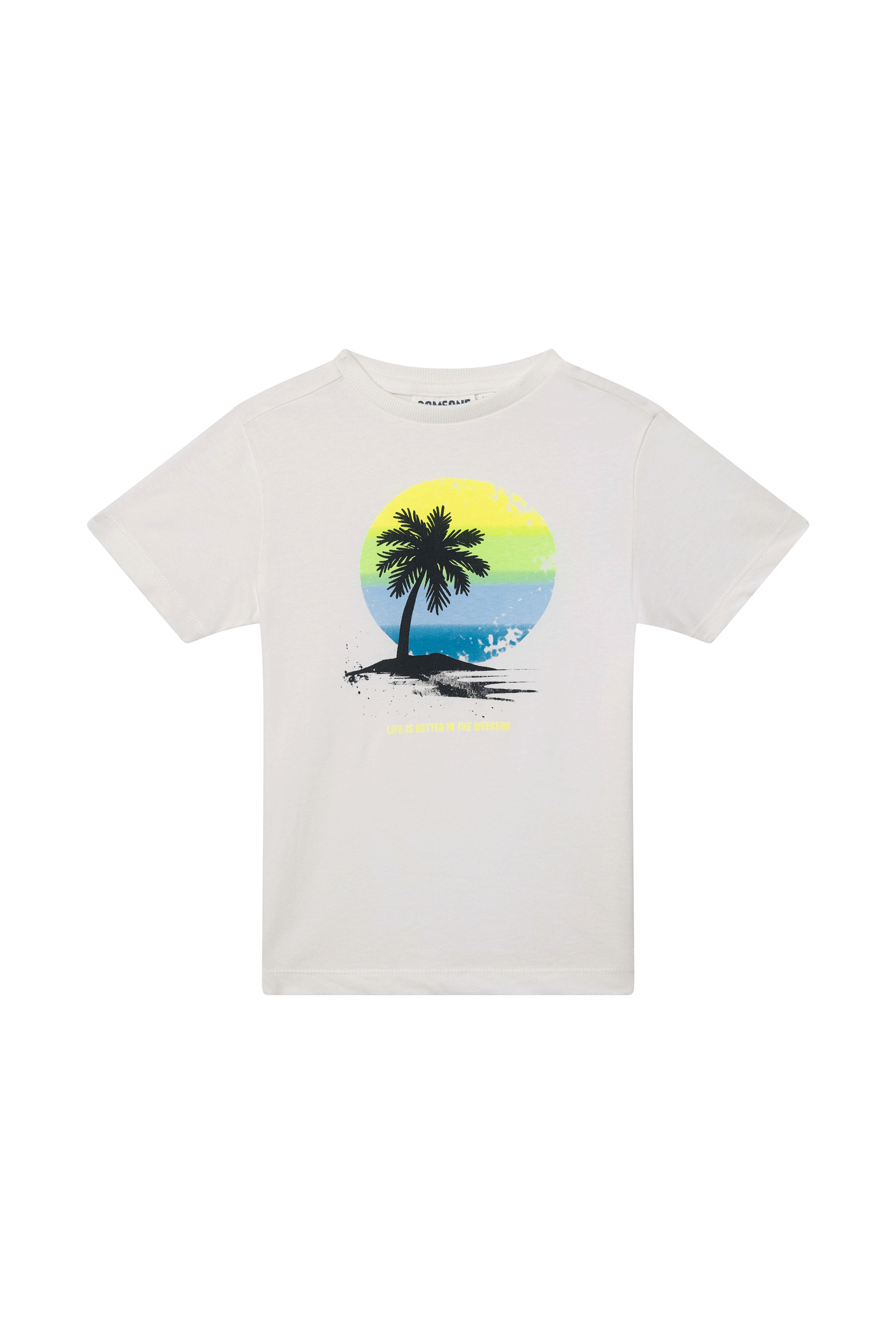 This white boys’ T-shirt brings summer vibes! Featuring a colorful beach print with a palm tree, sun, and sea. Perfect for sunny days or to keep that holiday feeling all year round.