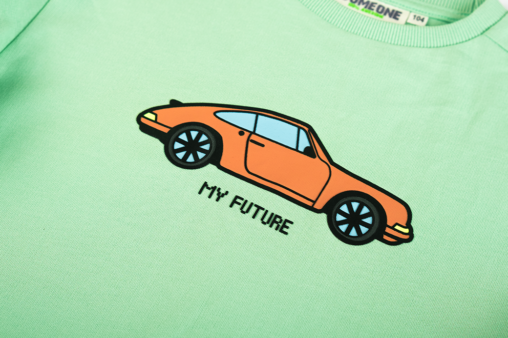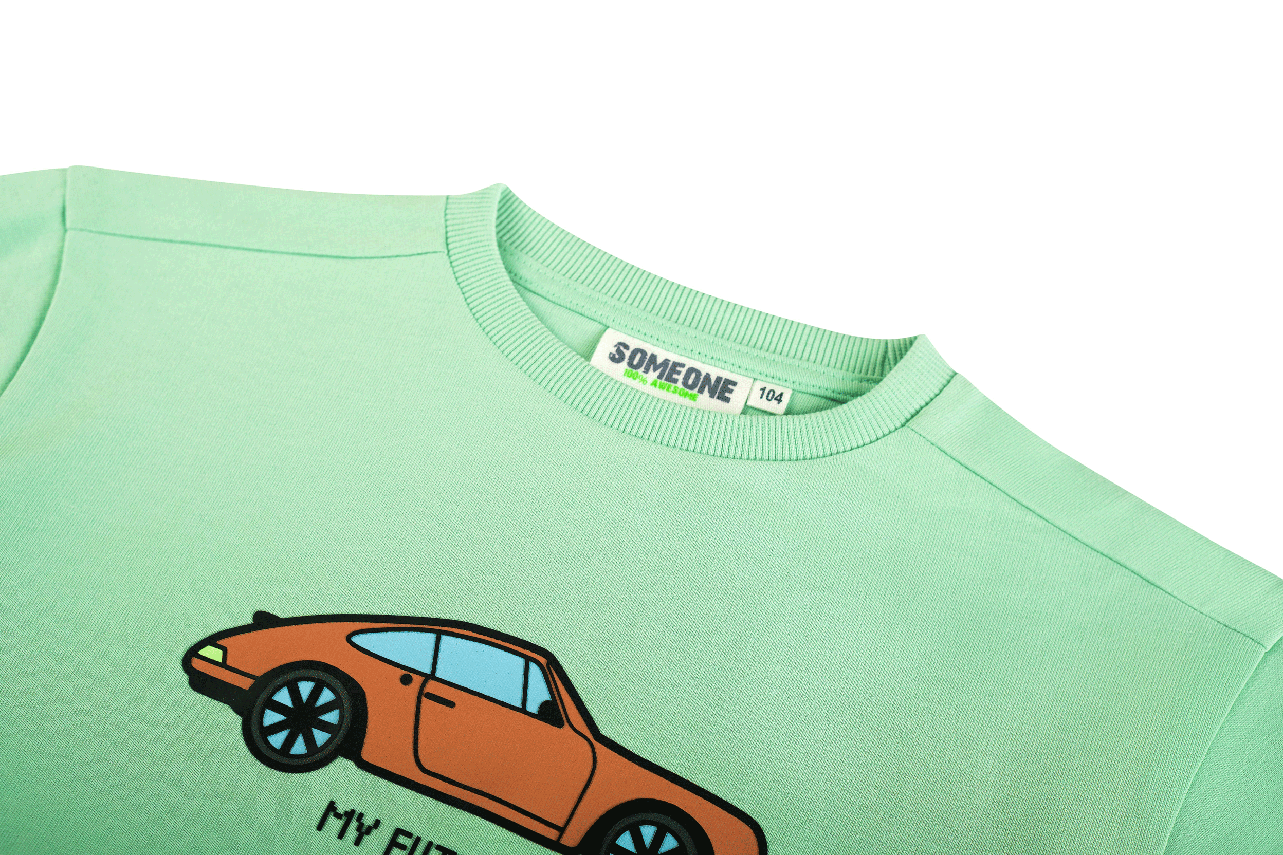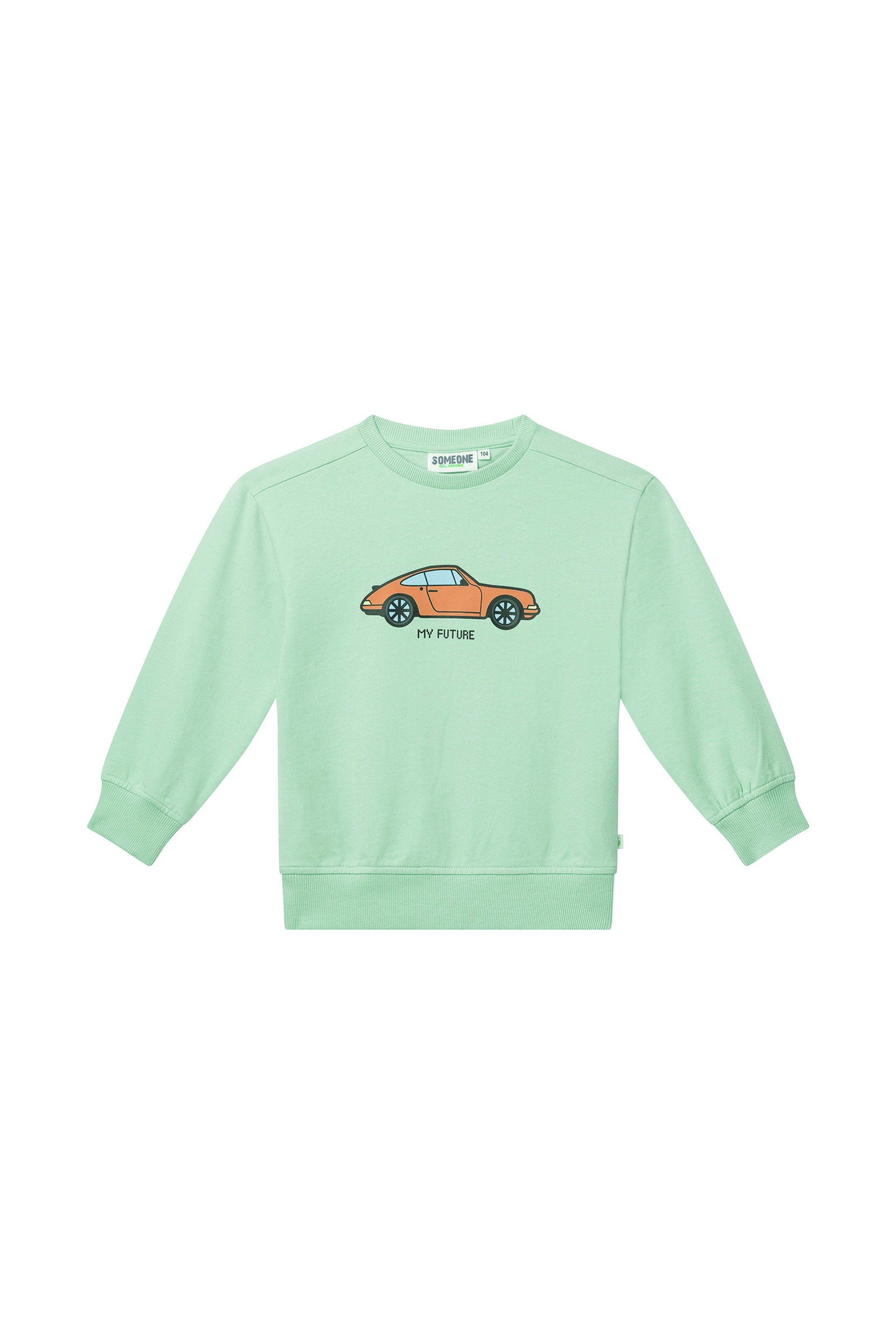 This mint green boys’ sweater is a real eye-catcher. The front features a bold orange car with the text "My Future". Designed with long sleeves, a crew neck and comfortable ribbed edges. Perfect for boys who love a sporty look.