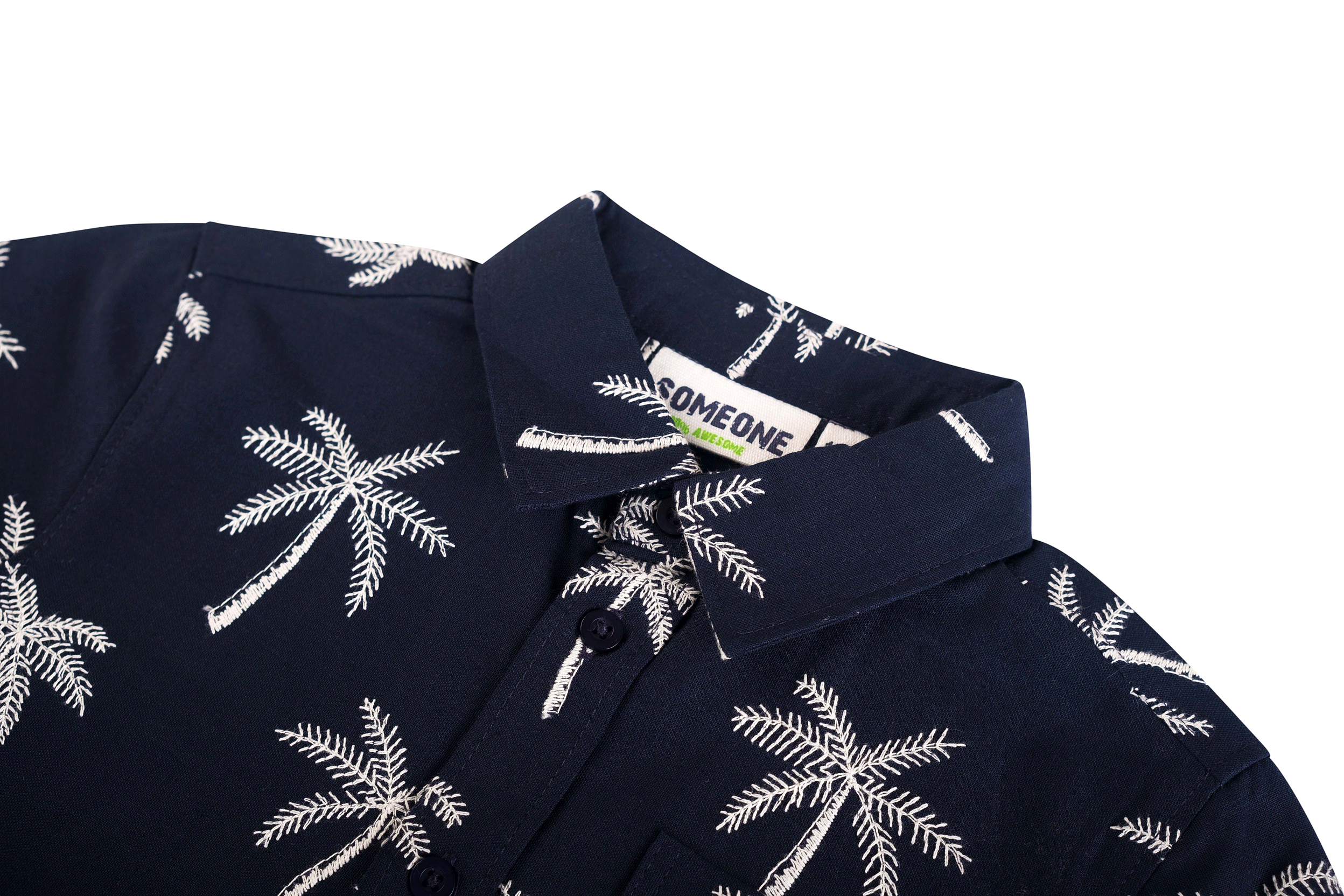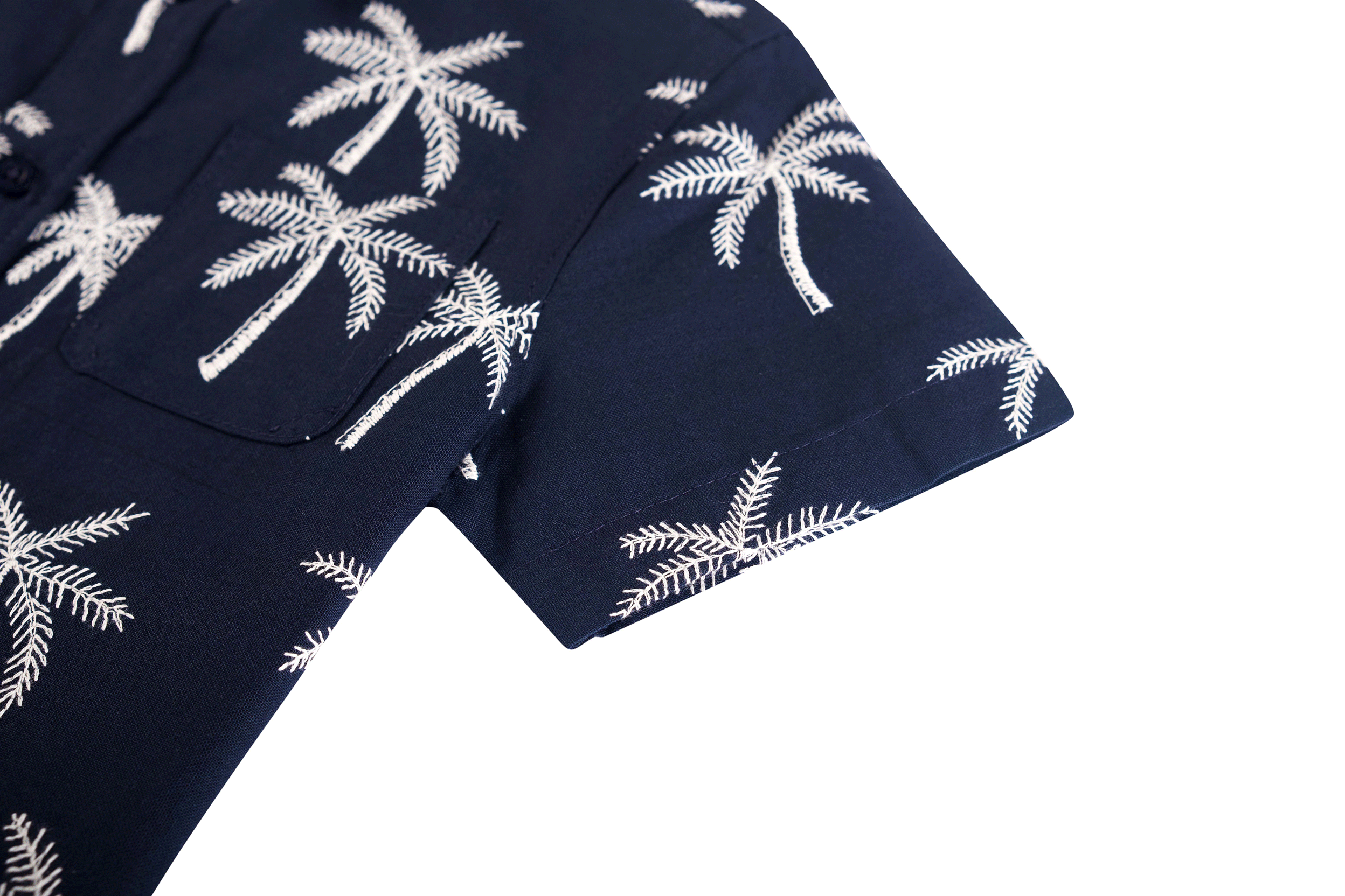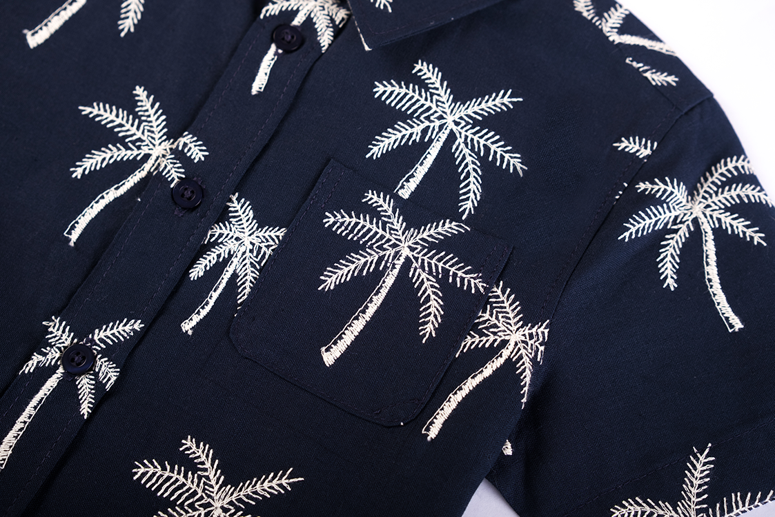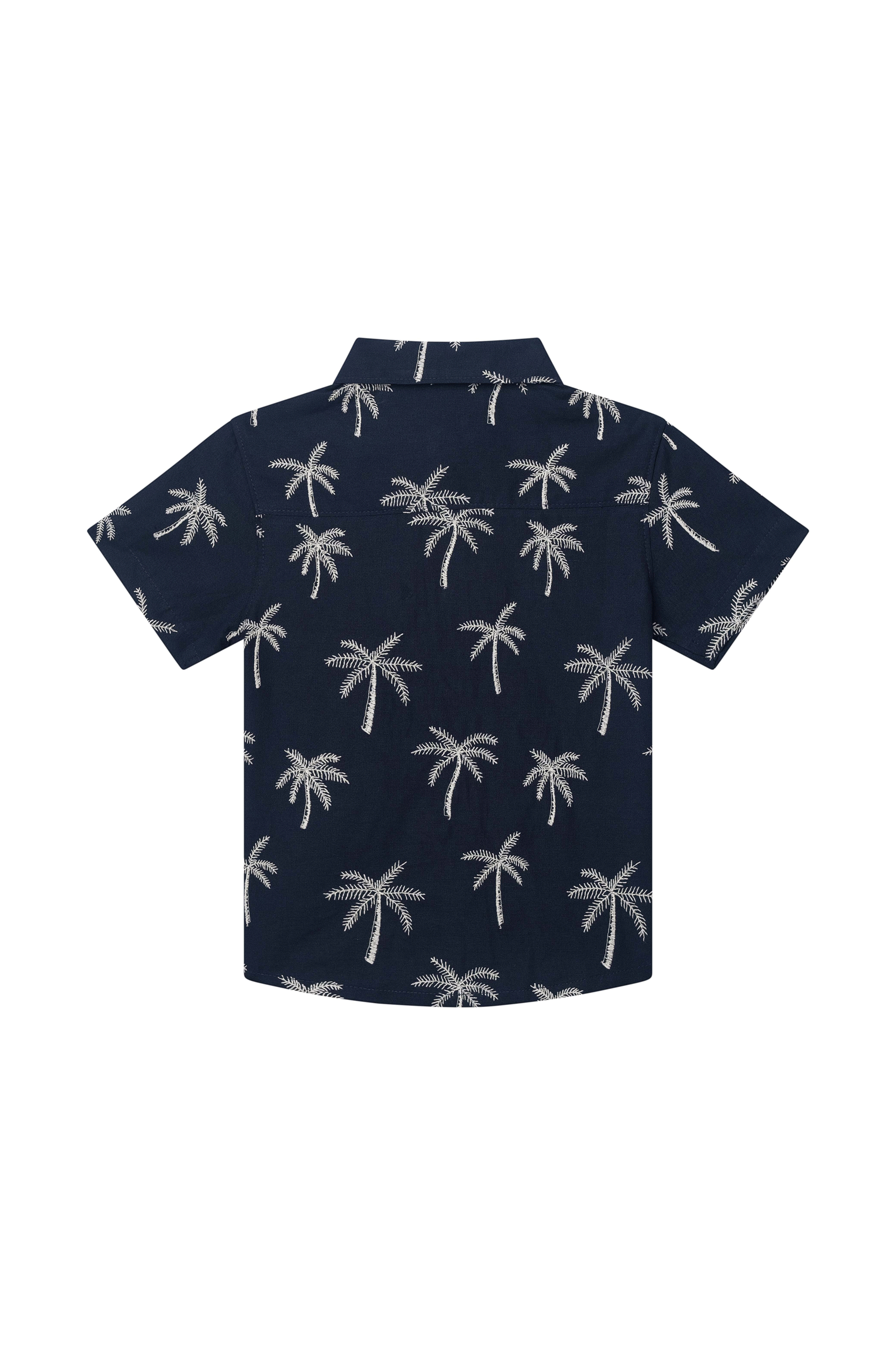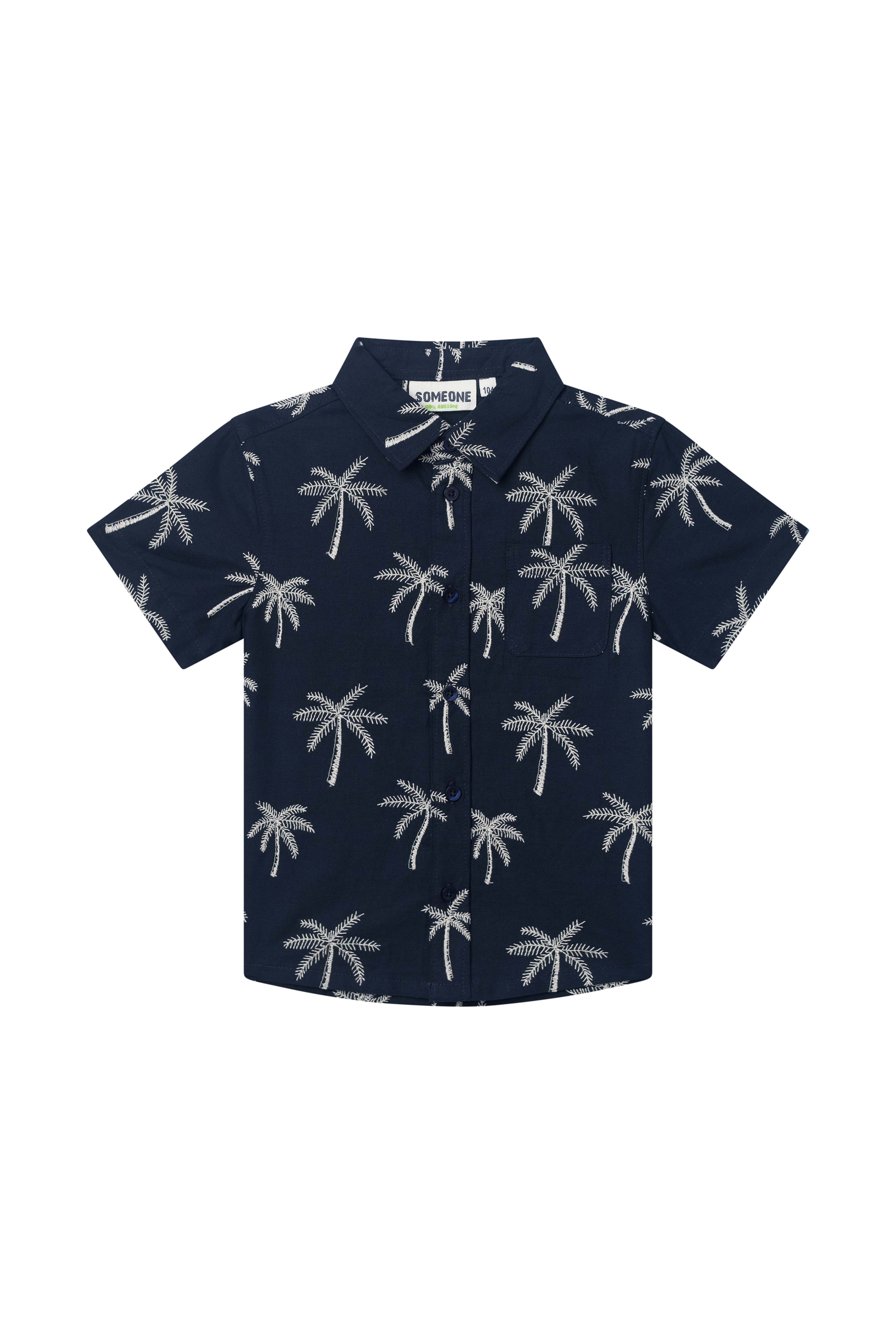 This navy boys’ short-sleeved shirt features a summery all-over print of white palm trees. With a button closure and chest pocket, it is both stylish and breathable – perfect for warm days, a party, or a holiday outing.