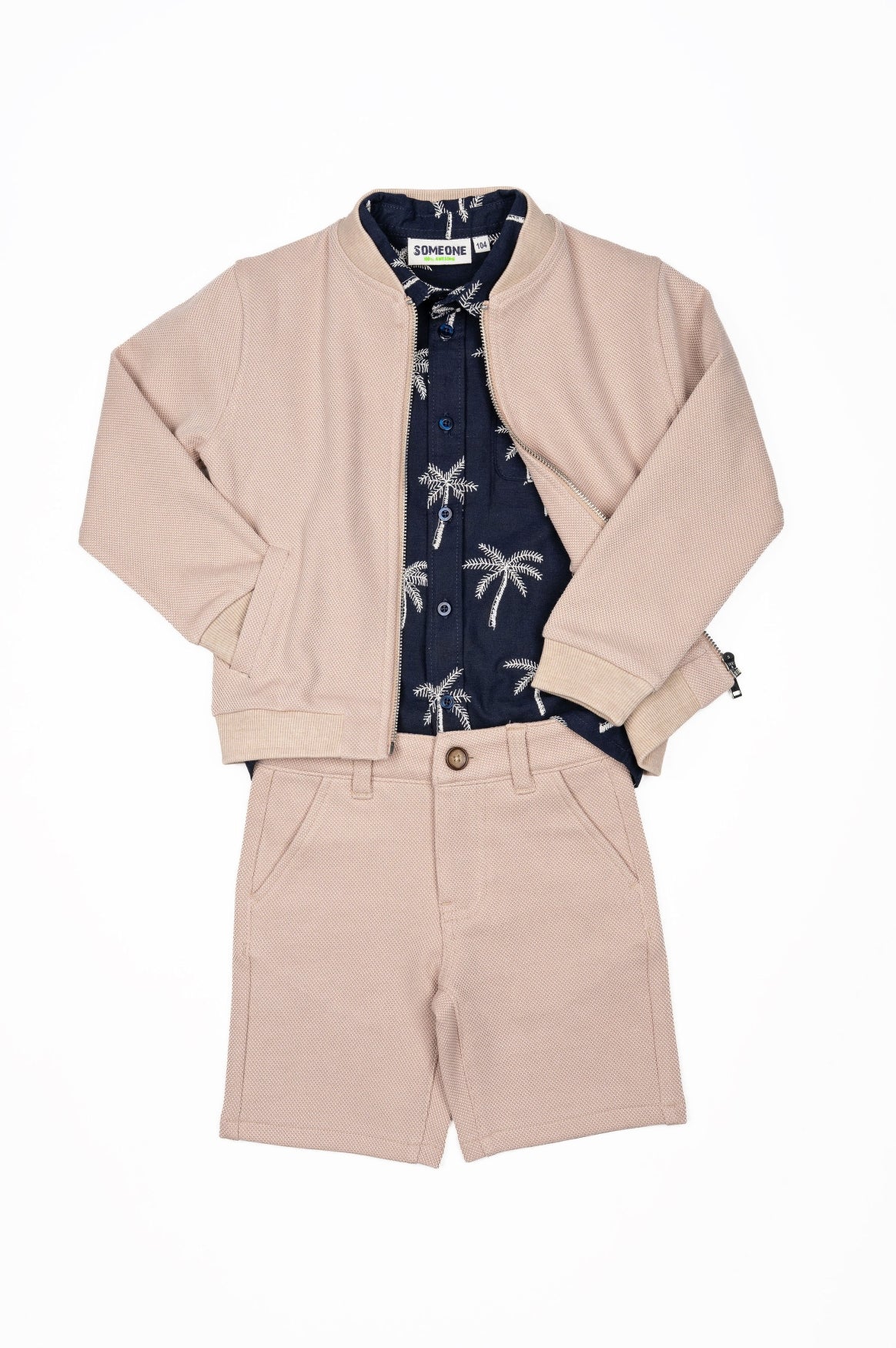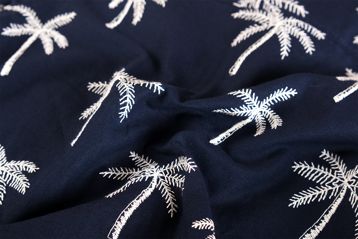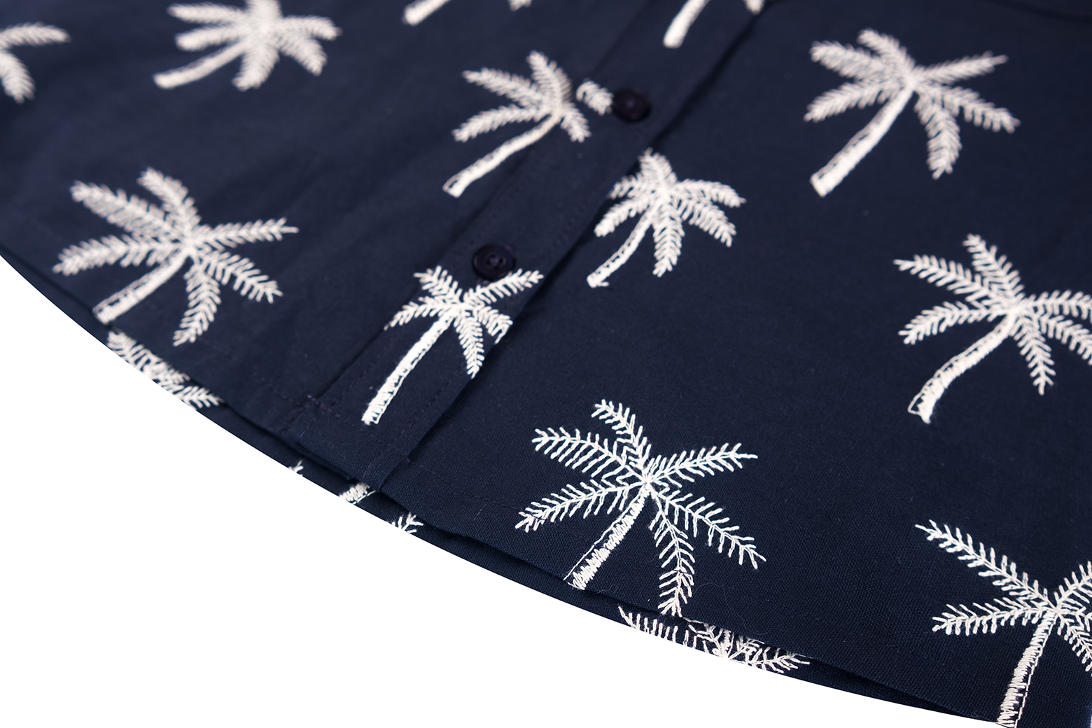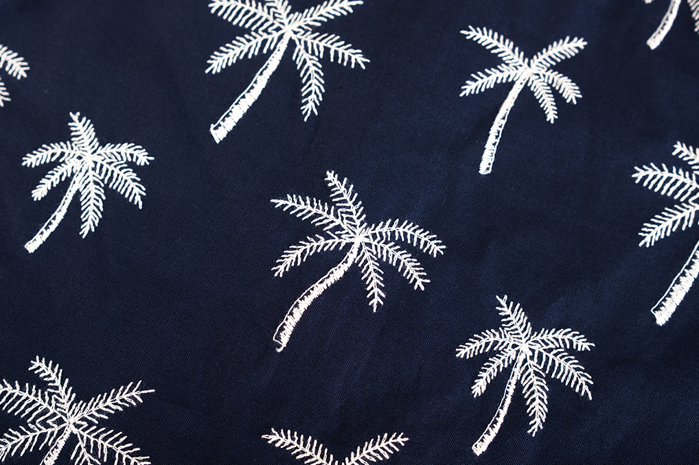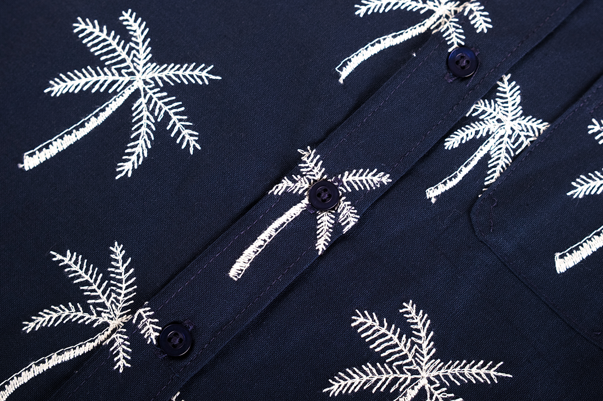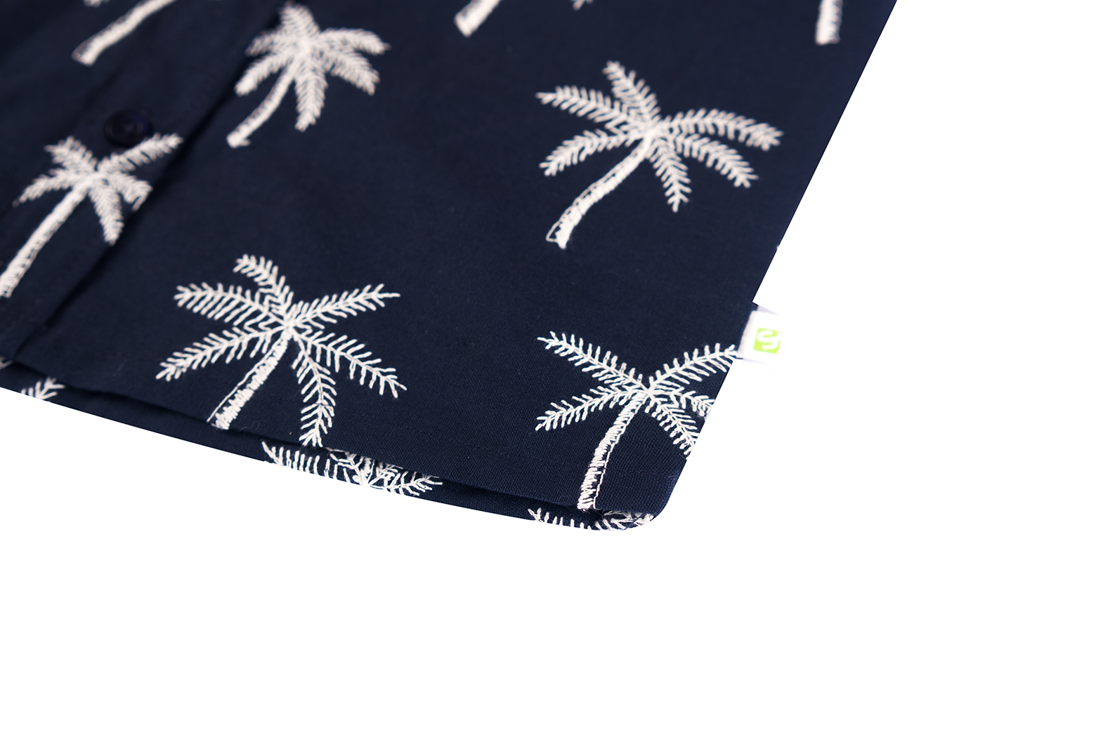 This navy boys’ short-sleeved shirt features a summery all-over print of white palm trees. With a button closure and chest pocket, it is both stylish and breathable – perfect for warm days, a party, or a holiday outing.