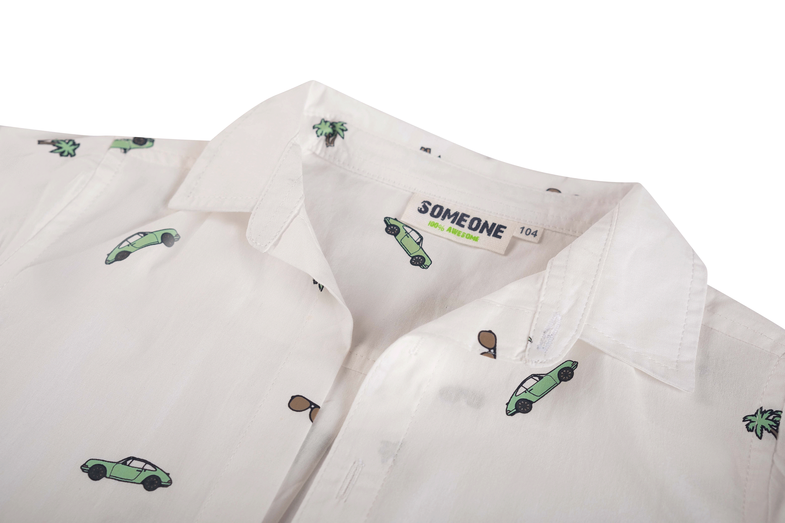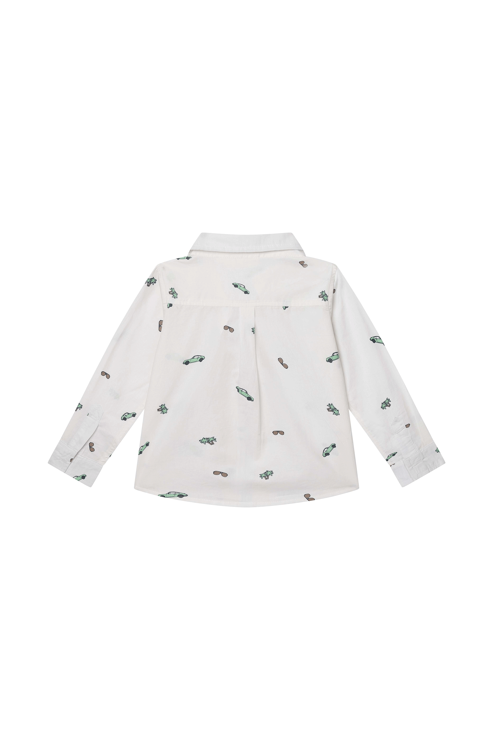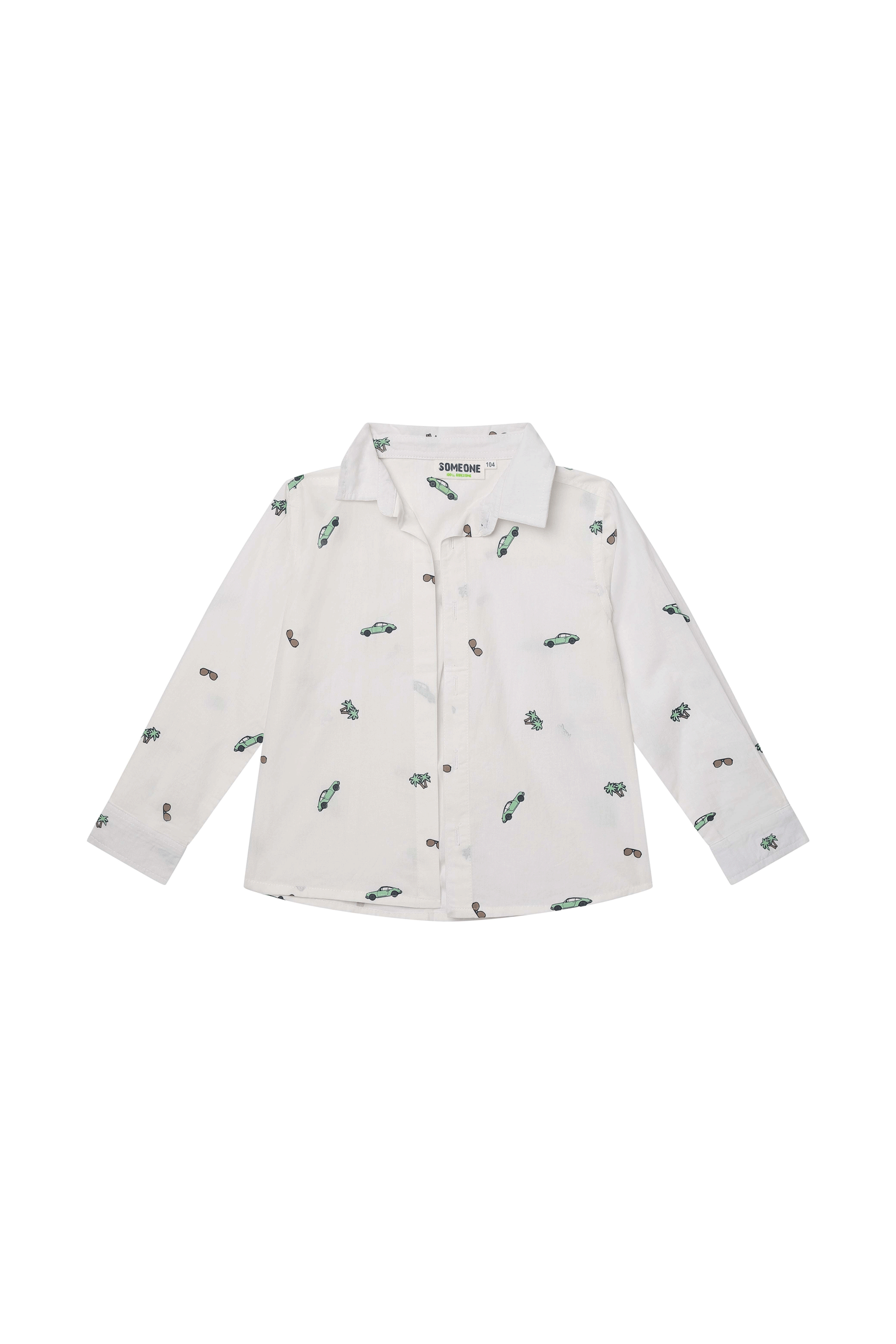 This white boys’ long-sleeved shirt features a fun all-over print with cars, sunglasses, and palm trees. Designed with a button closure and classic collar, it’s perfect for a summer day, a party, or a formal occasion with a playful touch.