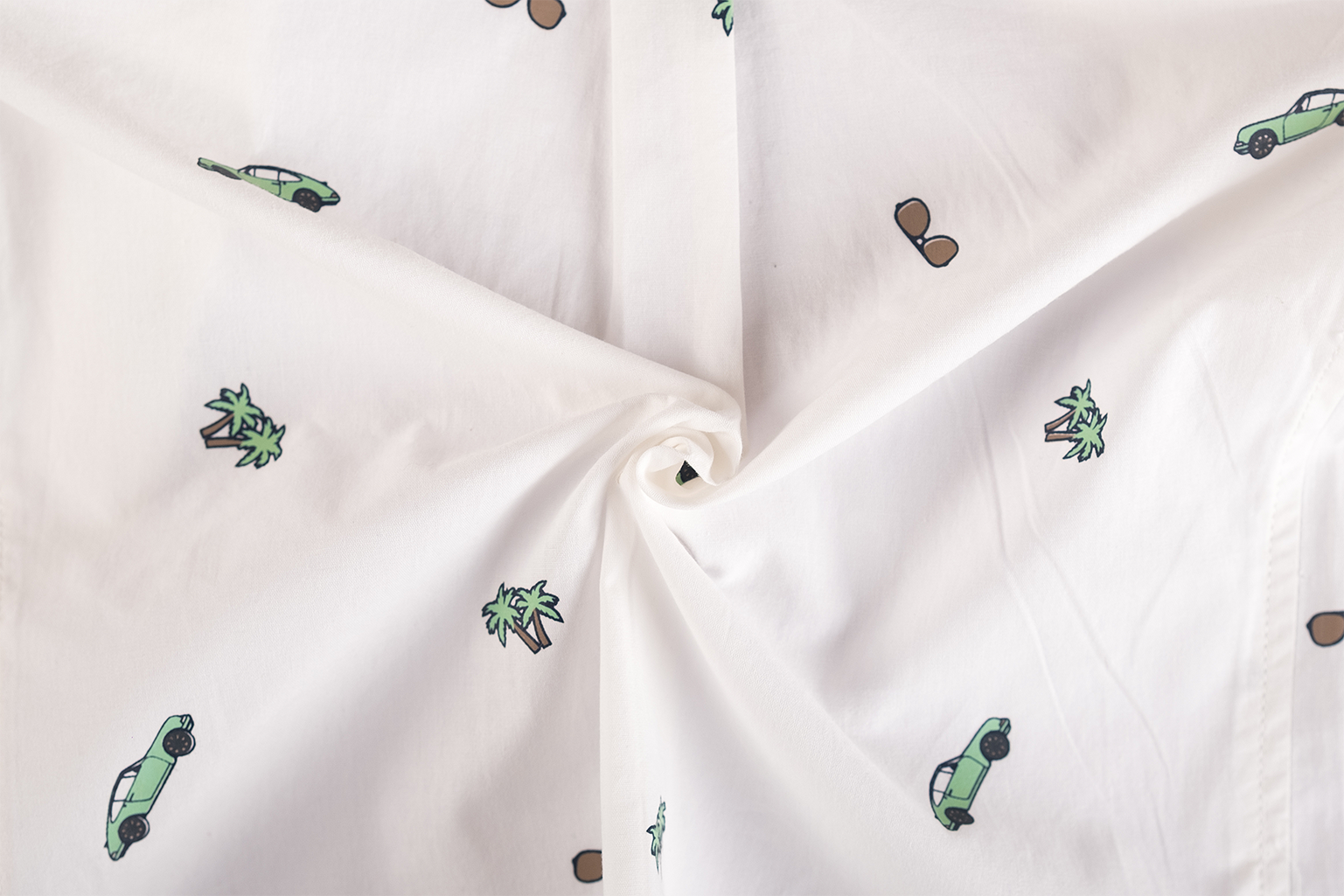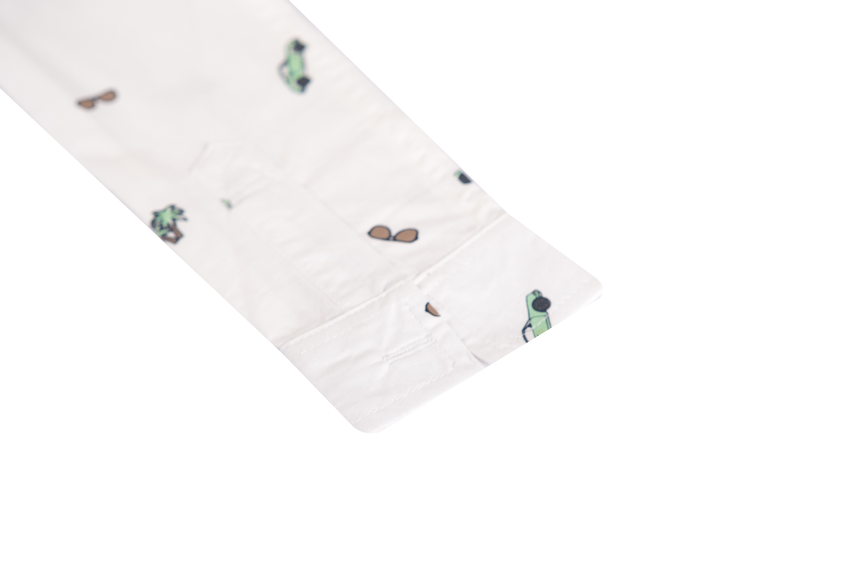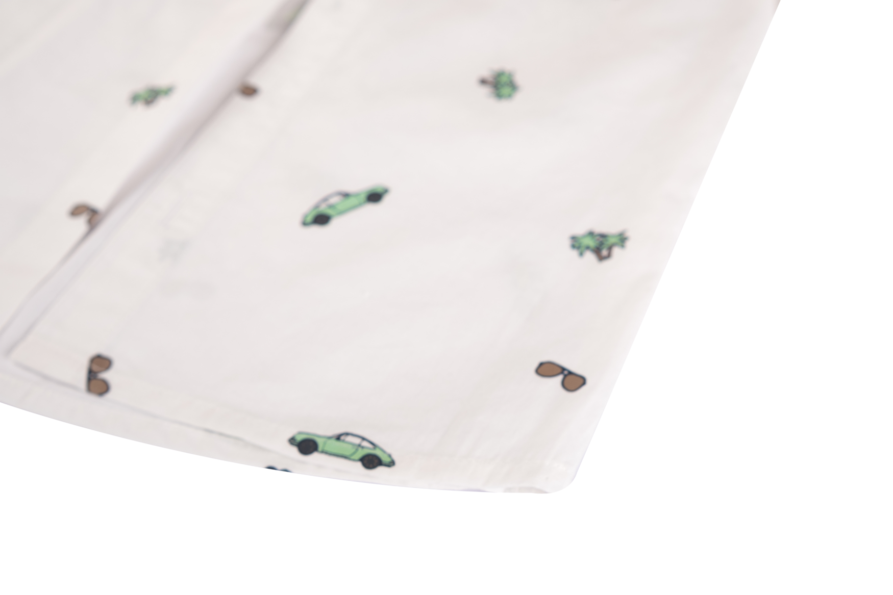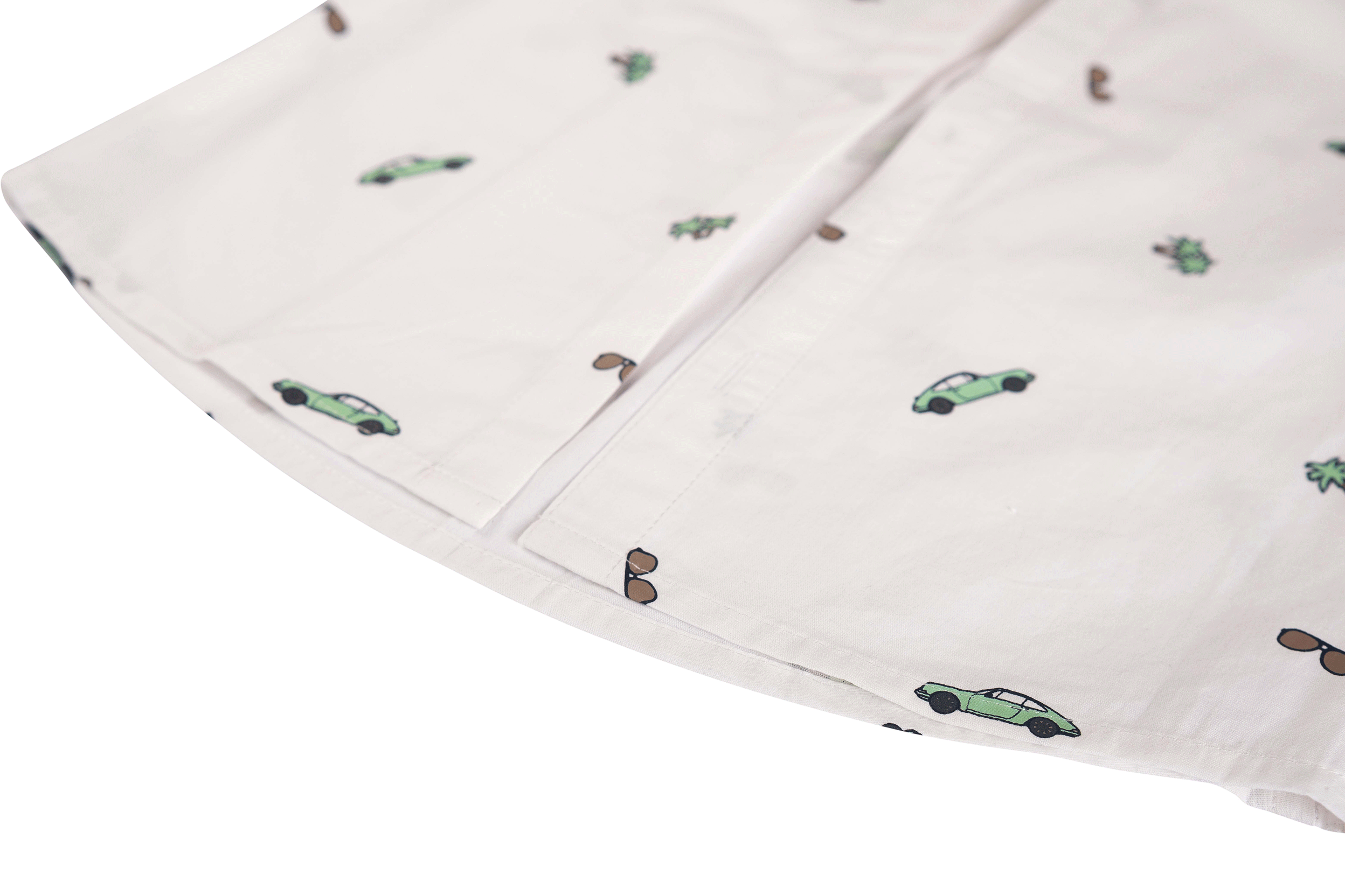 This white boys’ long-sleeved shirt features a fun all-over print with cars, sunglasses, and palm trees. Designed with a button closure and classic collar, it’s perfect for a summer day, a party, or a formal occasion with a playful touch.
