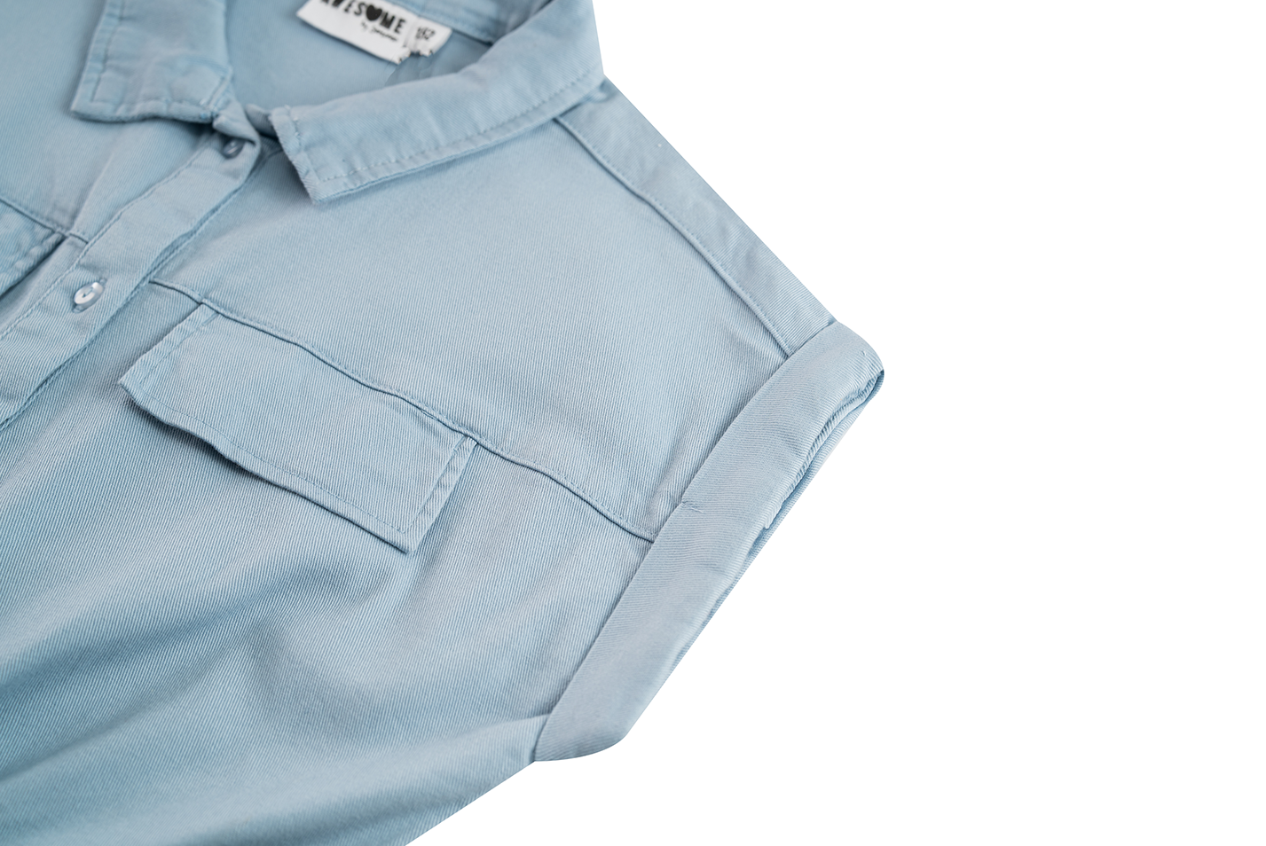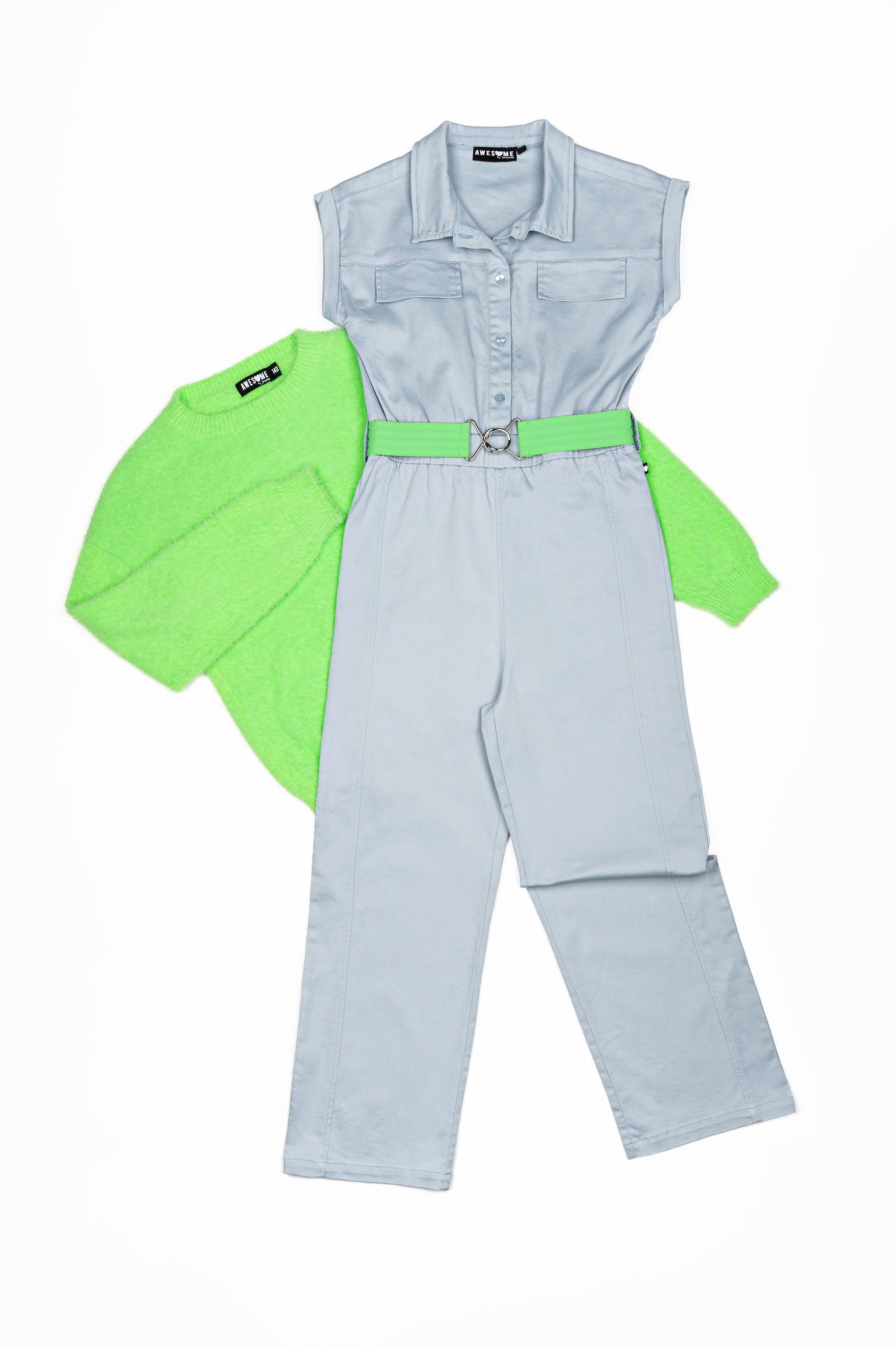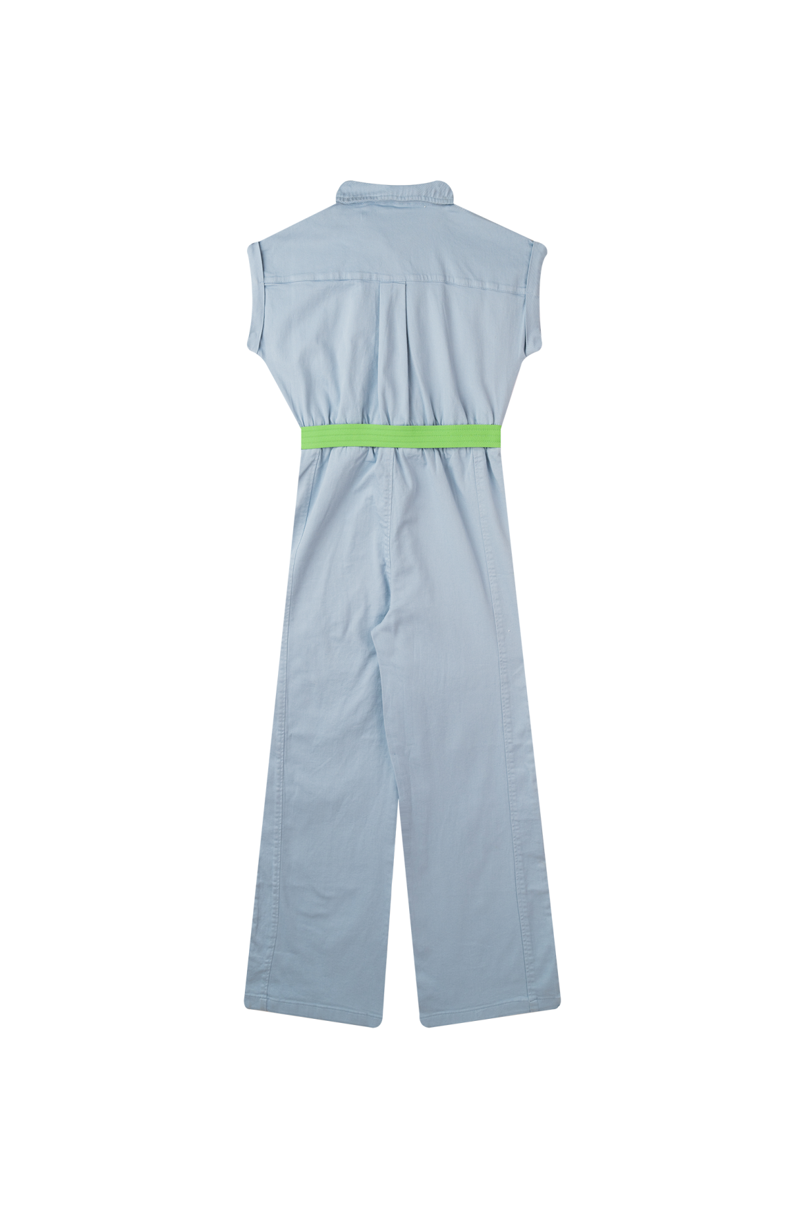 Trendy girls’ jumpsuit in light blue denim look with button closure and chest pockets. The playful bright green belt adds a fresh and modern touch. With its comfortable fit and wide legs, this jumpsuit is perfect for summer days and festive occasions.