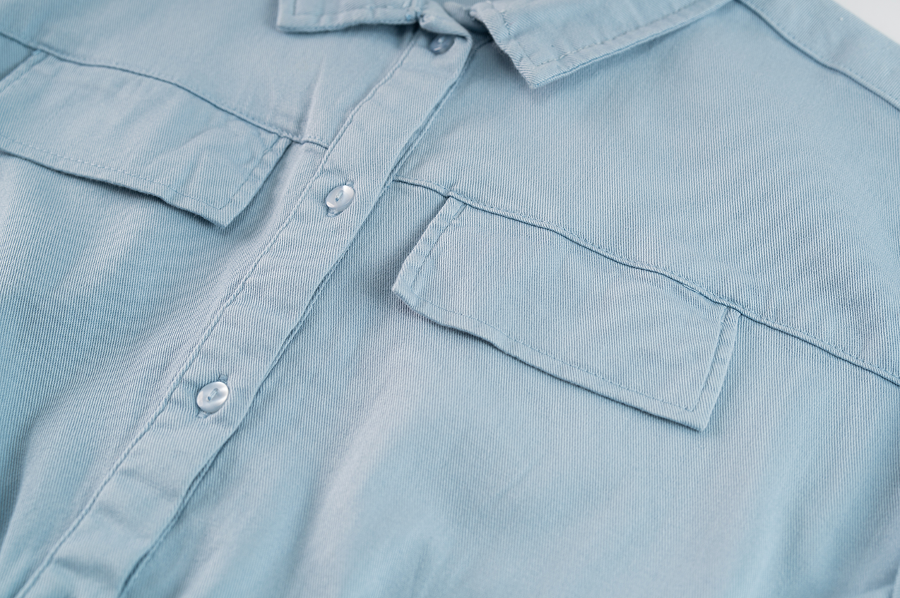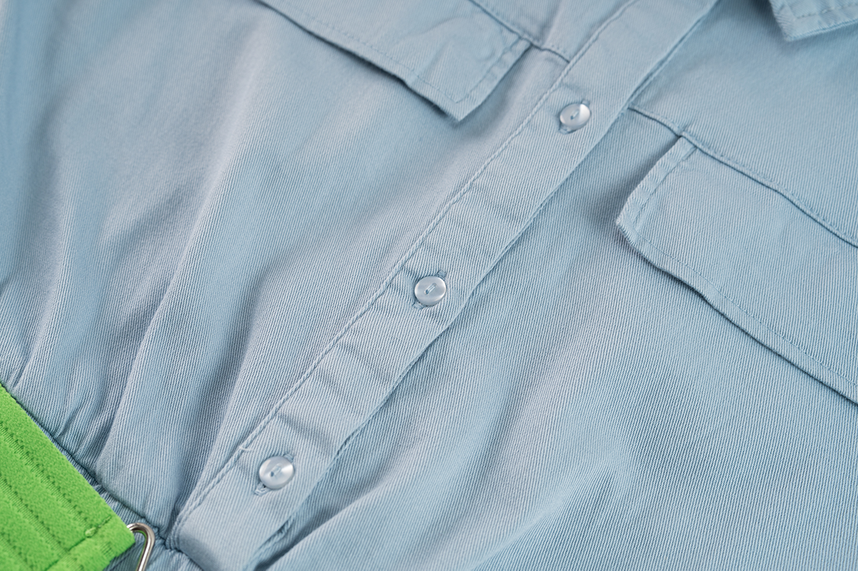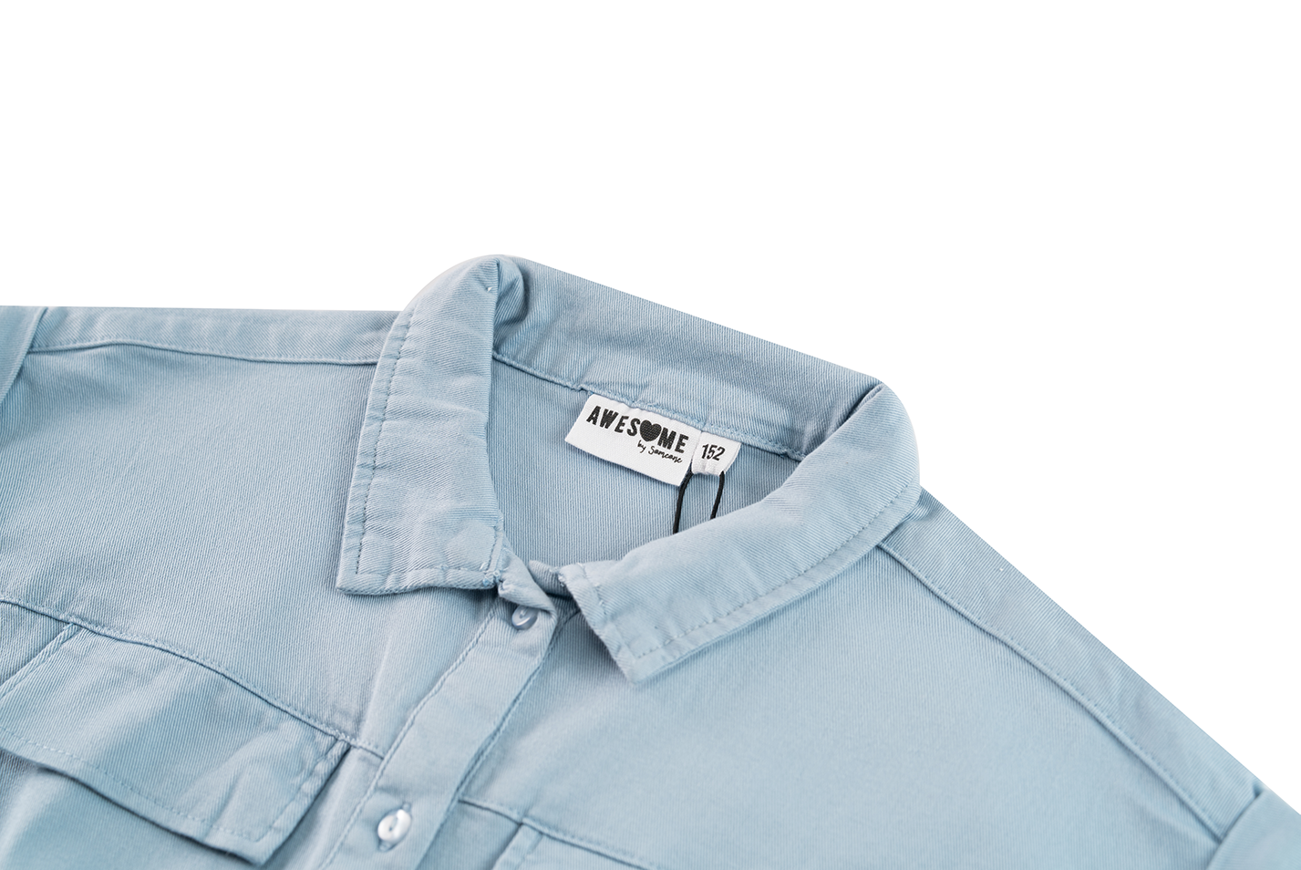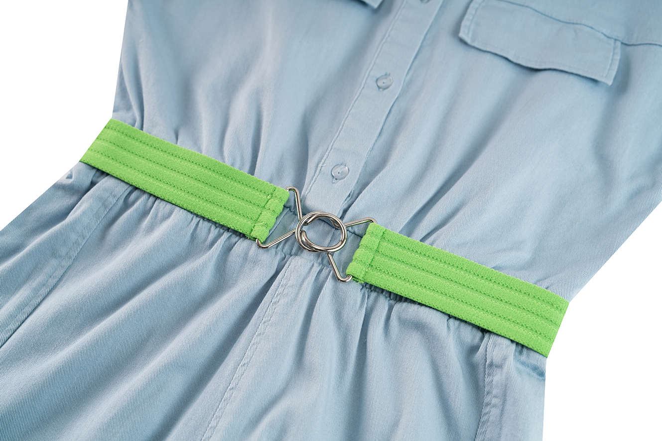 Trendy girls’ jumpsuit in light blue denim look with button closure and chest pockets. The playful bright green belt adds a fresh and modern touch. With its comfortable fit and wide legs, this jumpsuit is perfect for summer days and festive occasions.