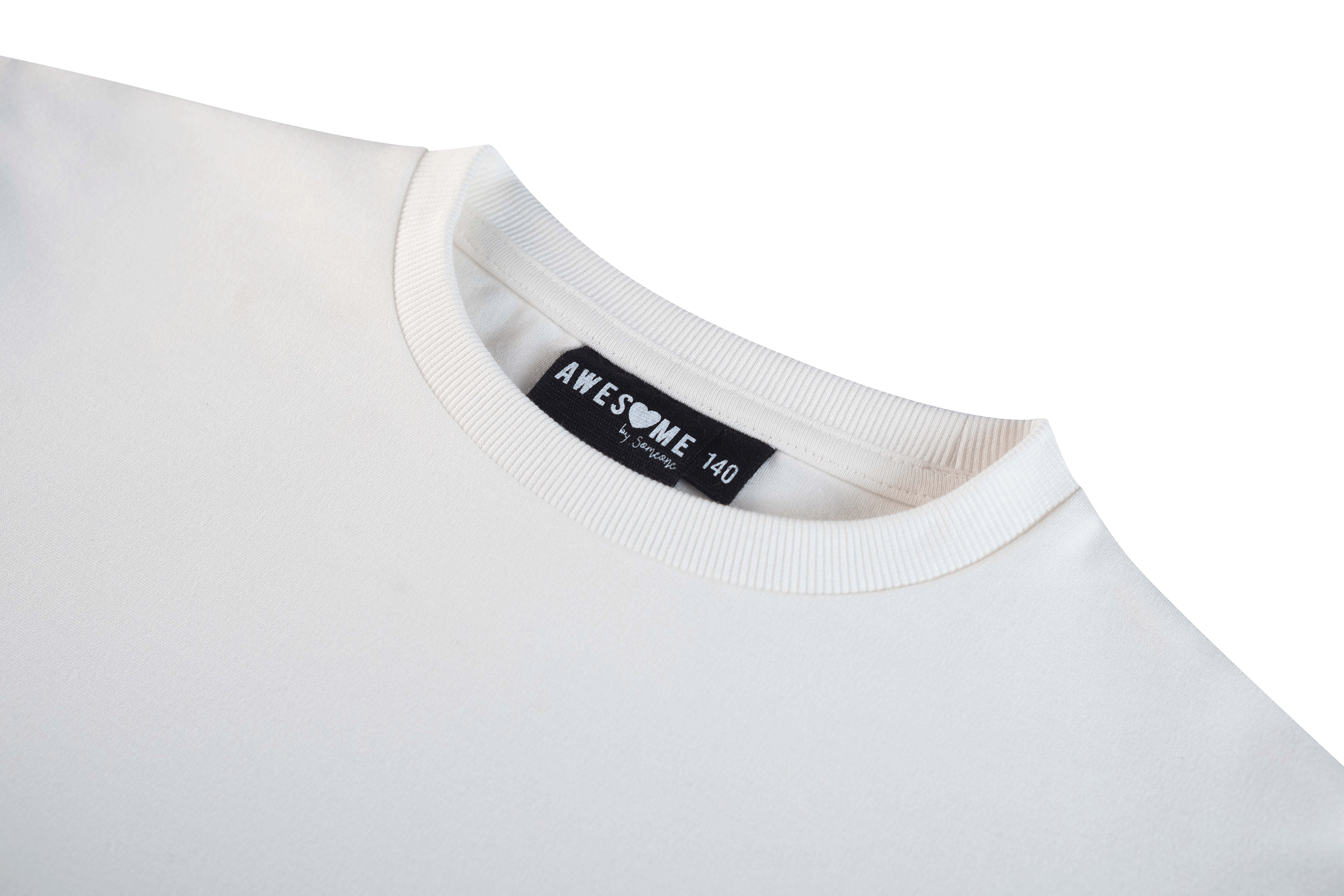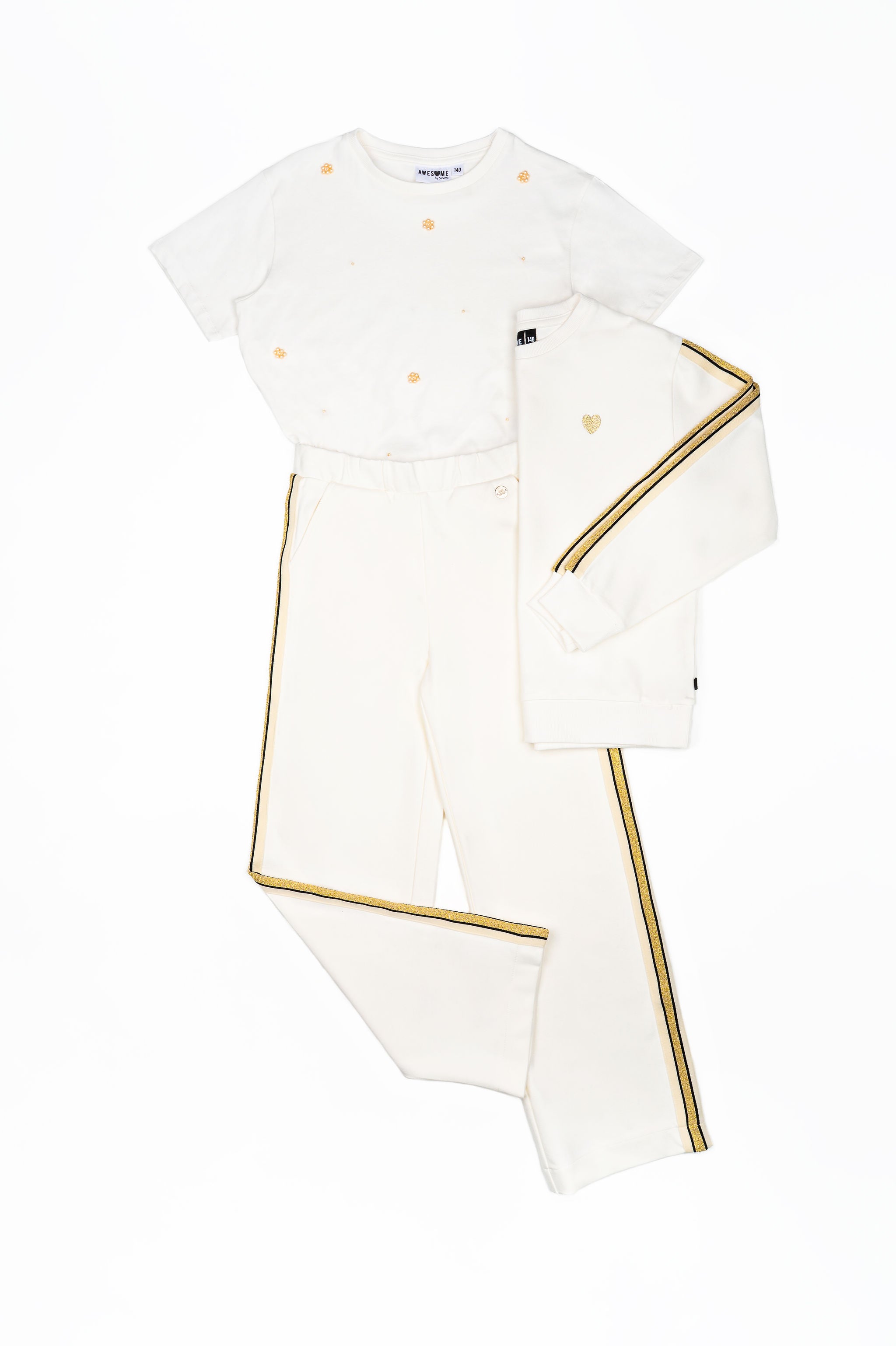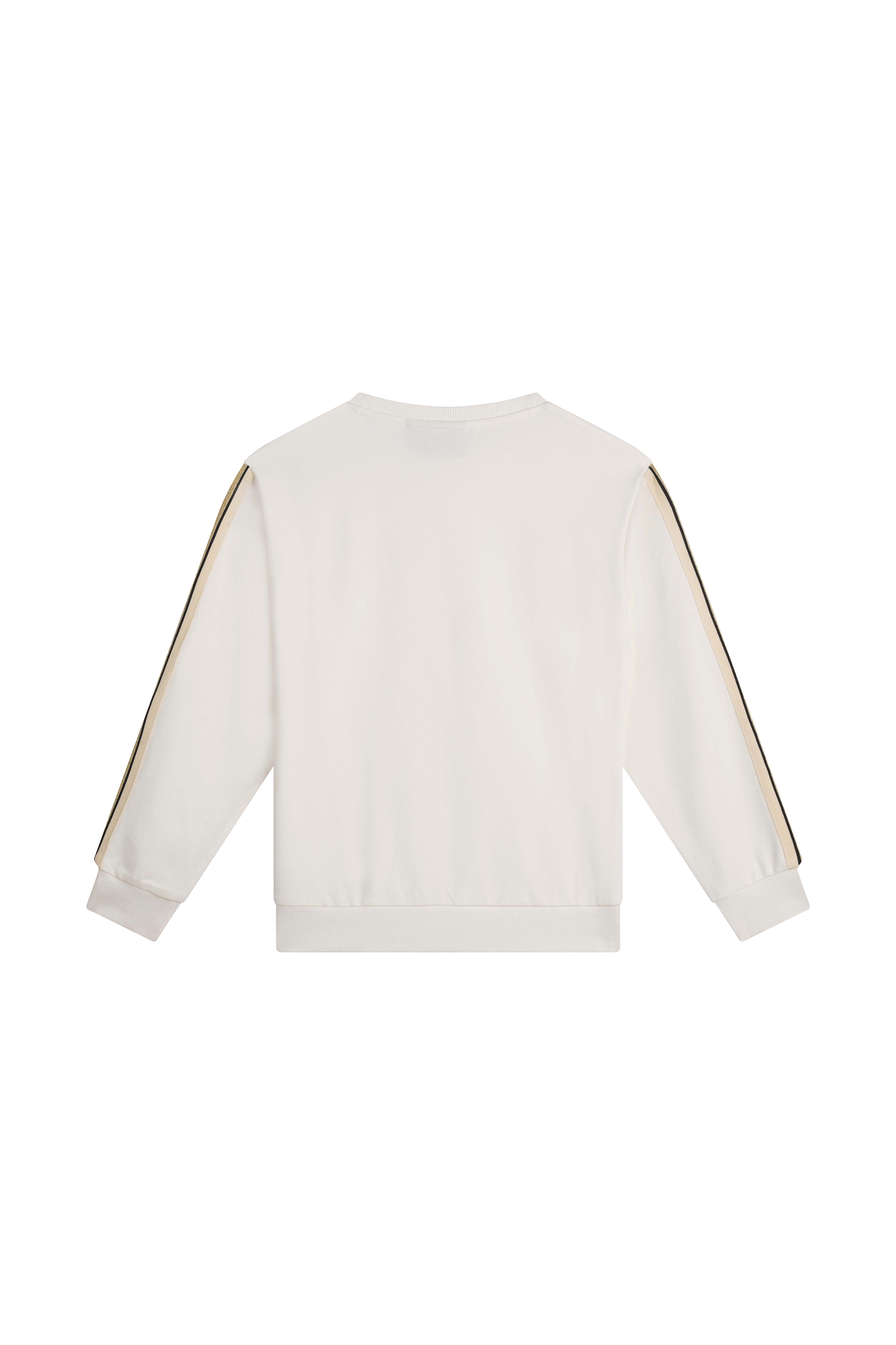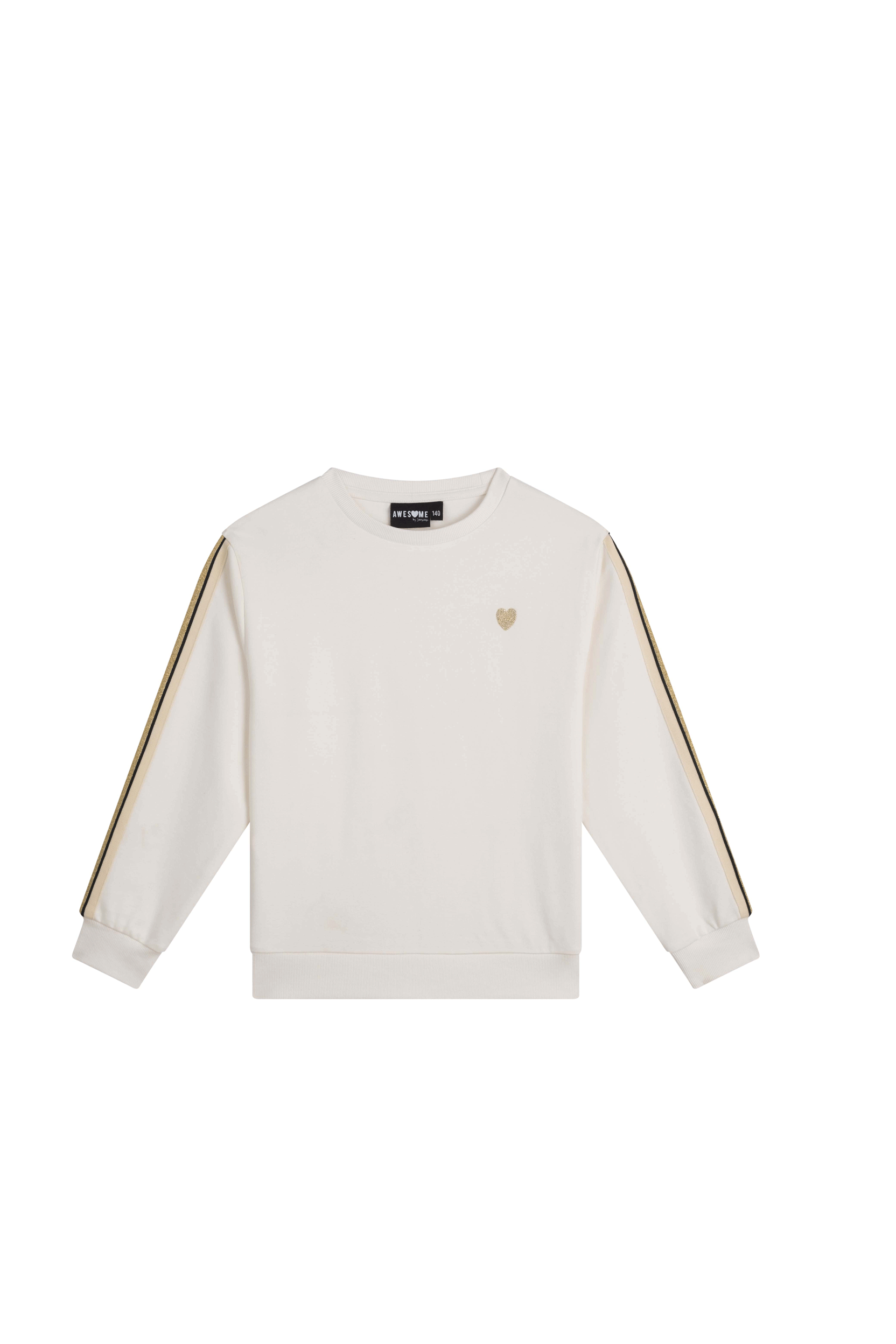 Sporty yet stylish! This cream-colored teen girls’ sweater features golden stripes along the sleeves and a small glittering heart on the chest. The perfect mix of casual comfort with a touch of glamour. Great for school, a day out, or just relaxing at home.