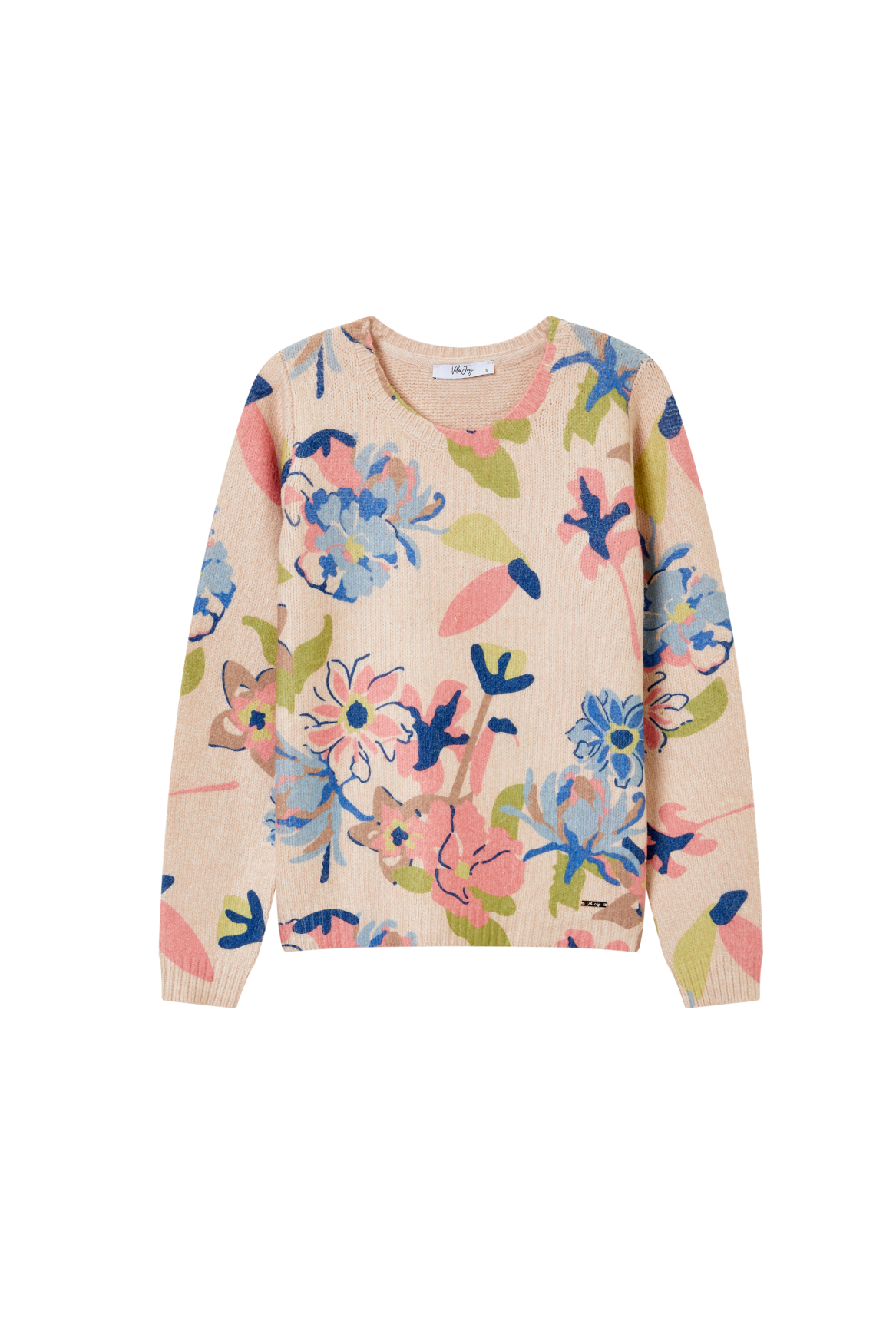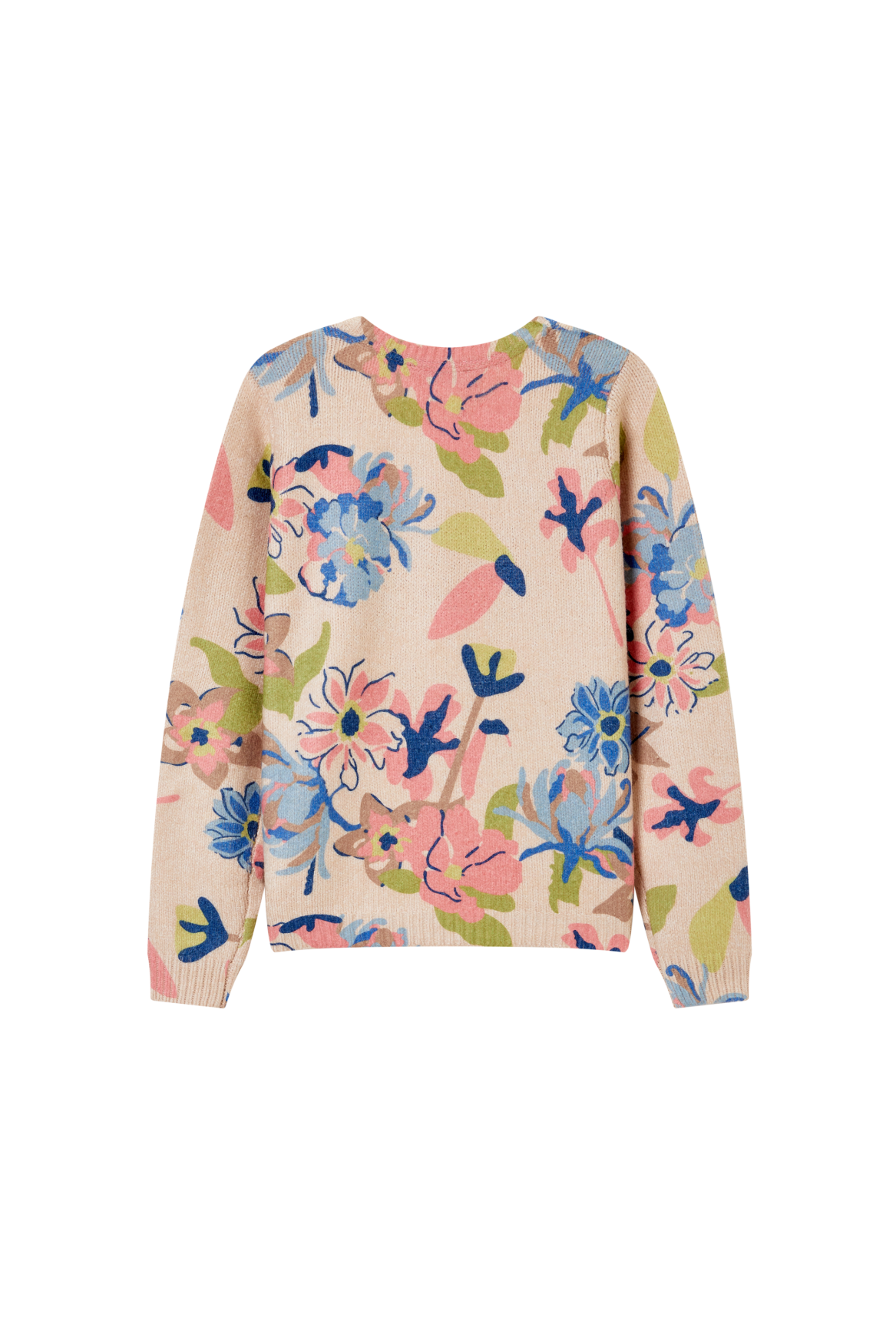This sweater features a lively, expressive floral print that adds a fresh and playful touch. The soft knit texture and round neckline ensure comfortable everyday wear. With its straight fit, the sweater is easy to style — pair it with jeans, a skirt, or shorts for a bright and colourful look.