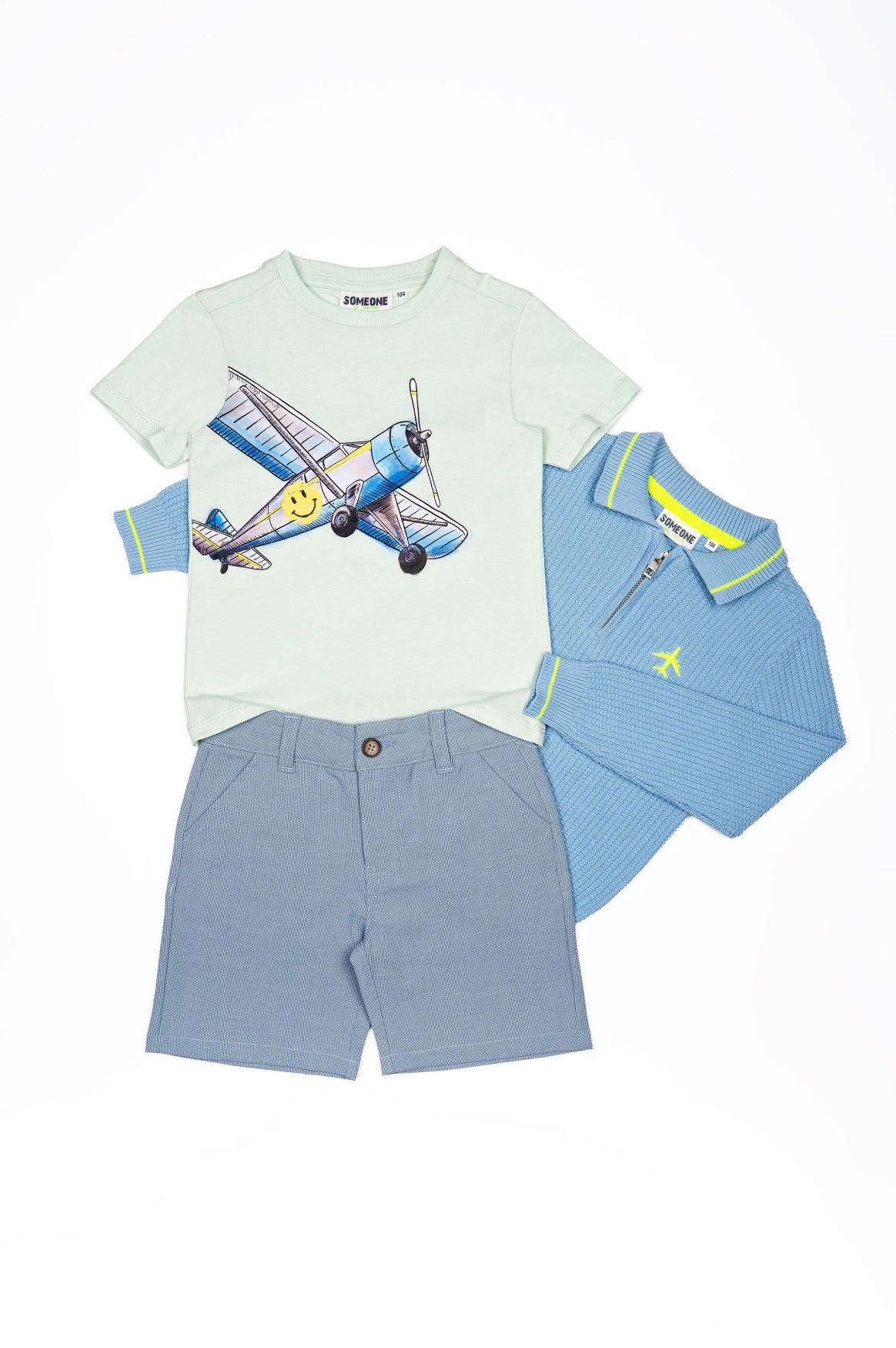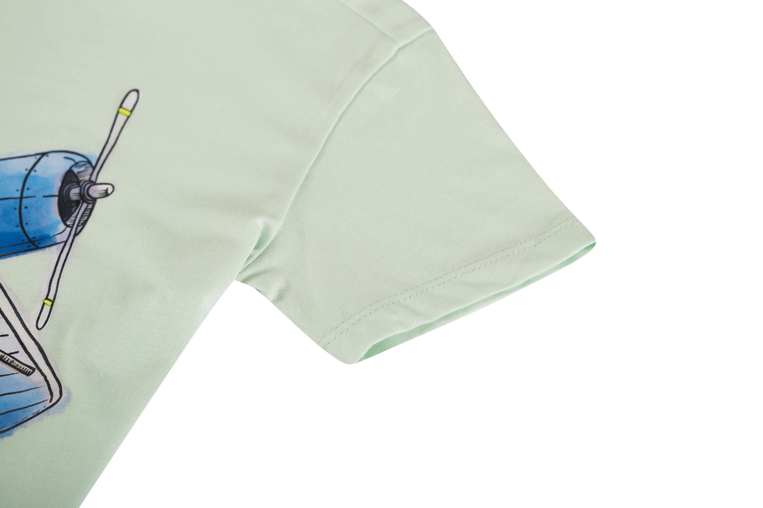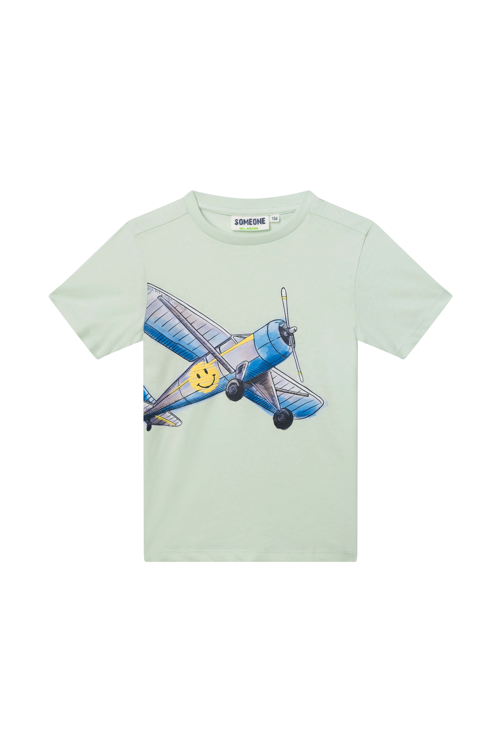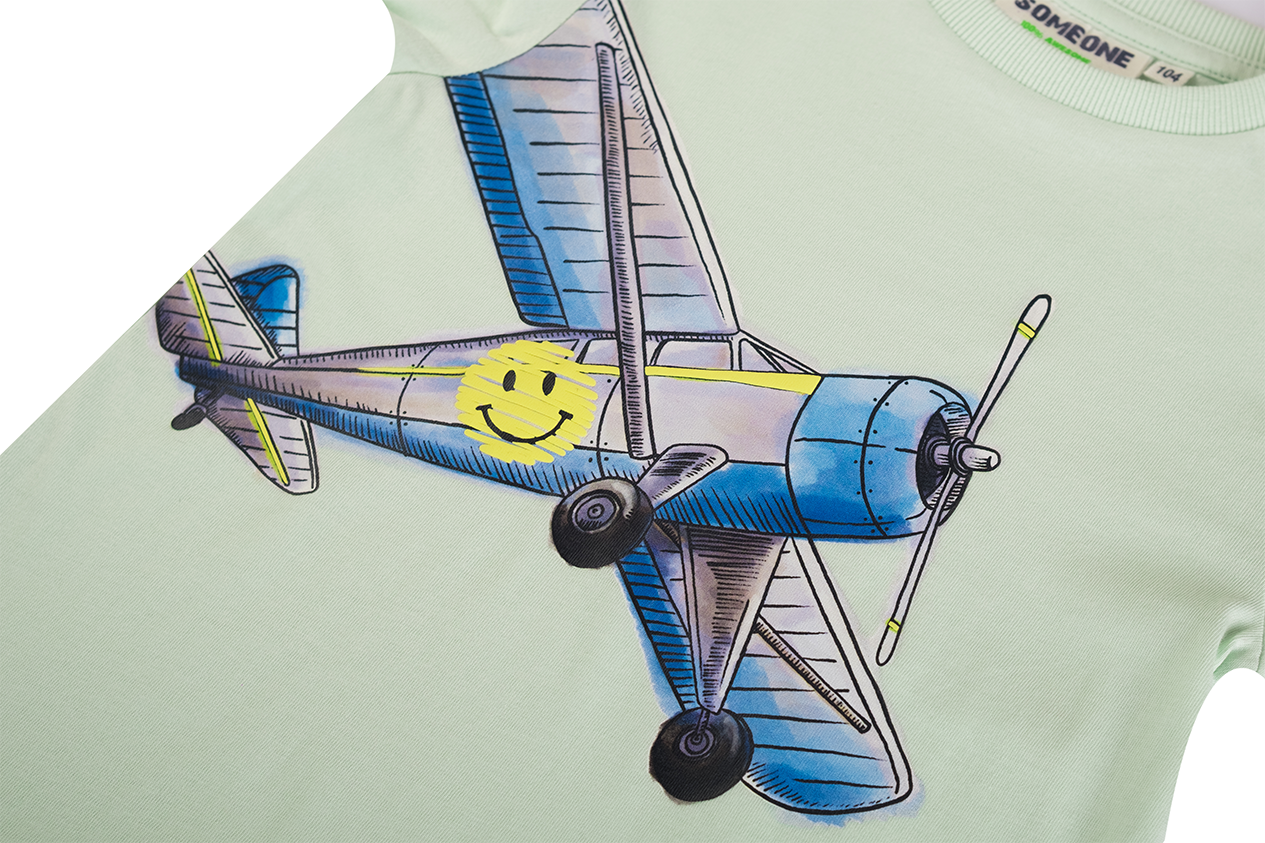Cool boys’ T-shirt in soft light green with a striking airplane print in blue and yellow, featuring a cheerful smiley on the fuselage. Perfect for little pilots who love planes and adventure. Great for summer days and casual outfits.