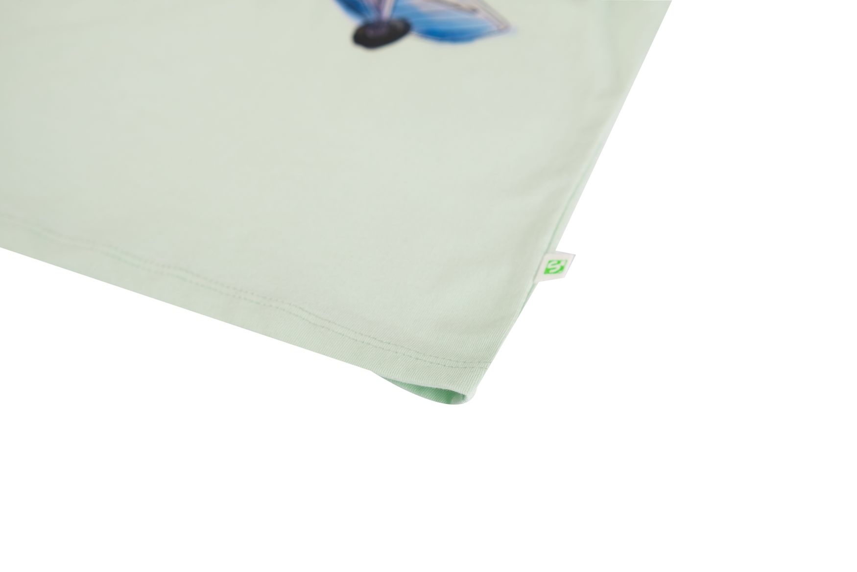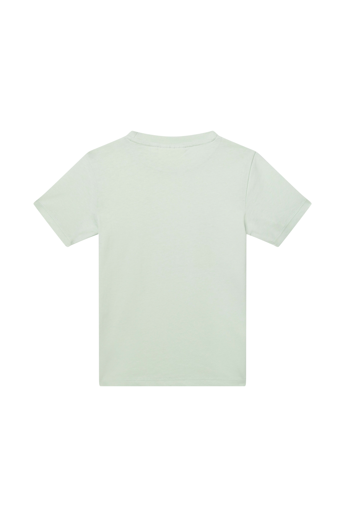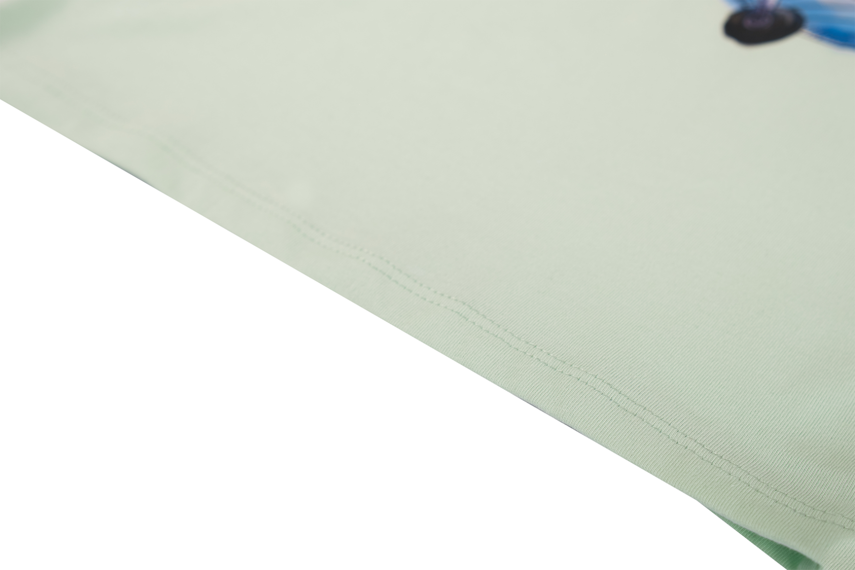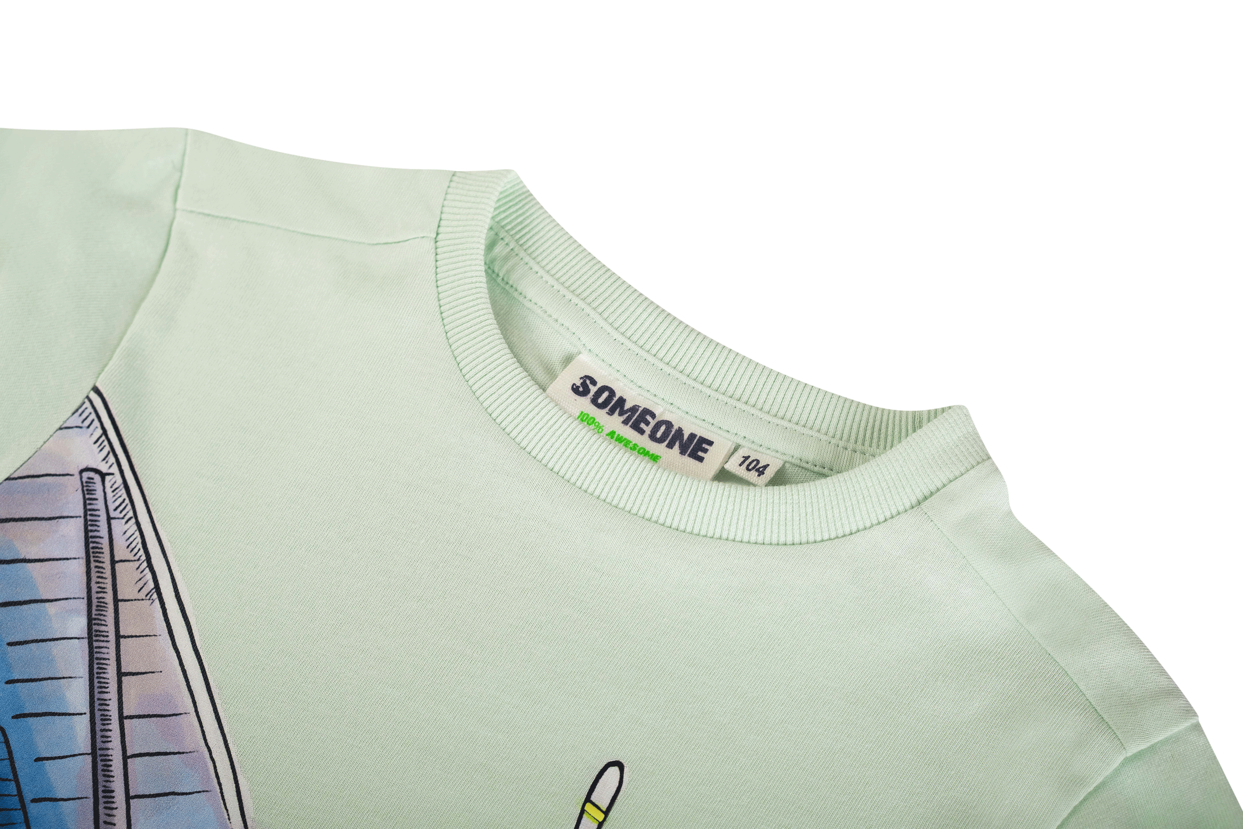 Cool boys’ T-shirt in soft light green with a striking airplane print in blue and yellow, featuring a cheerful smiley on the fuselage. Perfect for little pilots who love planes and adventure. Great for summer days and casual outfits.