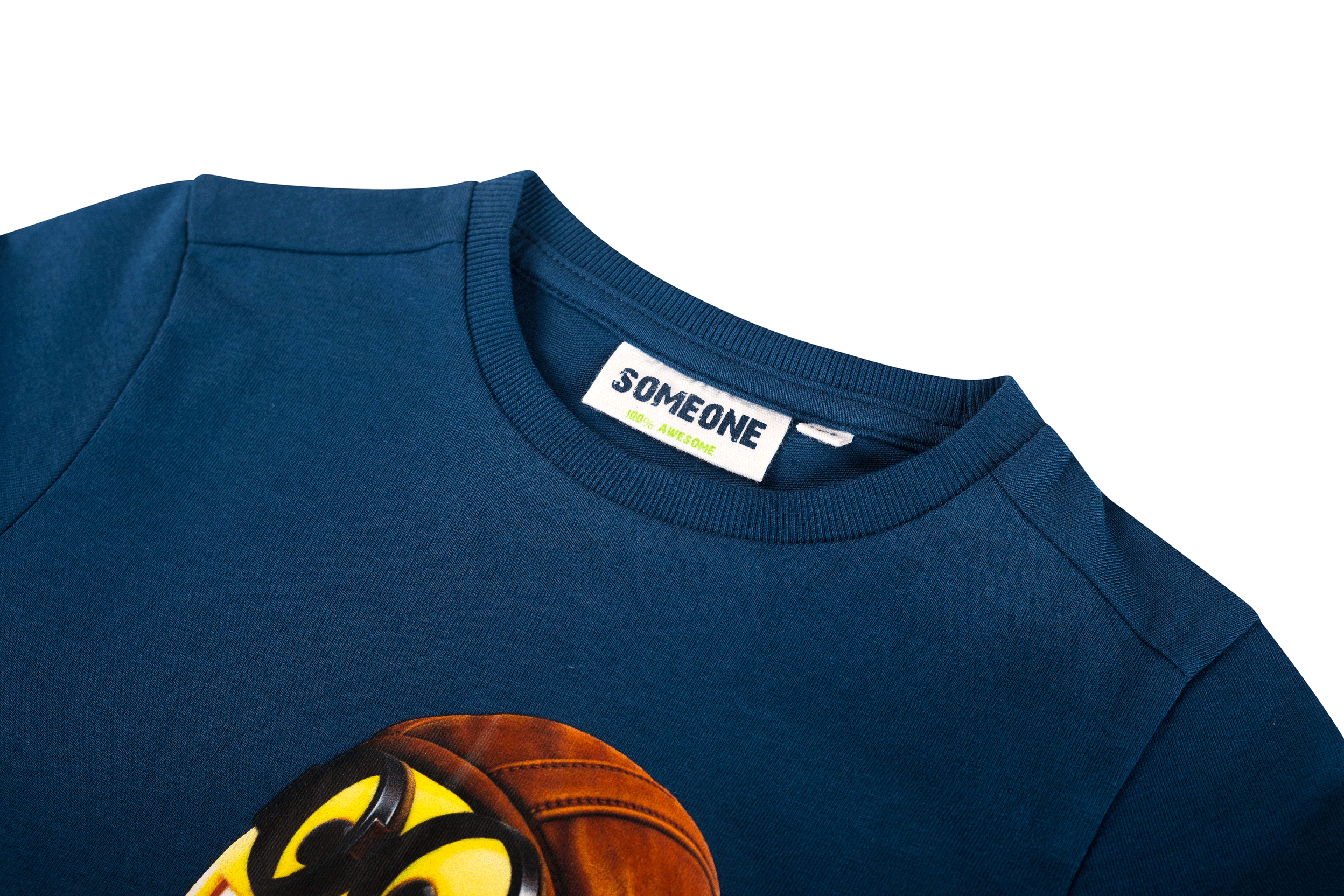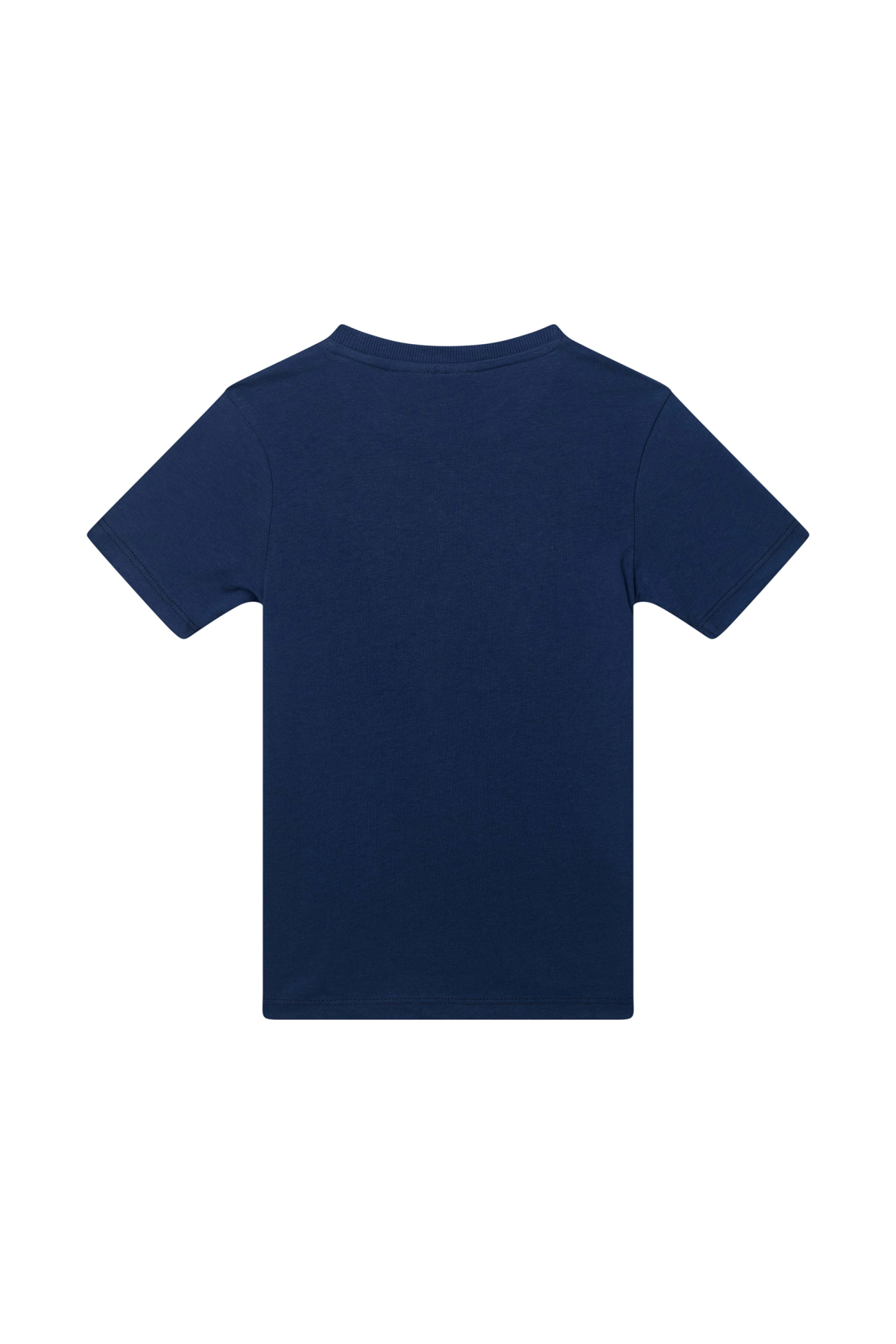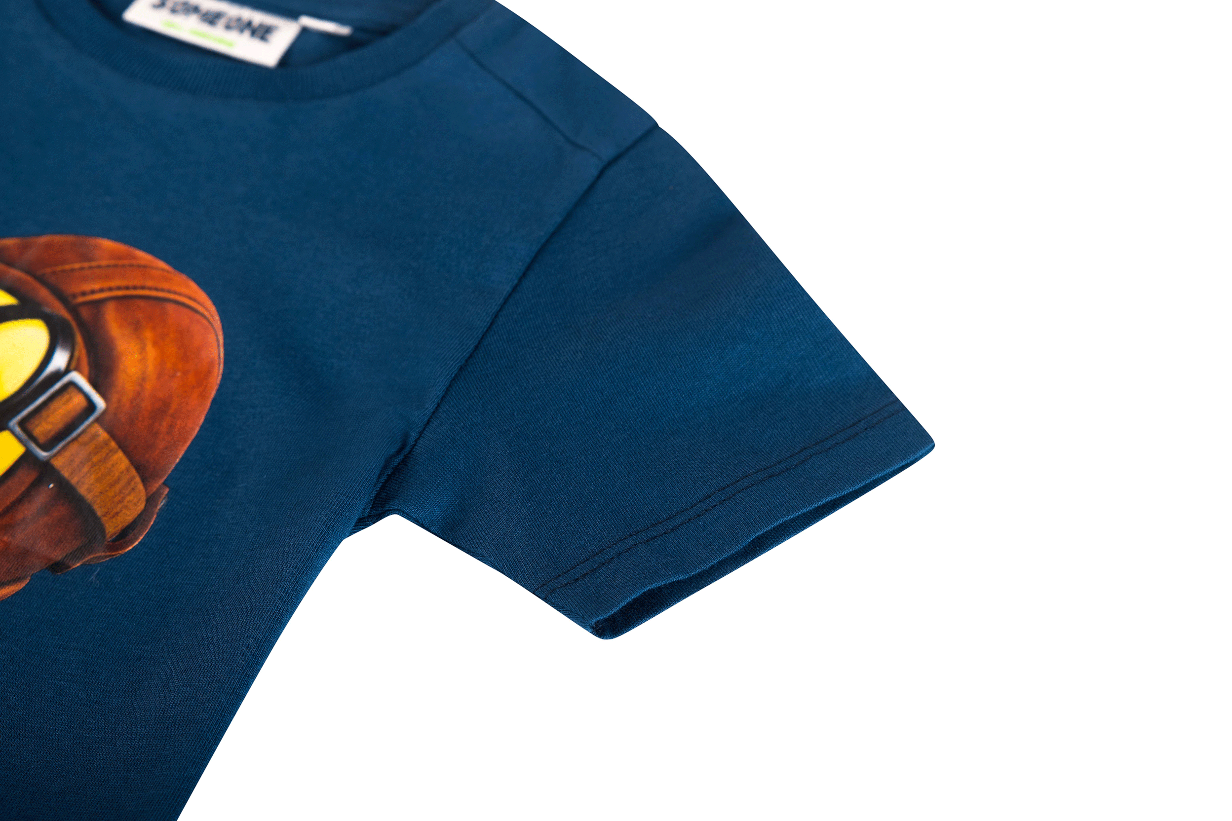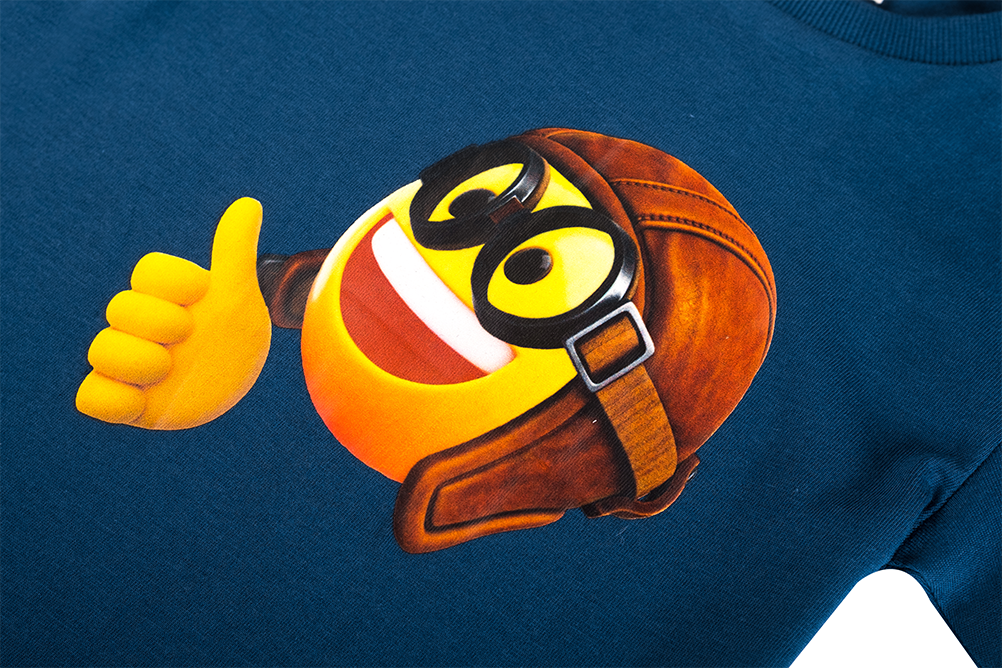 Dark blue boys’ T-shirt with a fun pilot smiley print. The smiley wears a retro flying helmet and goggles while giving a thumbs-up. A playful and adventurous must-have for kids who love planes and aviation.