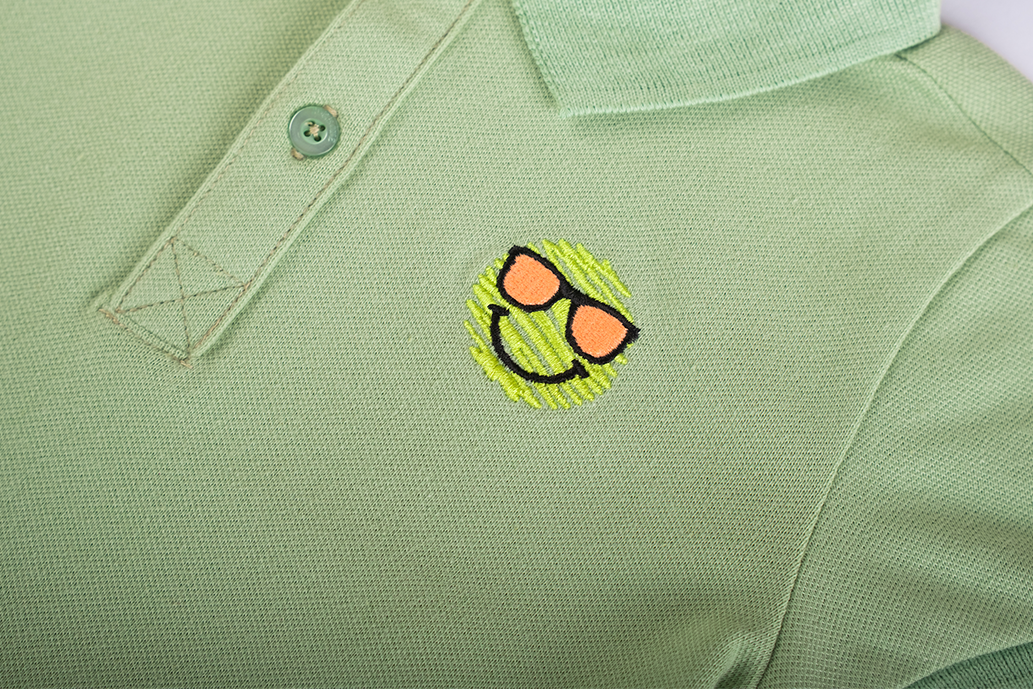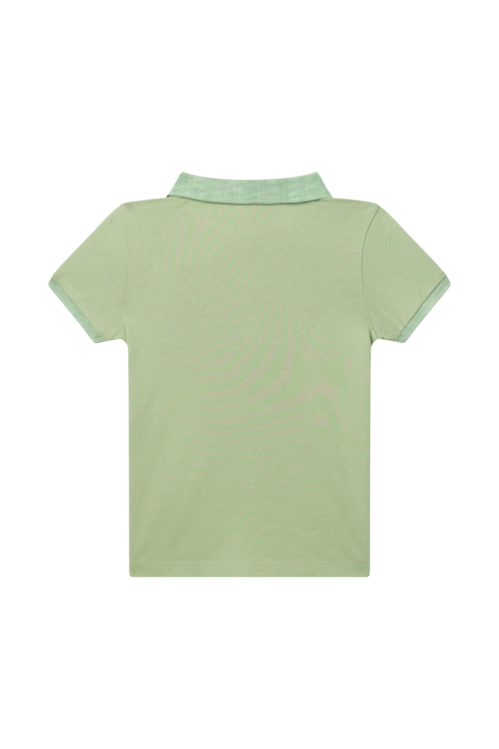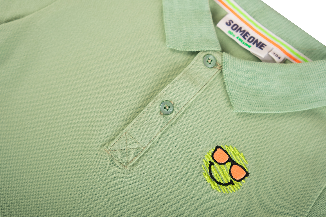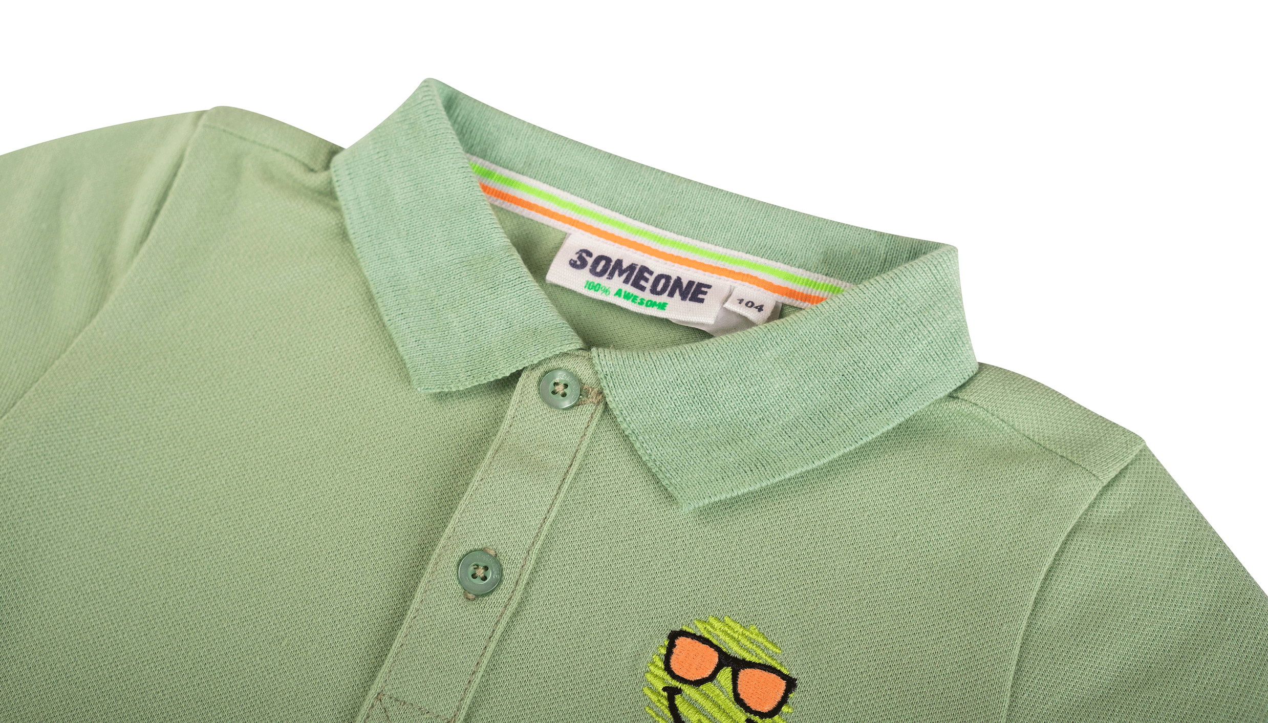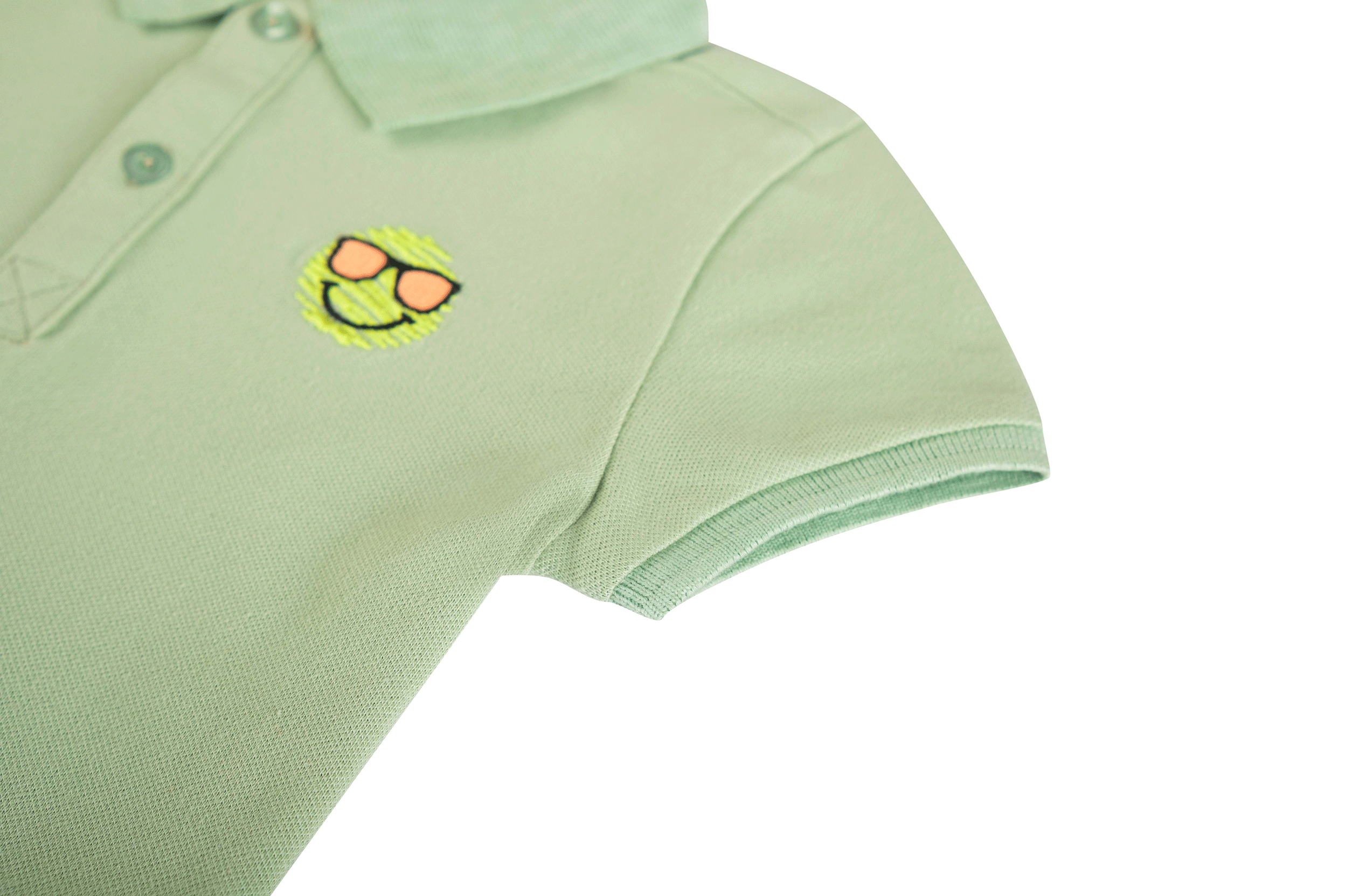 Light green boys’ polo shirt with short sleeves and a cheerful embroidered smiley wearing sunglasses. A playful yet stylish polo that combines comfort and fun – perfect for summer days or a casual smart look.