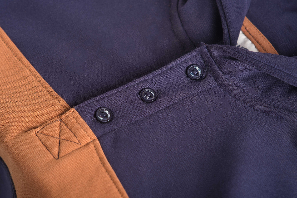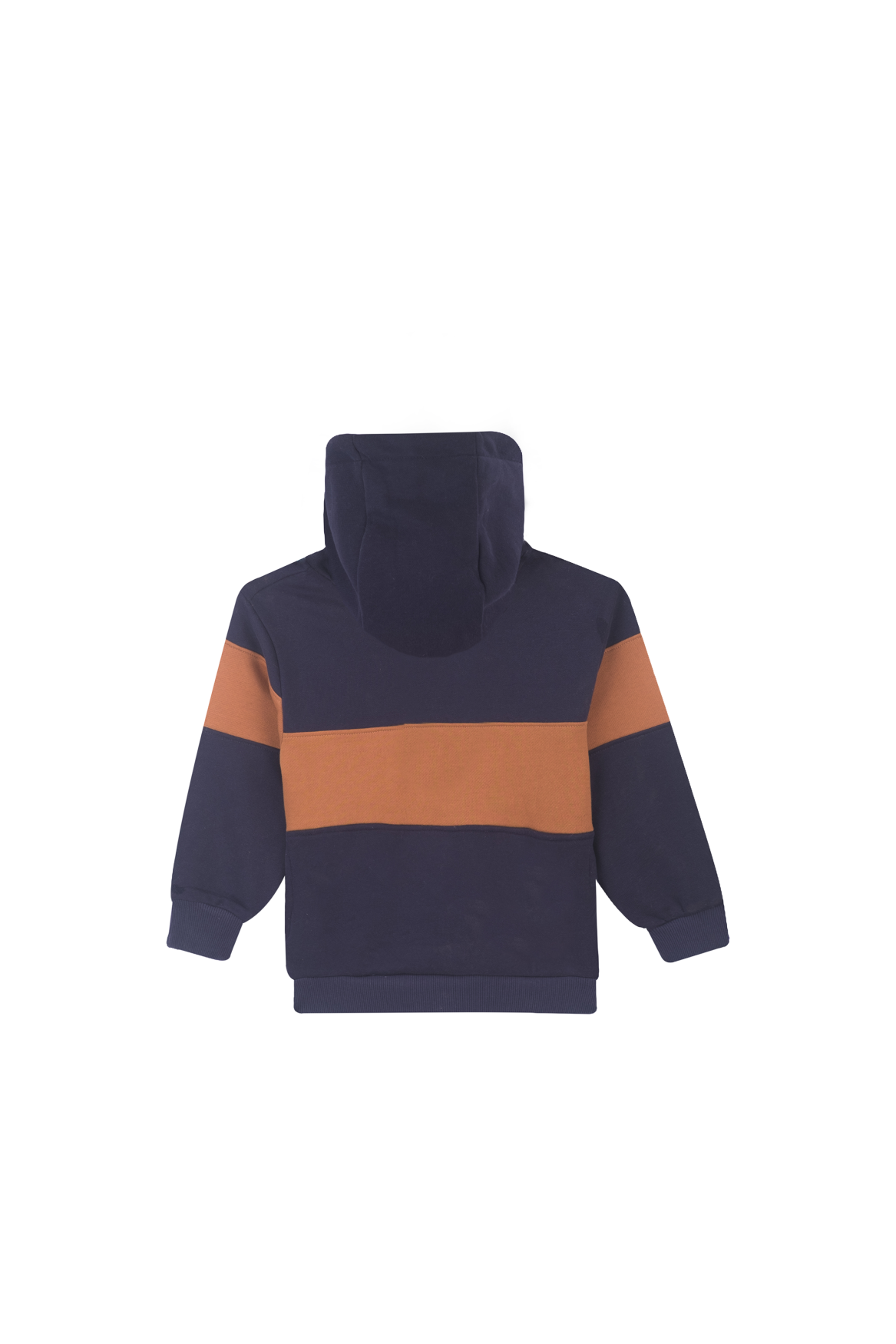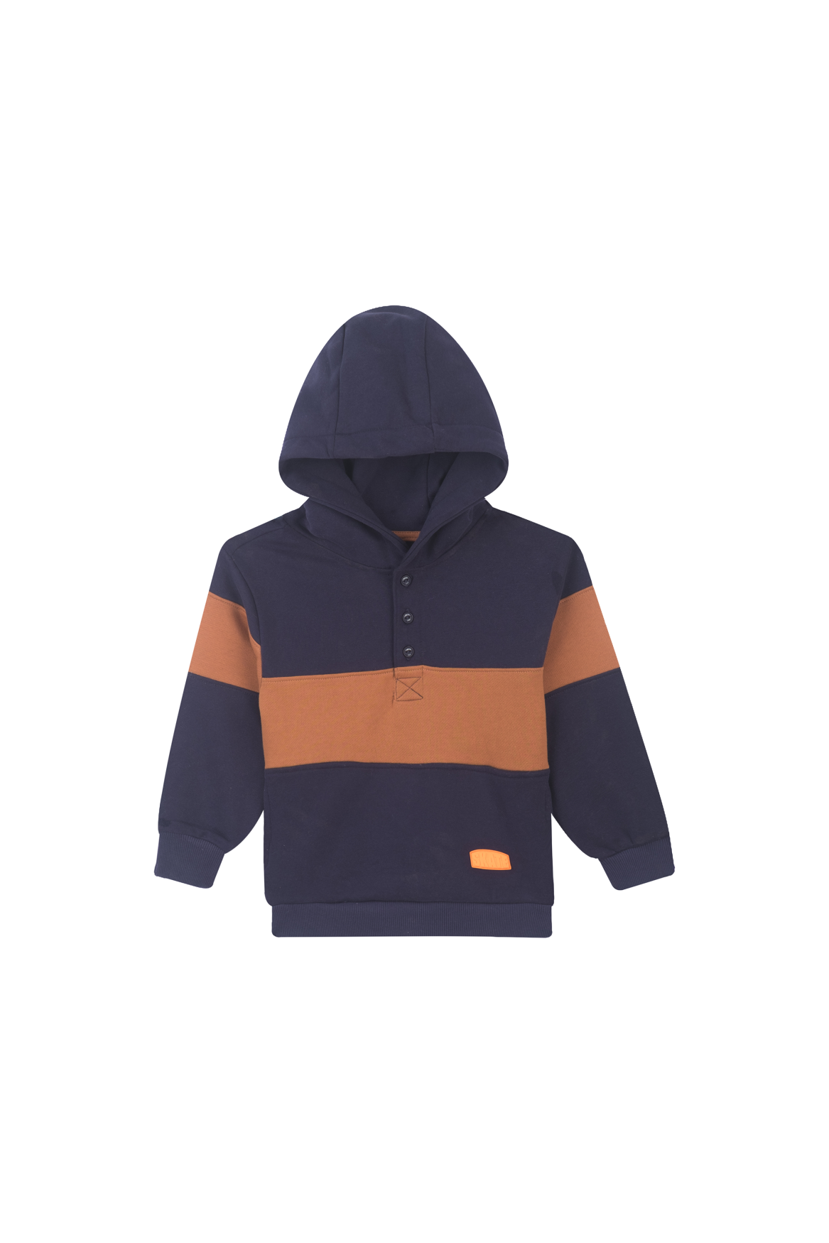 This cool children’s hoodie blends a classic look with a bold colour-block design. The wide stripe across the body and sleeves creates a sporty, modern feel. The button placket at the front adds a practical and stylish touch. With its easy fit, this hoodie is perfect for school days, outdoor play, or relaxed moments at home. A versatile piece that pairs effortlessly with a wide range of outfits.
