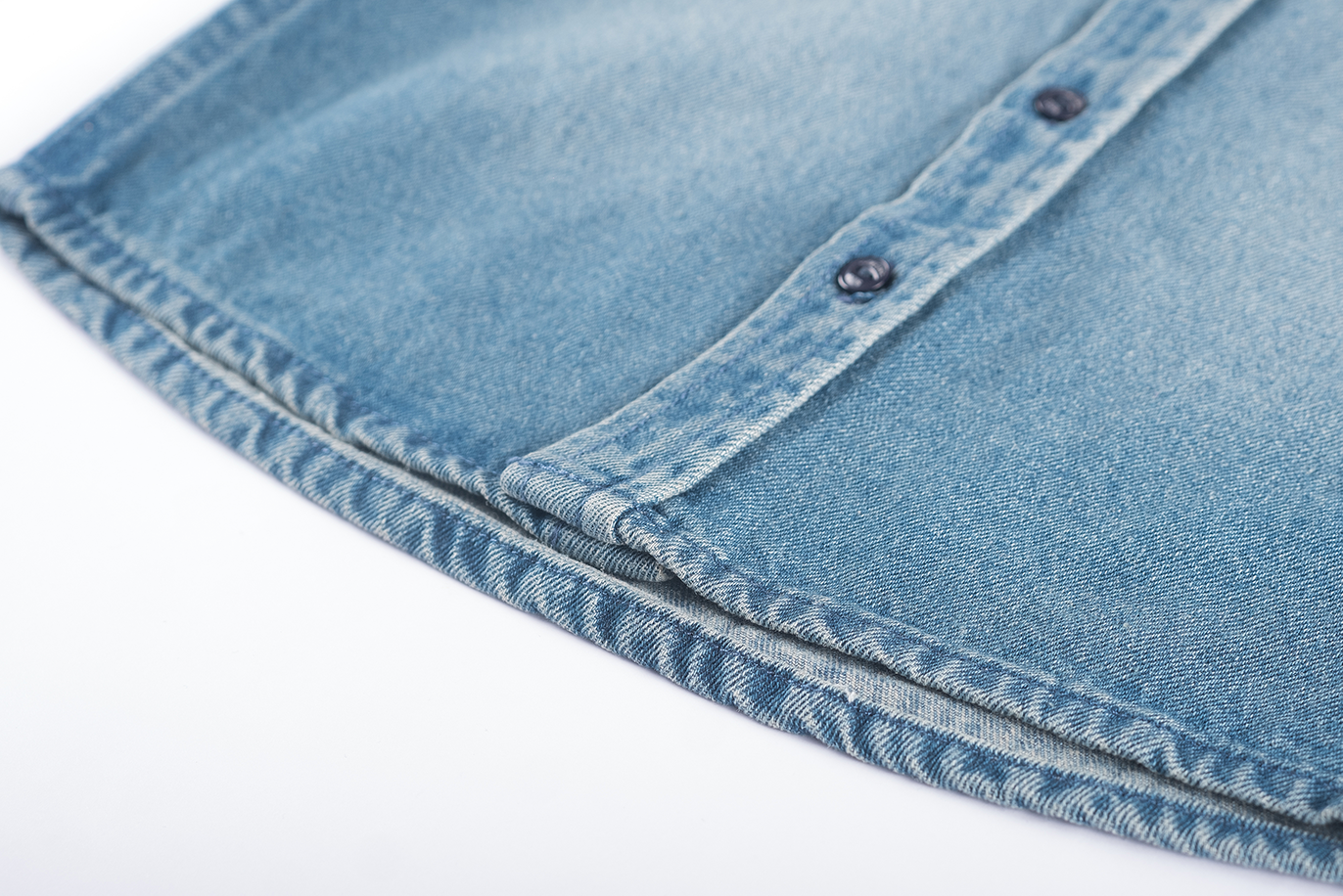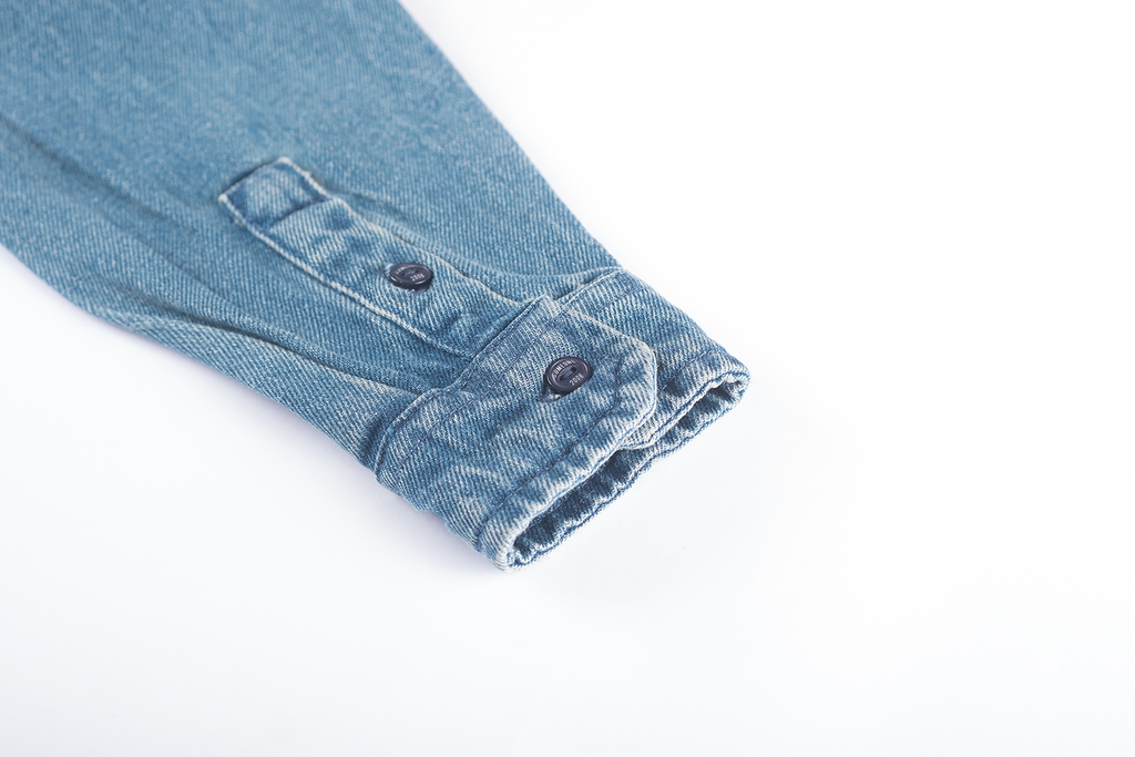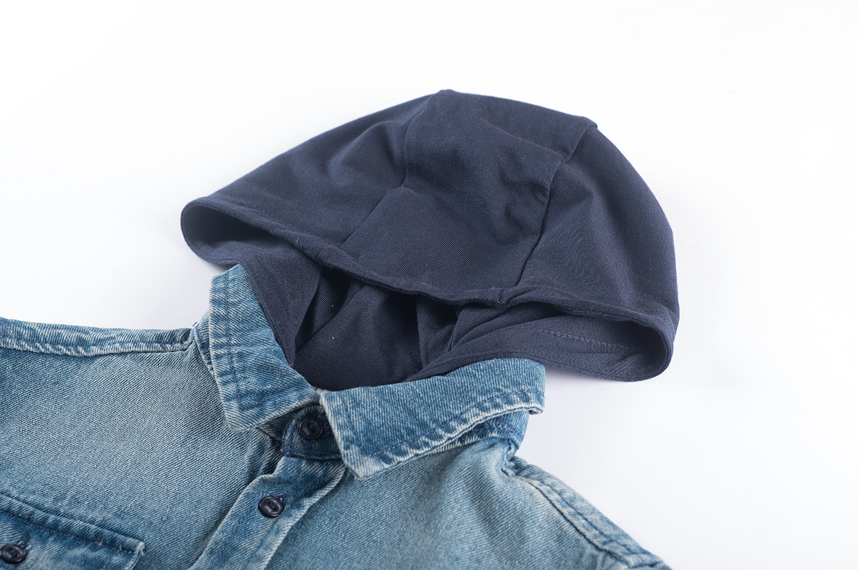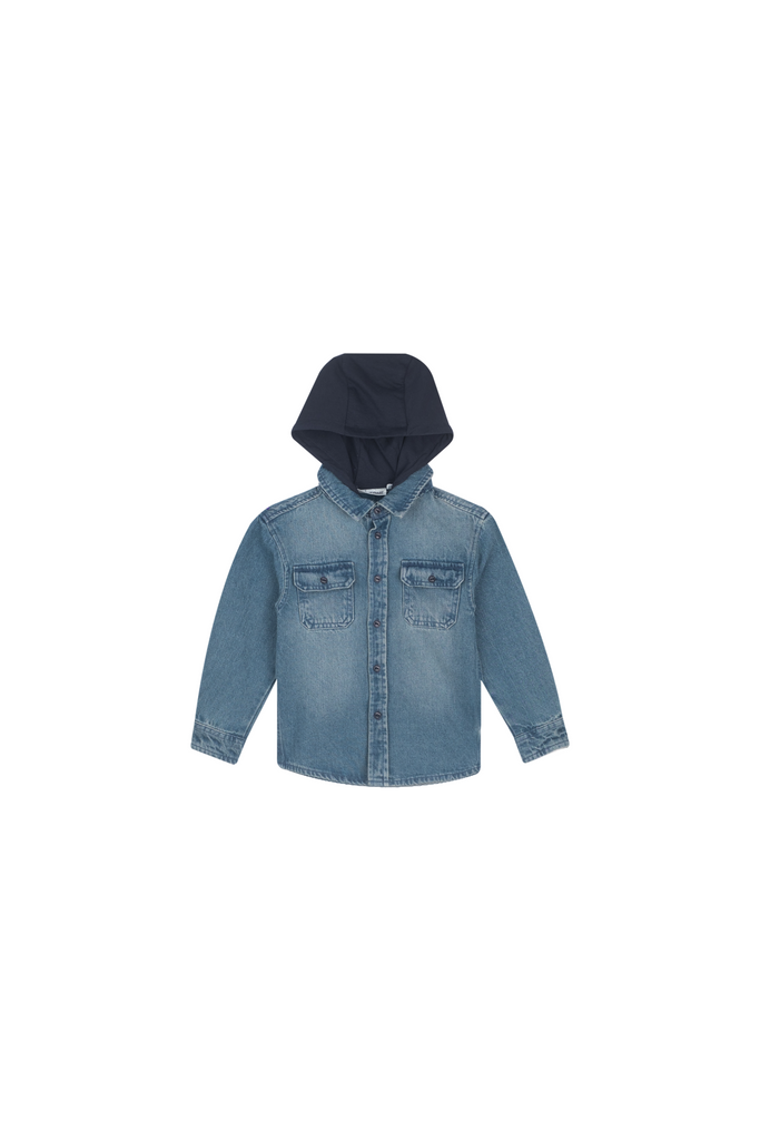 This denim shirt with hood is a bold blend of classic and casual. The back view reveals a faded denim wash with long sleeves and buttoned cuffs. The dark navy hood adds a sporty, relaxed touch, giving the shirt a hoodie-inspired vibe. A versatile piece that can be worn as a light jacket or a statement layer. Perfect for kids who love a unique sense of style.