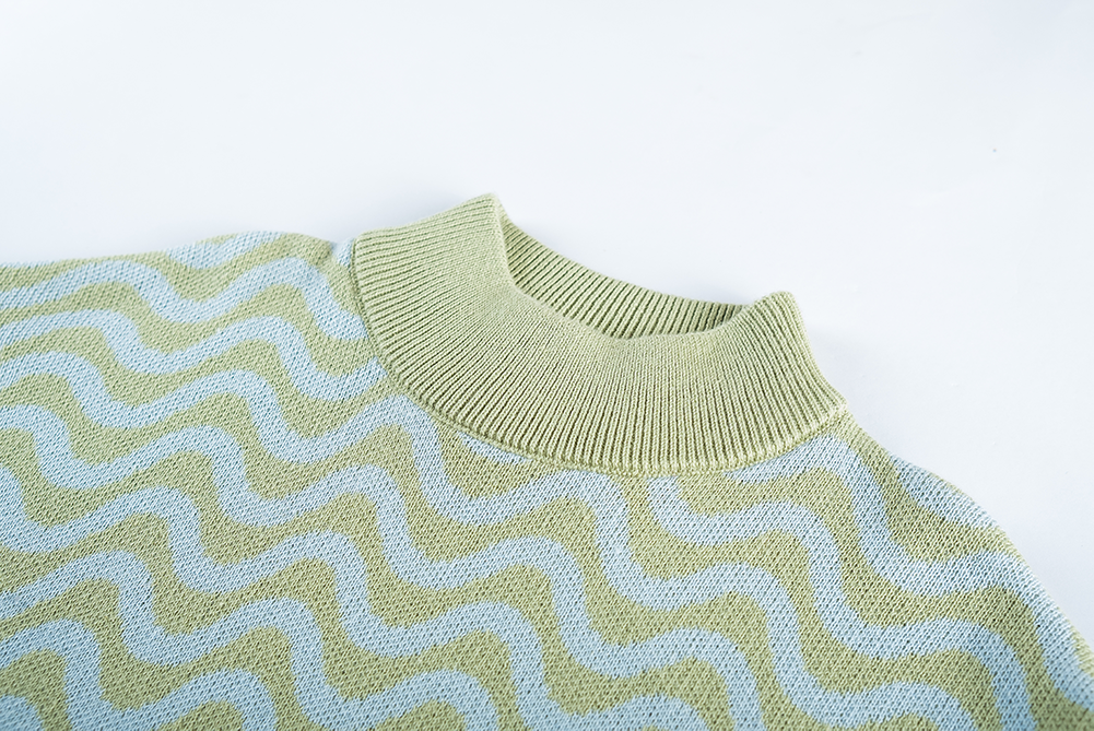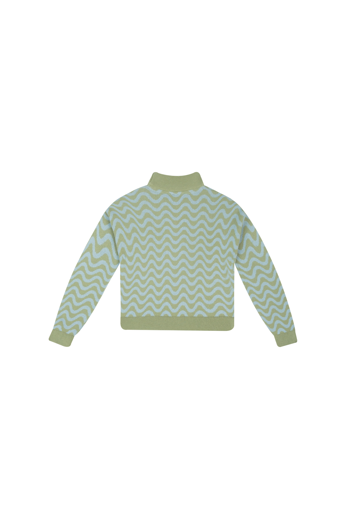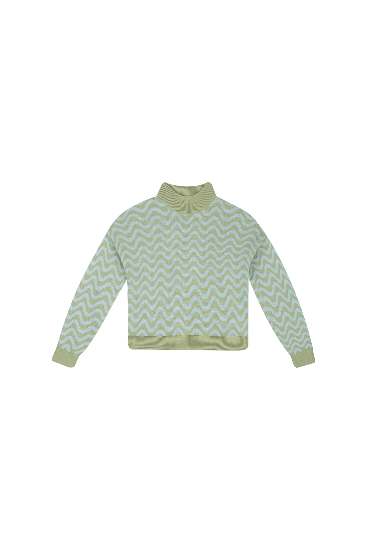 This light green sweater with a wavy pattern is a fresh and modern eye-catcher for any wardrobe. The playful design gives the sweater a unique look, while the comfortable fit makes it perfect for everyday wear. The high neckline and ribbed hems create a clean and polished finish. Ideal to pair with jeans, a skirt, or a cozy winter outfit for a stylish and contemporary look.