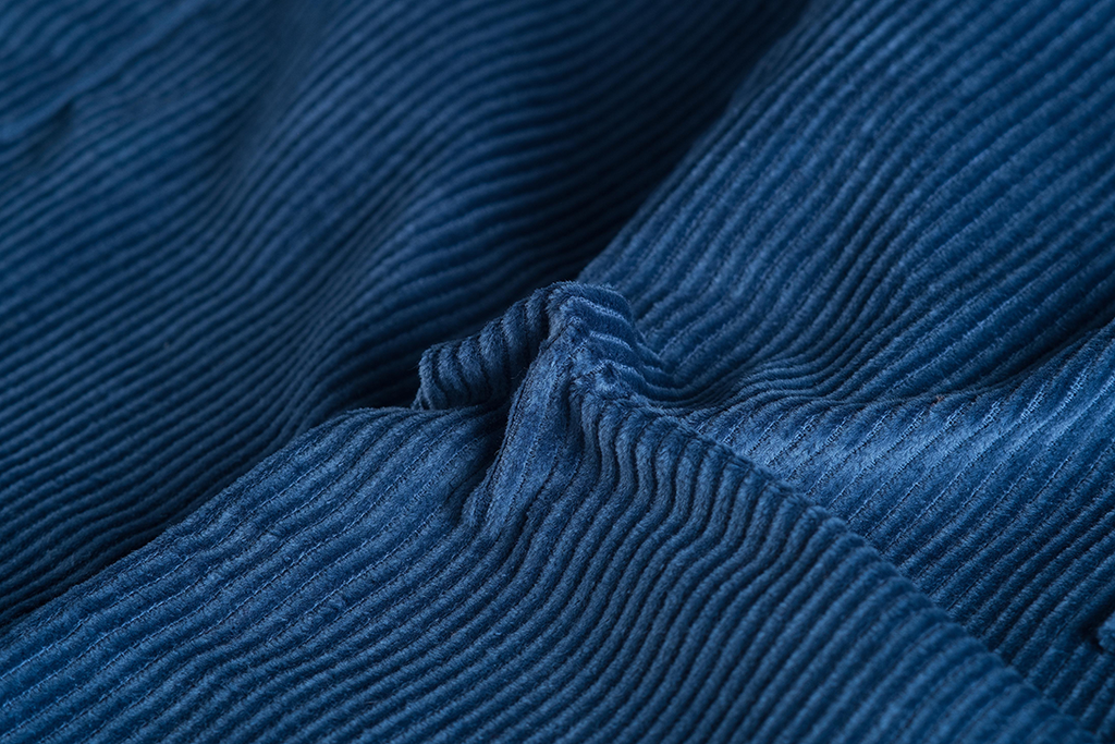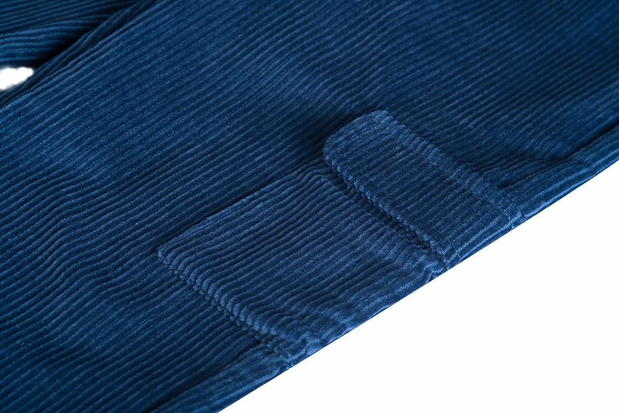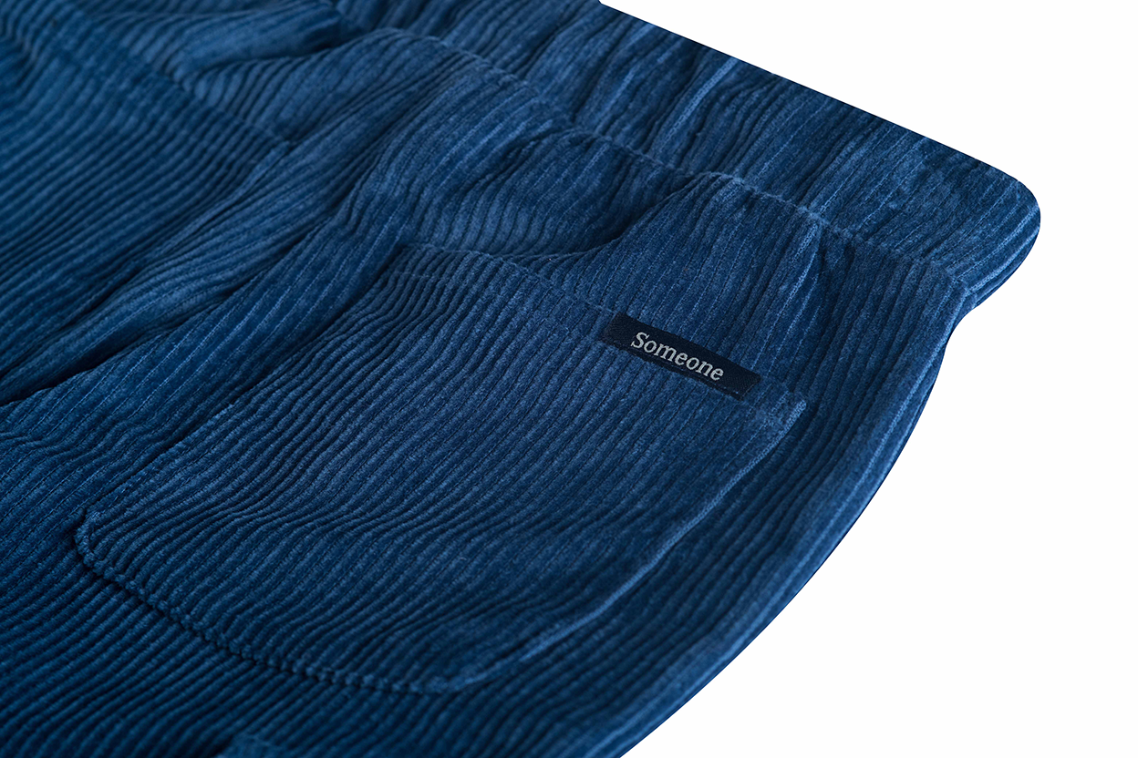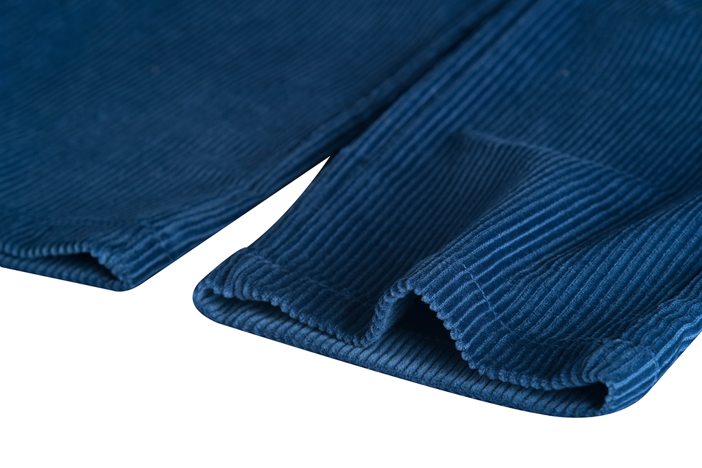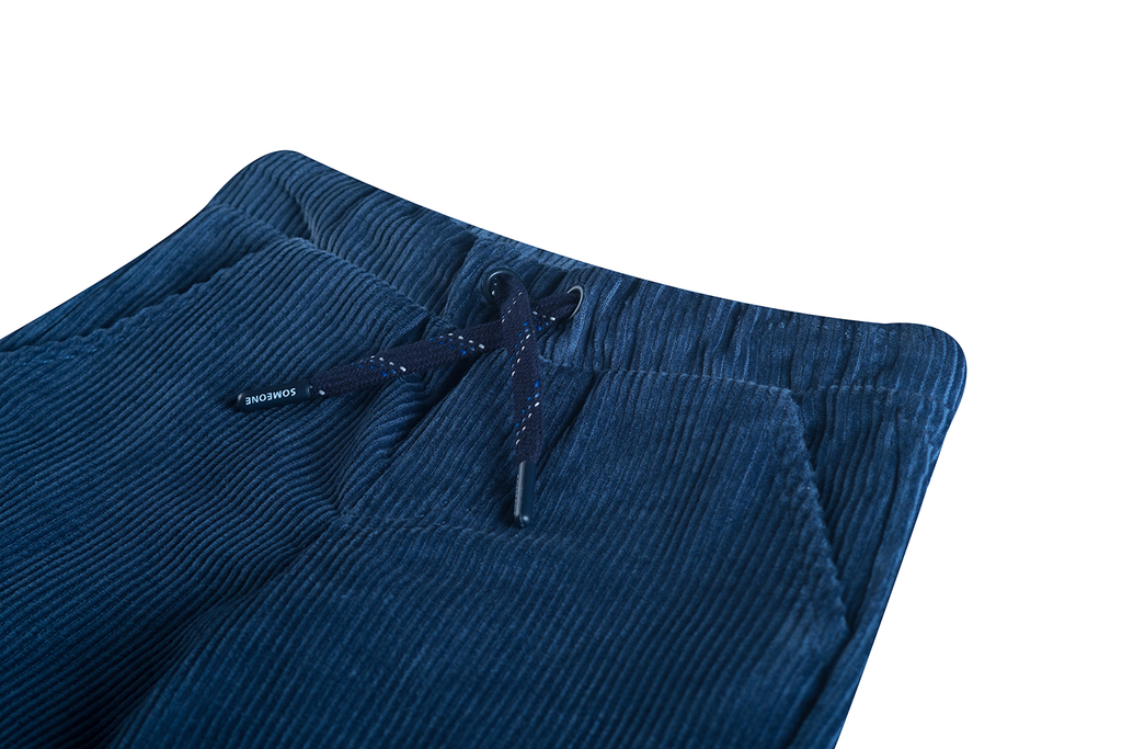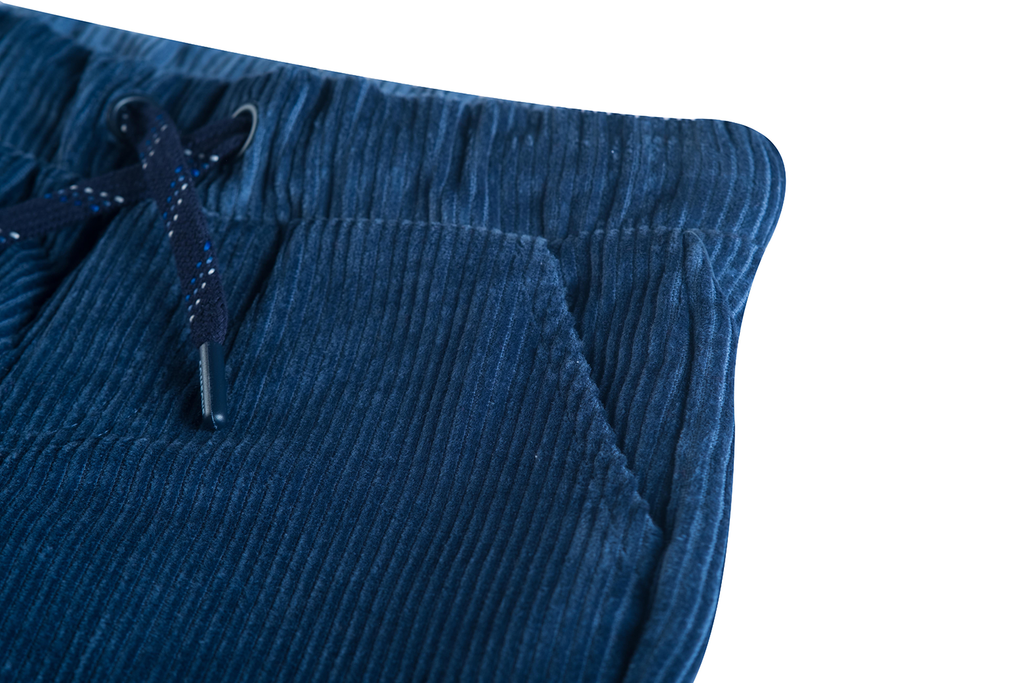 These blue corduroy pants are a cool and comfortable choice for everyday wear. The elastic waistband offers an easy fit, while two back pockets and cargo-style side pockets add both practicality and a trendy touch. A small black label with white text is stitched onto the right back pocket as a subtle detail. The straight-leg cut and ribbed texture give the pants a classic yet playful look. Perfect for kids who enjoy a blend of style and function.