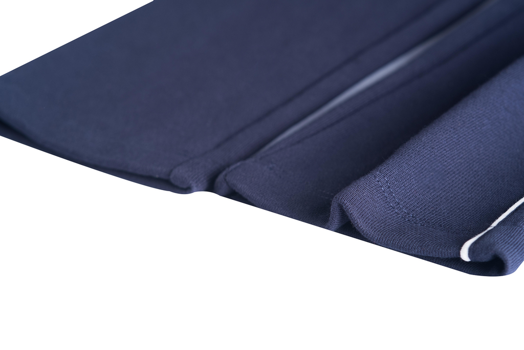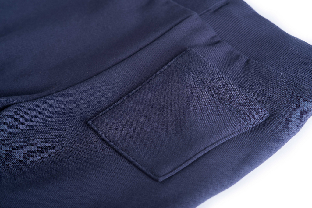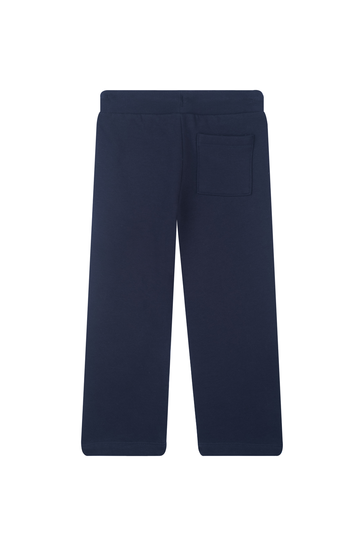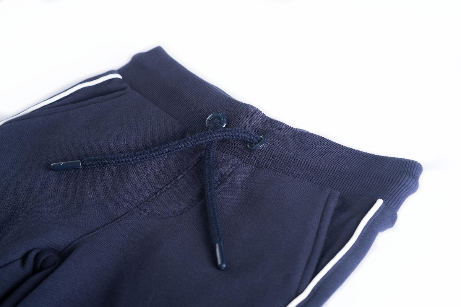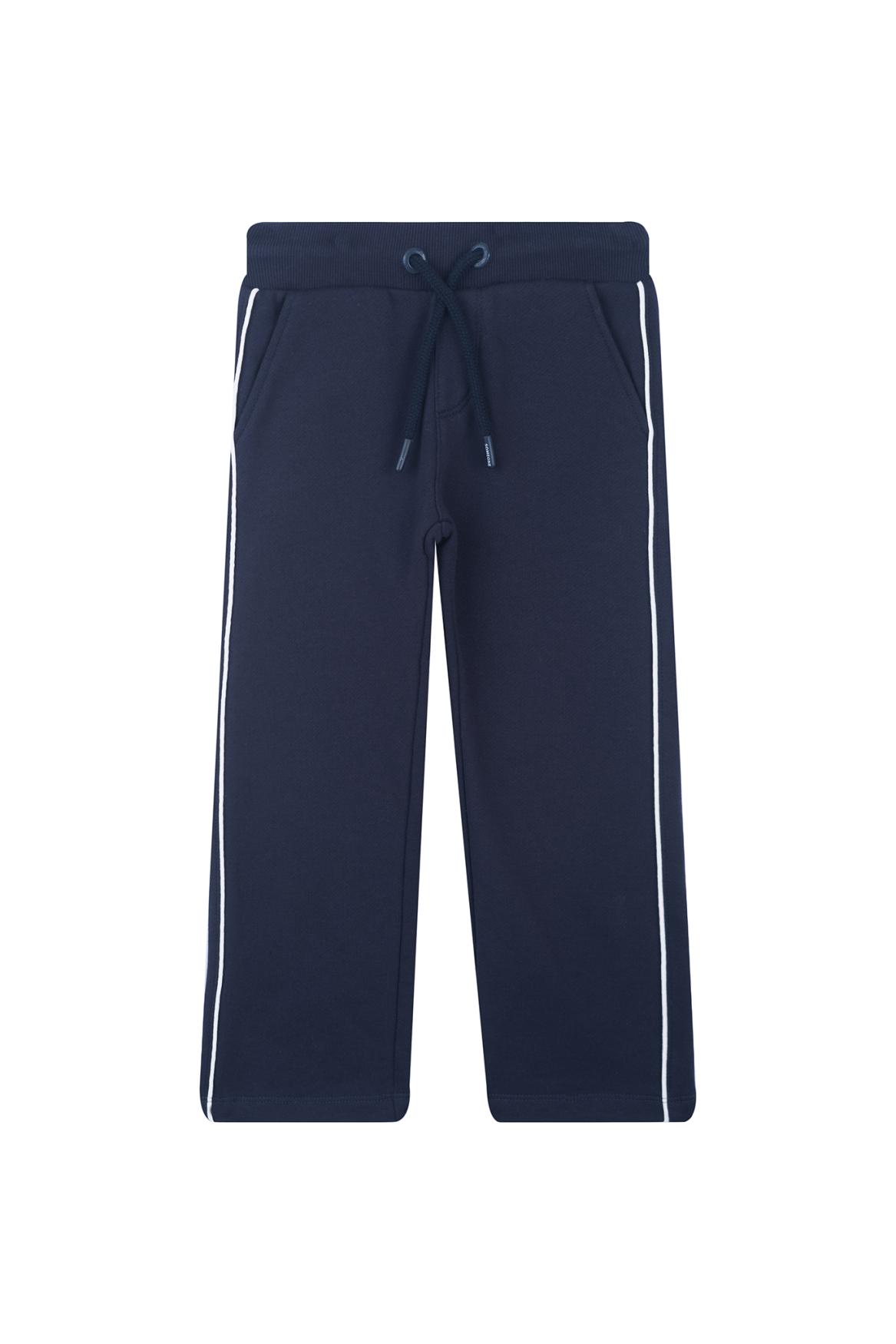 These navy blue sweatpants are a sporty and stylish choice for active kids. White vertical stripes run along the outer seams of both legs, creating a fresh contrast and dynamic look. The elastic waistband with drawstring offers an adjustable fit, while two front pockets provide practical storage. Ribbed cuffs at the ankles complete the design neatly. A pair of pants that blends comfort and movement with a modern touch.