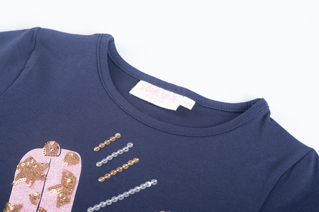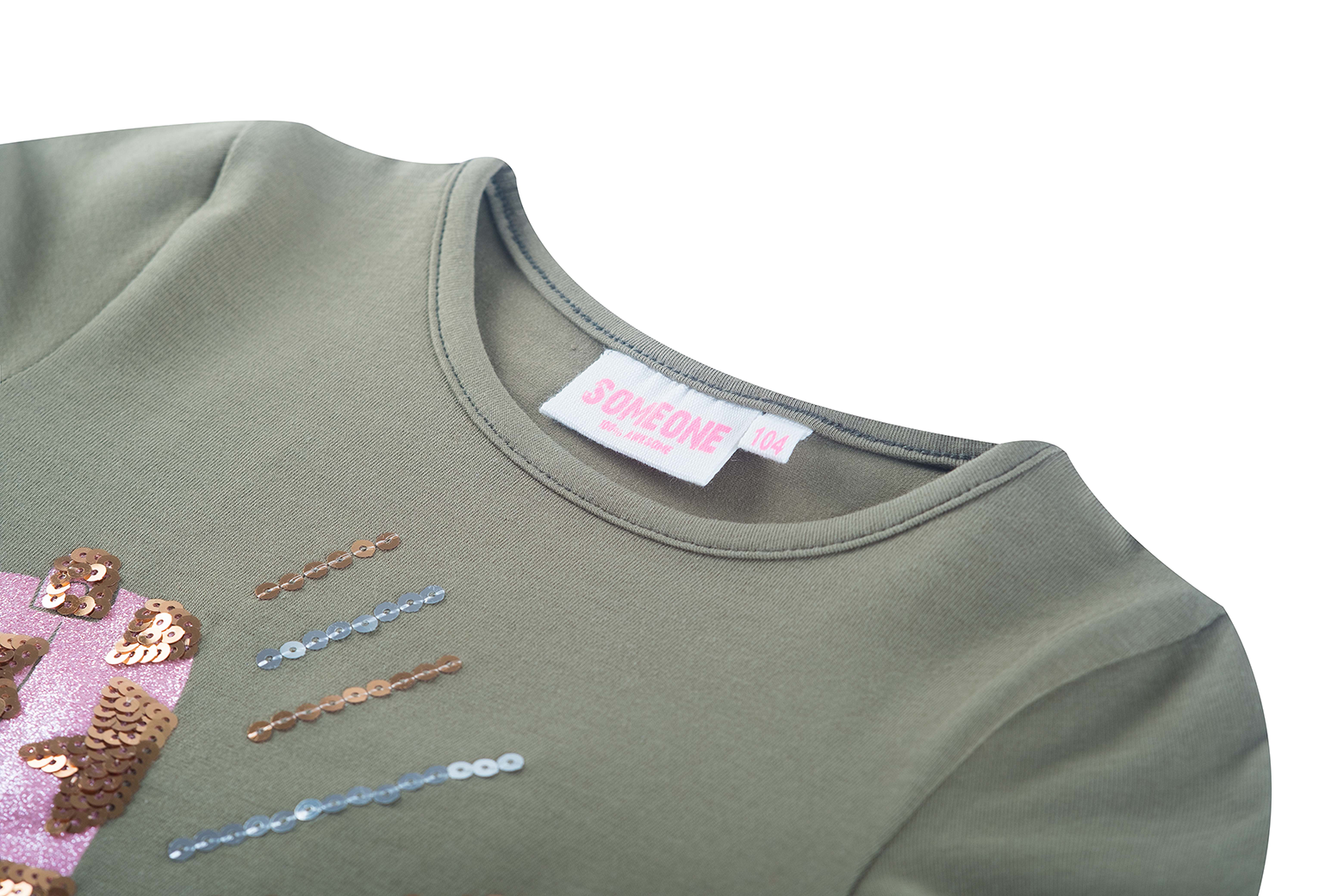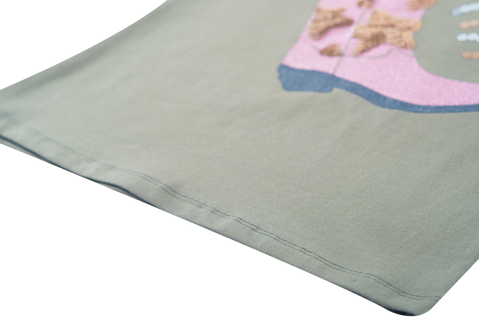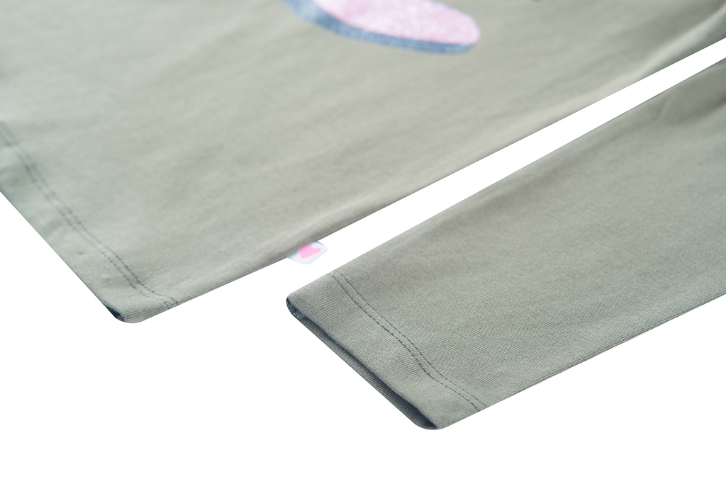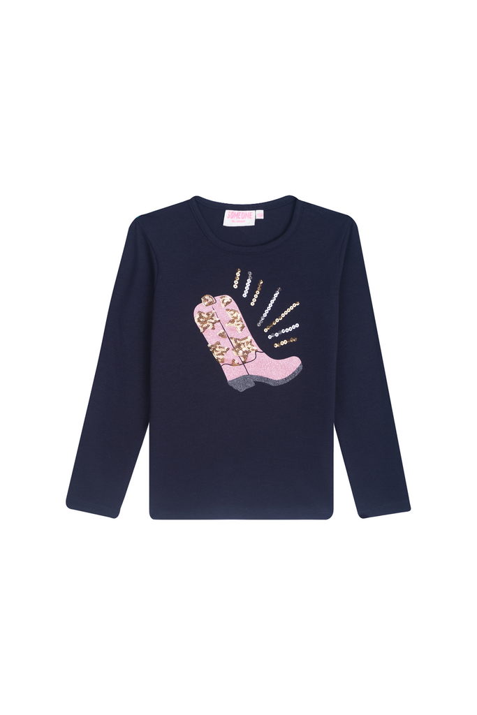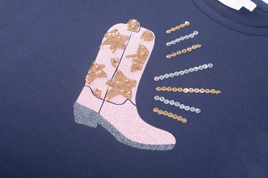 This khaki long-sleeved top is a bold and sparkling choice for girls who love a unique style. The large pink cowboy boot on the front, decorated with glittery sequins and star-shaped accents, creates a striking and festive effect. The colorful lines around the boot add a sense of motion and flair. Perfect for an outfit with personality, or as a statement piece on an ordinary day. A top that blends boldness and sparkle, giving every look a touch of western chic.