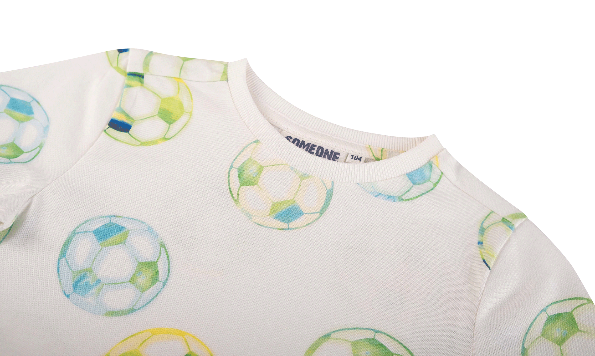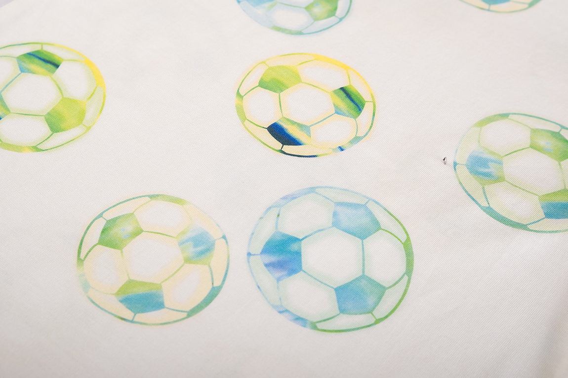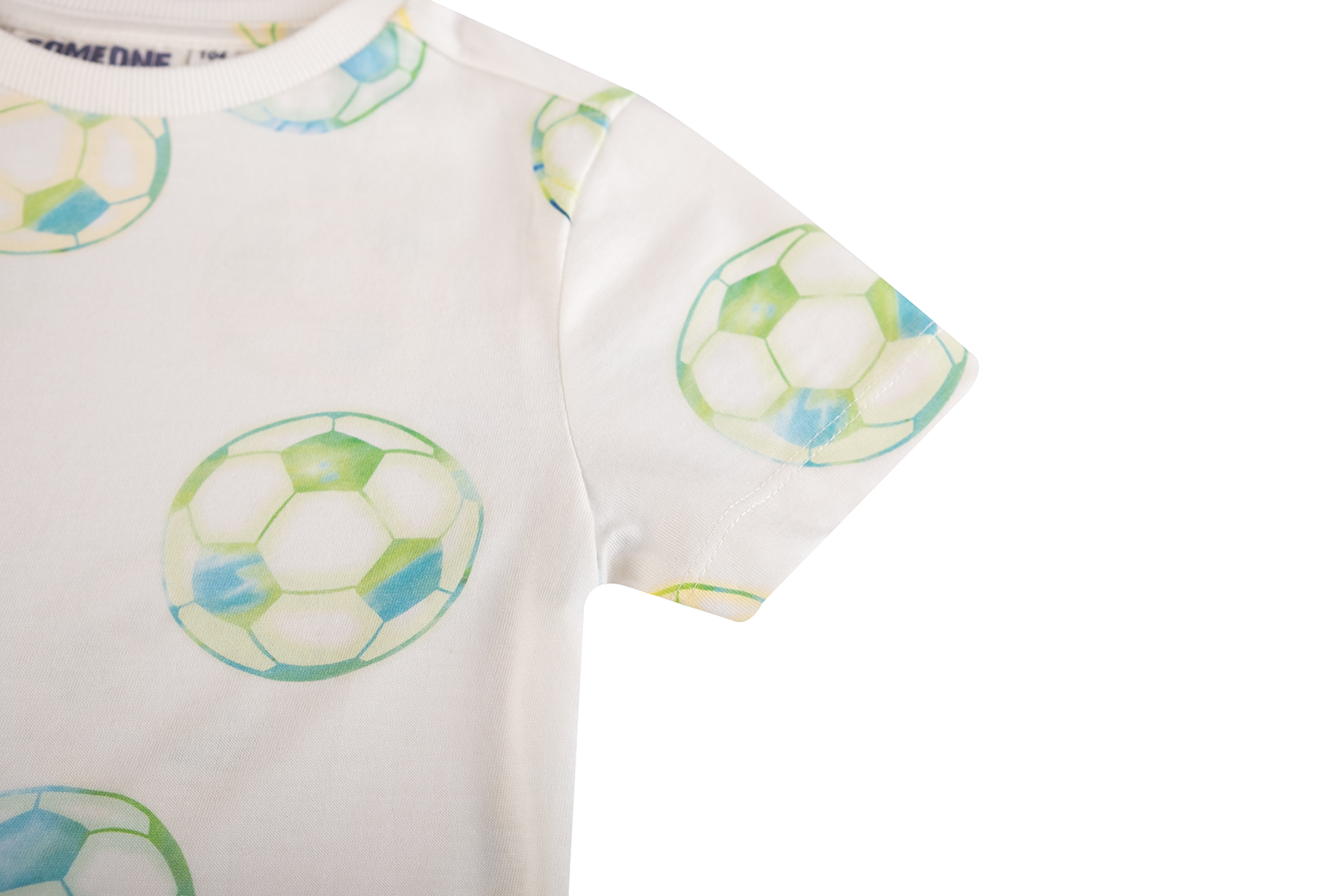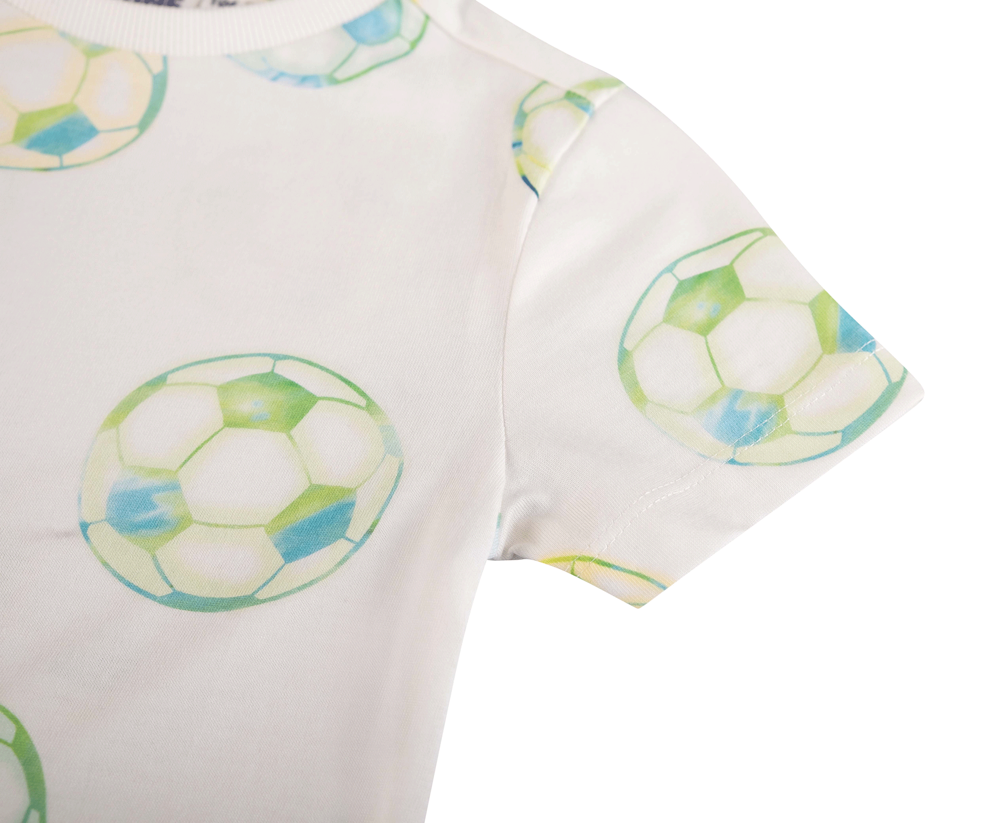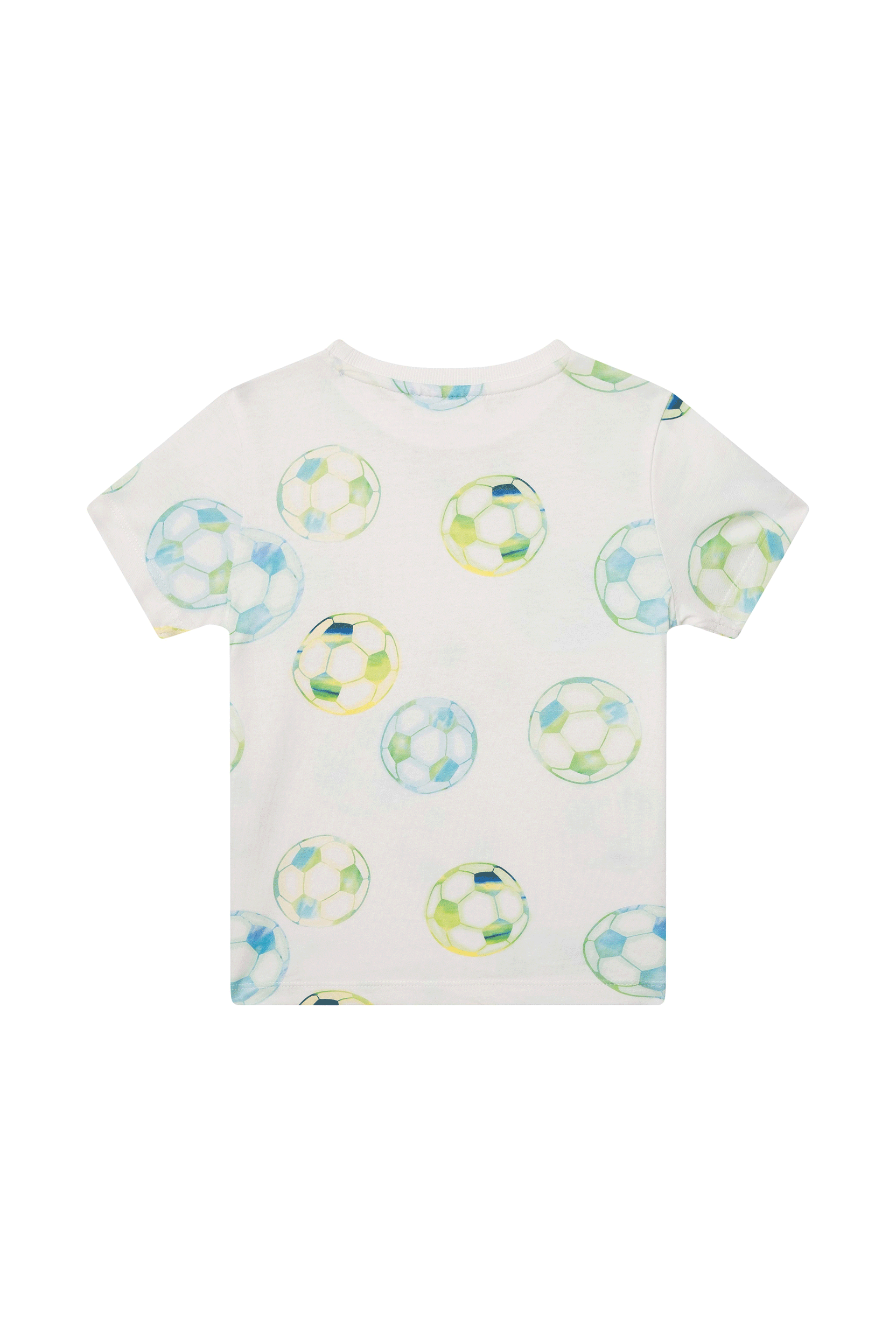 This T-shirt features a playful all-over print of footballs in fresh blue and green tones, giving it a sporty and cheerful look. The short sleeves and classic round neckline make it an easy-to-wear piece for everyday outfits. Ideal for young football fans who love to show their passion for the game through their clothing.