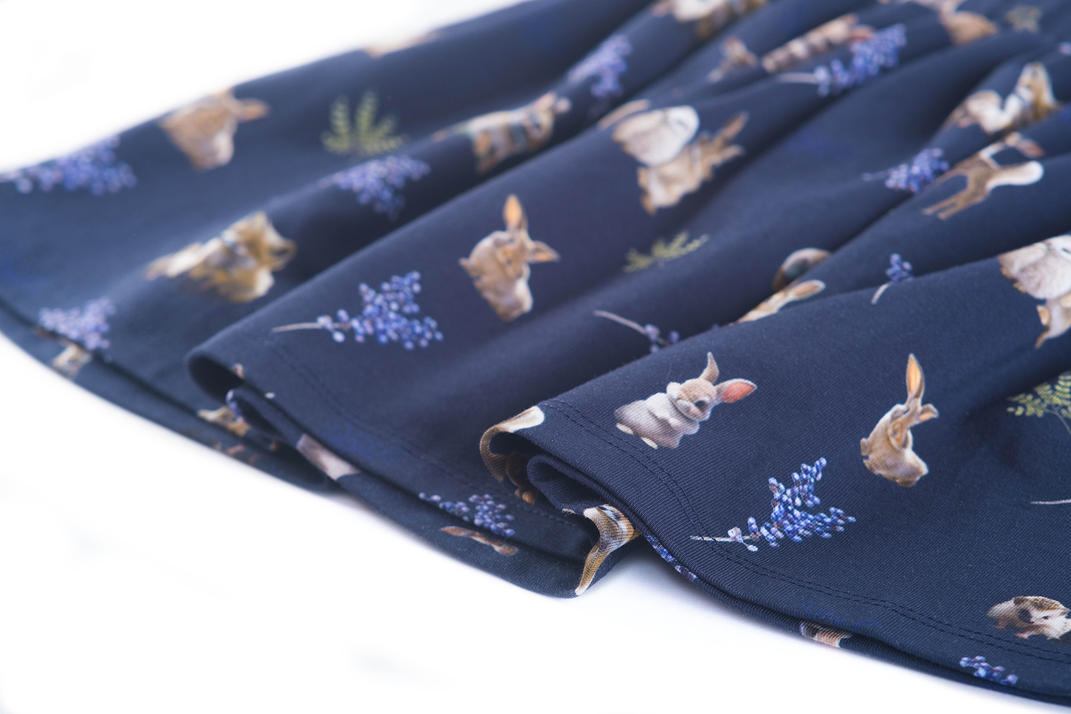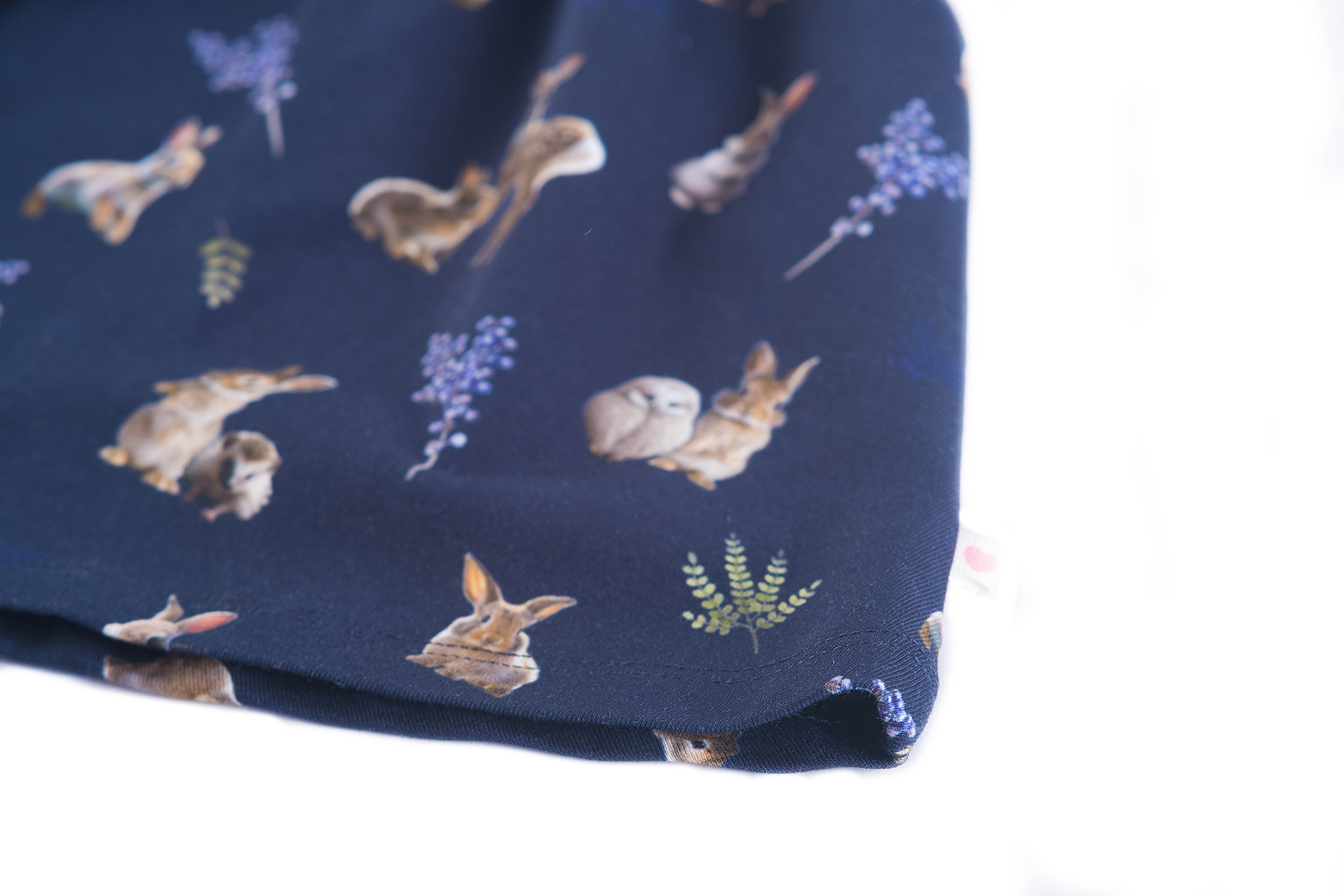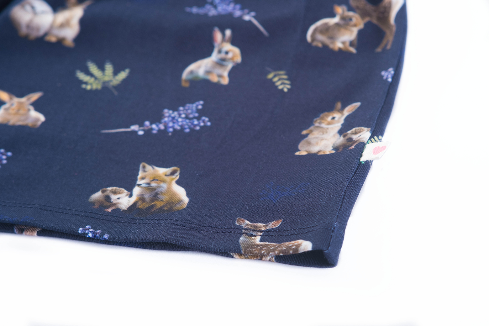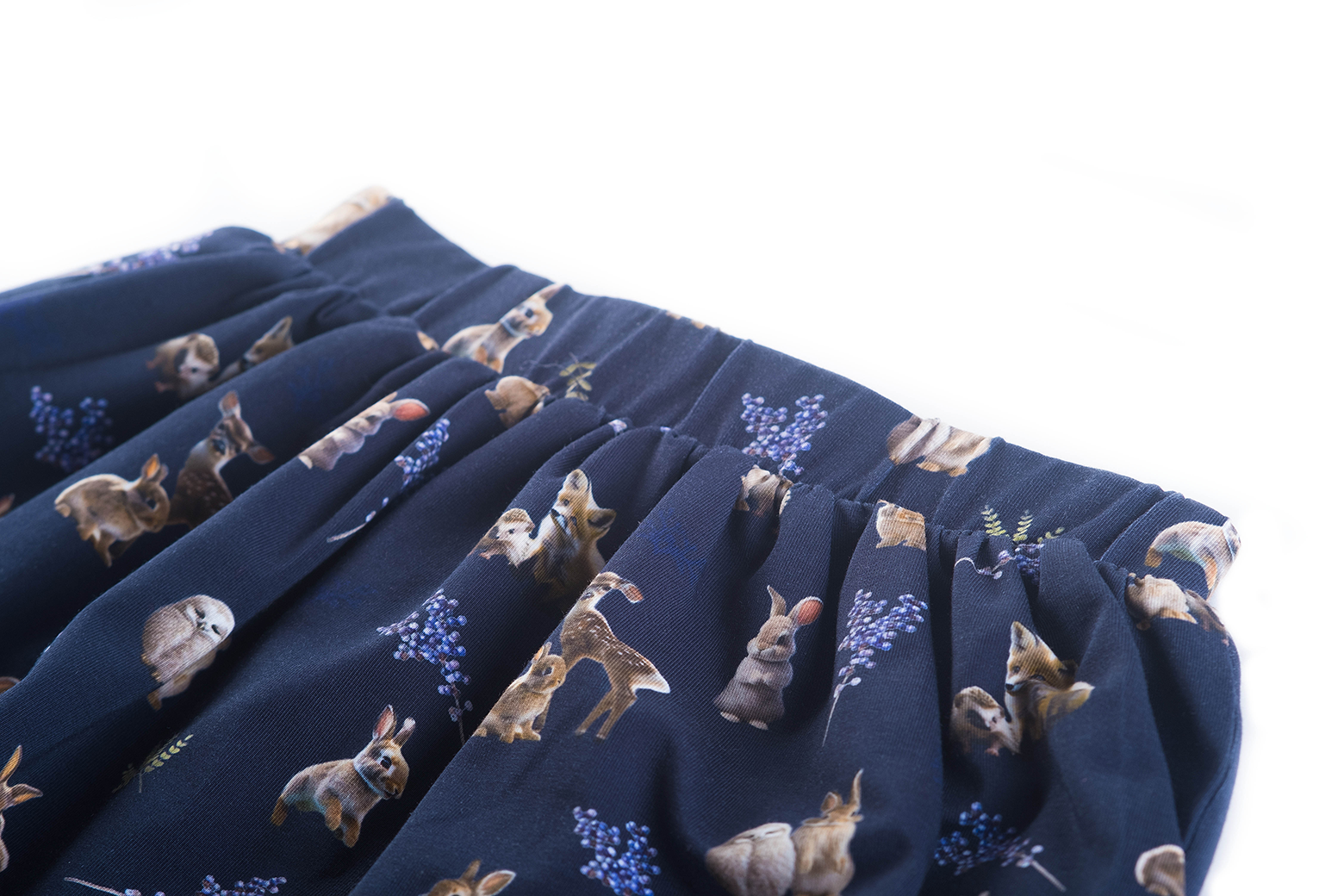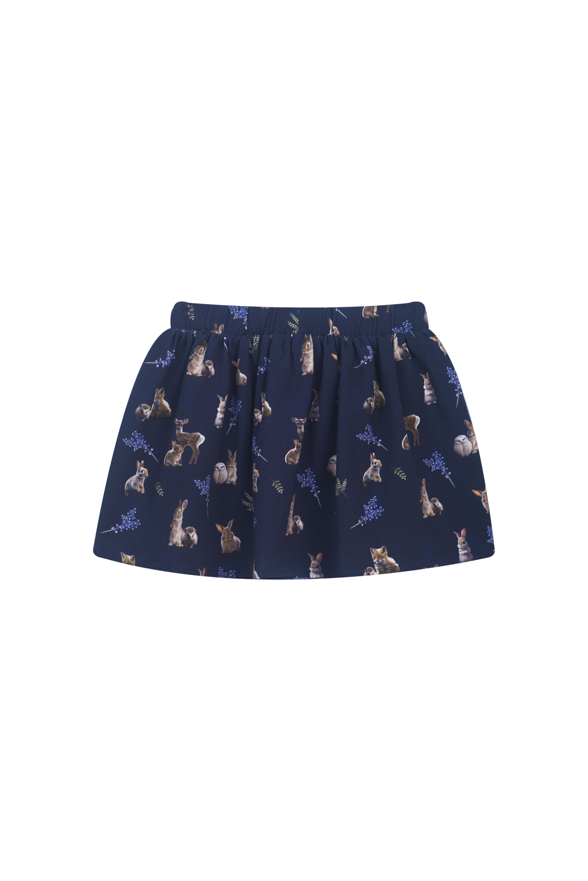 A charming skirt in a deep midnight blue shade, decorated with adorable forest animals like bunnies, fawns and little foxes. The soft, flowy fabric creates a lovely twirl, while the elastic waistband ensures a comfy and easy fit. A playful piece that adds a warm, woodland-inspired touch to any outfit.