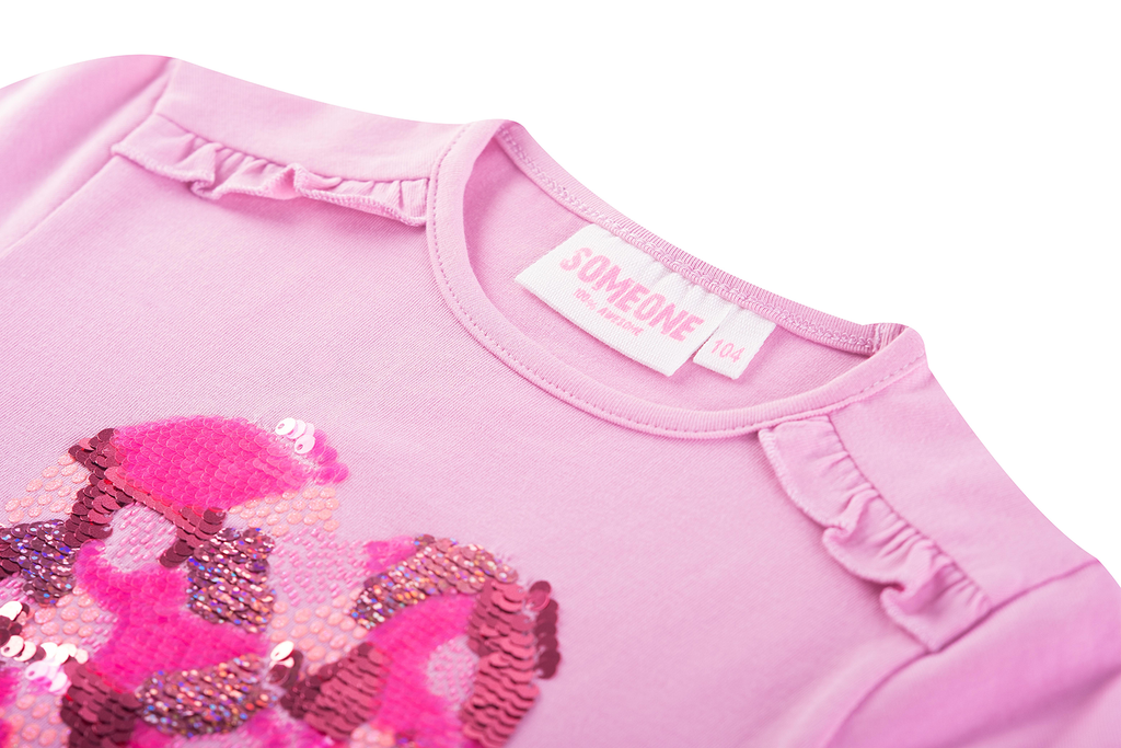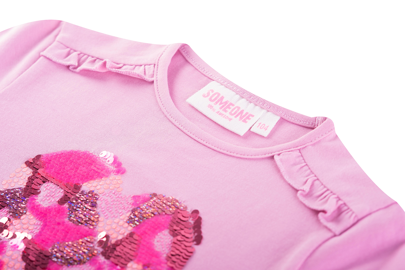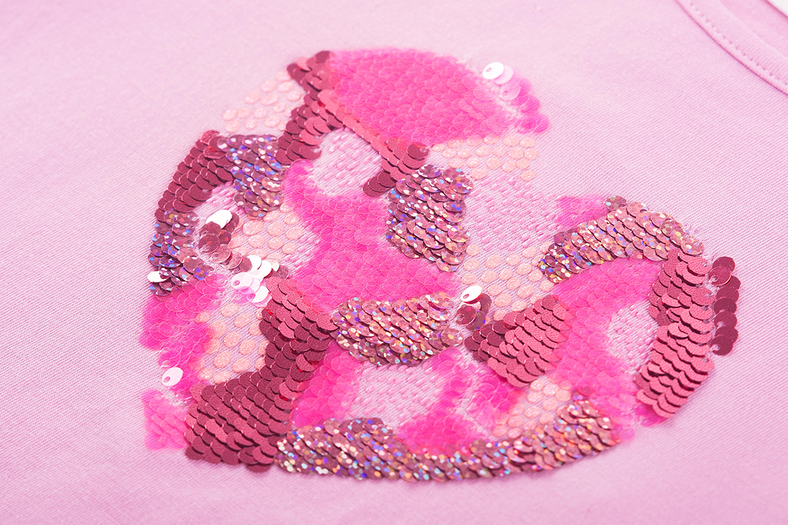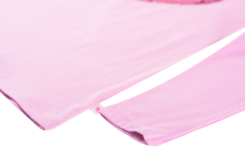 This pink long-sleeved top is a sparkling and stylish garment that instantly draws attention. At the center of the chest shines a large heart made of sequins in shades of pink, purple, and silver — a glittering focal point that comes alive with every movement. The delicate ruffles on the shoulders add a graceful touch and create a playful silhouette. Perfect for girls who love a bit of glamour in their everyday outfit. A top that blends softness, color, and celebration in one design.