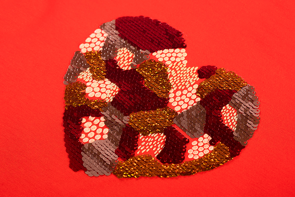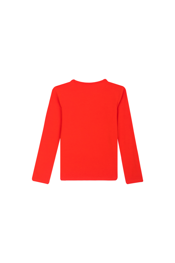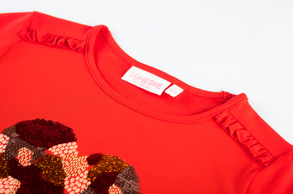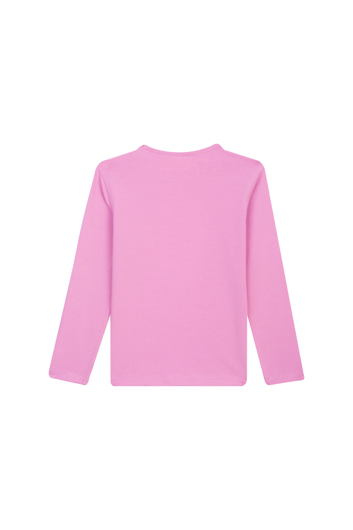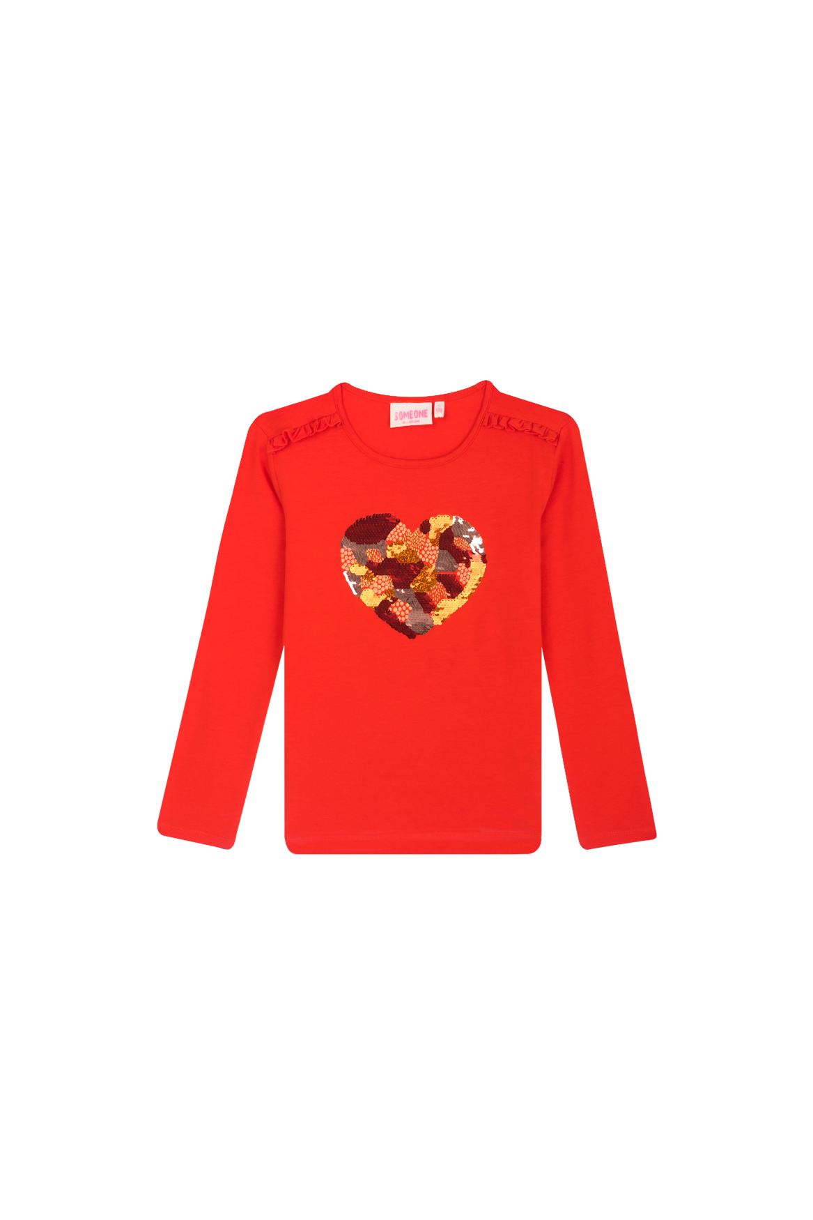 This pink long-sleeved top is a sparkling and stylish garment that instantly draws attention. At the center of the chest shines a large heart made of sequins in shades of pink, purple, and silver — a glittering focal point that comes alive with every movement. The delicate ruffles on the shoulders add a graceful touch and create a playful silhouette. Perfect for girls who love a bit of glamour in their everyday outfit. A top that blends softness, color, and celebration in one design.
