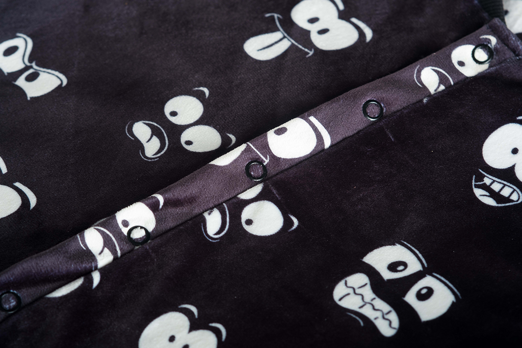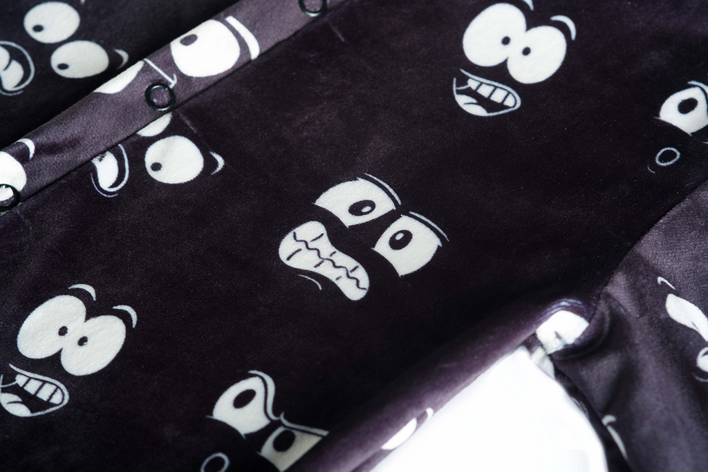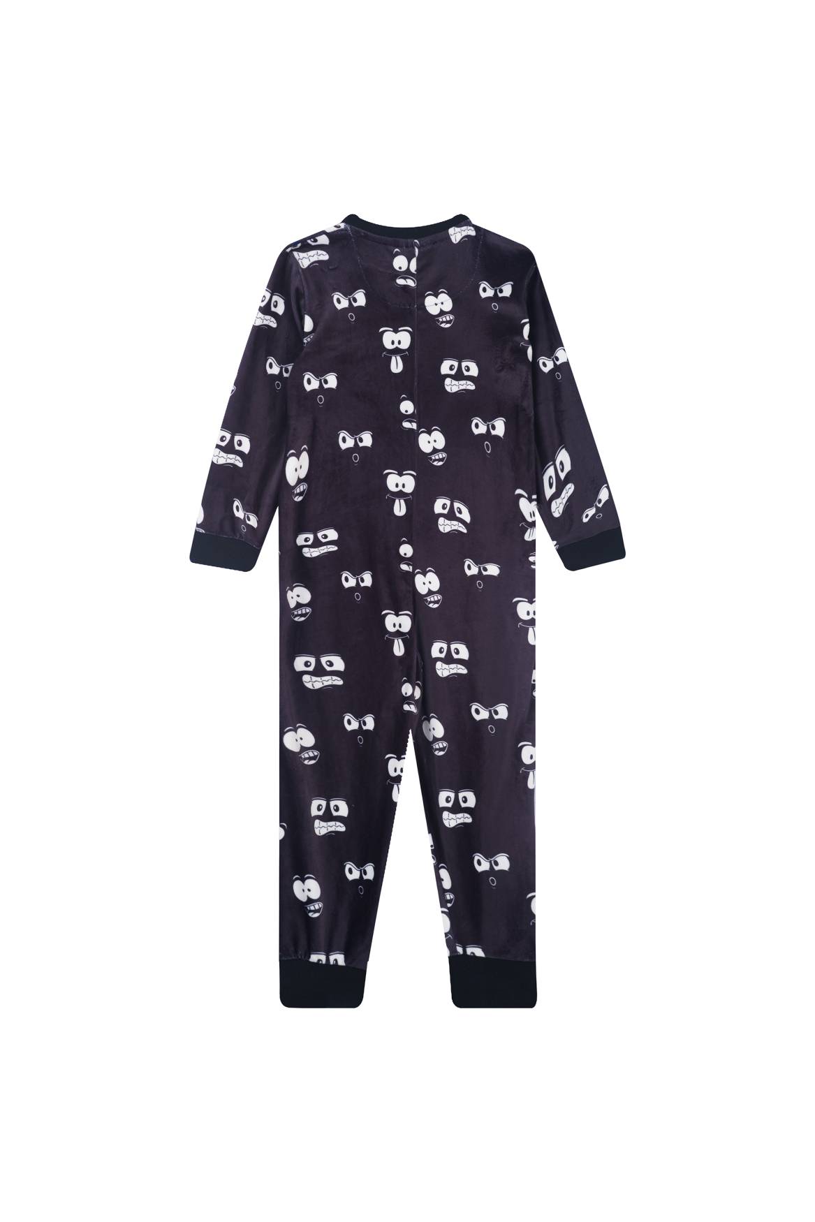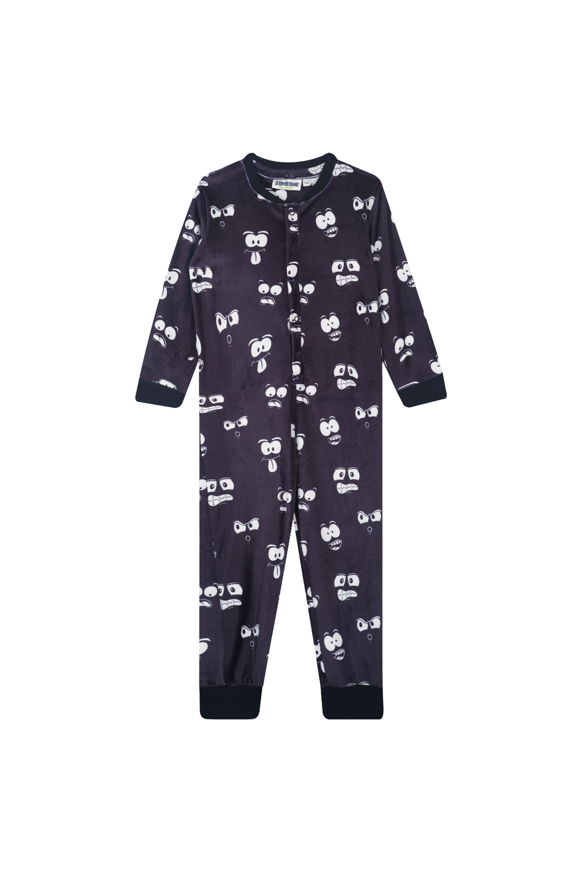 This dark-colored one-piece pajama is a true eye-catcher full of humor and playfulness. The design features a pattern of white cartoon-style faces with wide eyes, open mouths, and silly expressions — from tongues sticking out to surprised looks. Black cuffs on the sleeves and legs provide a neat finish, while the front button closure makes dressing easy. A pajama that promises fun, perfect for kids with vivid imaginations and a love for quirky prints.