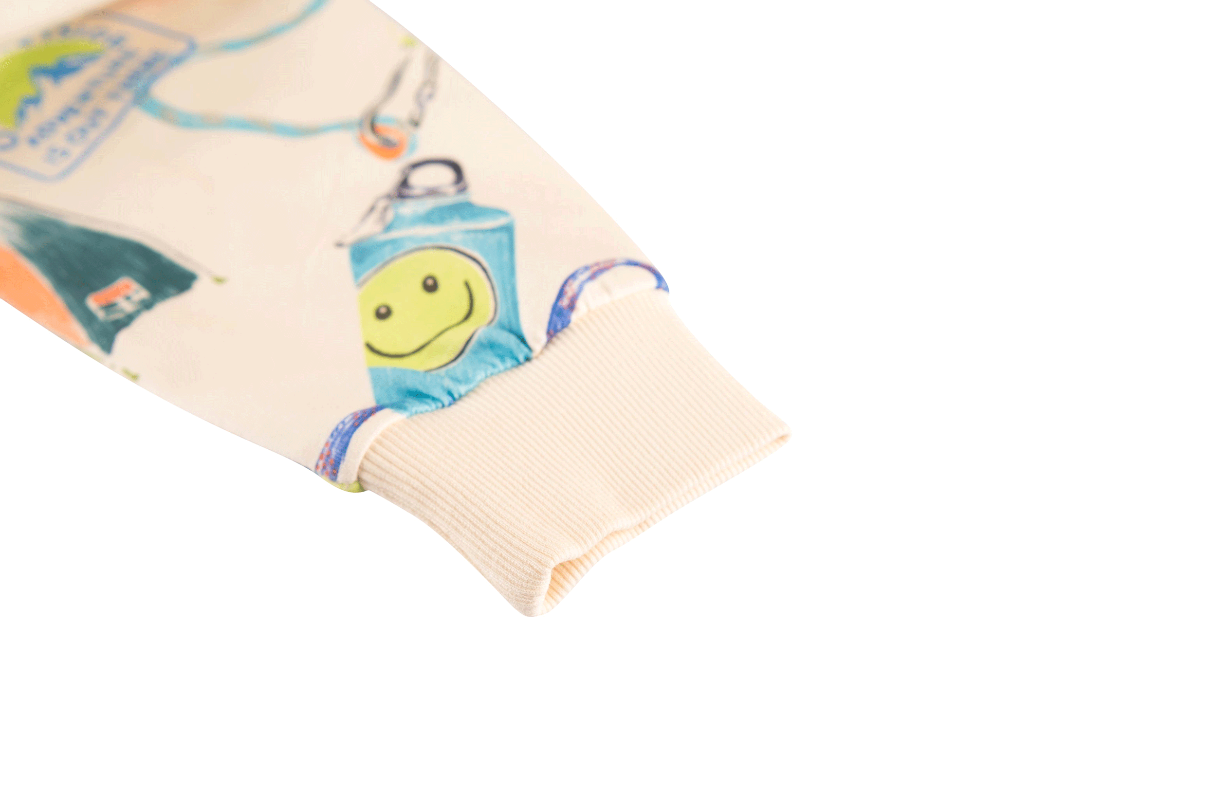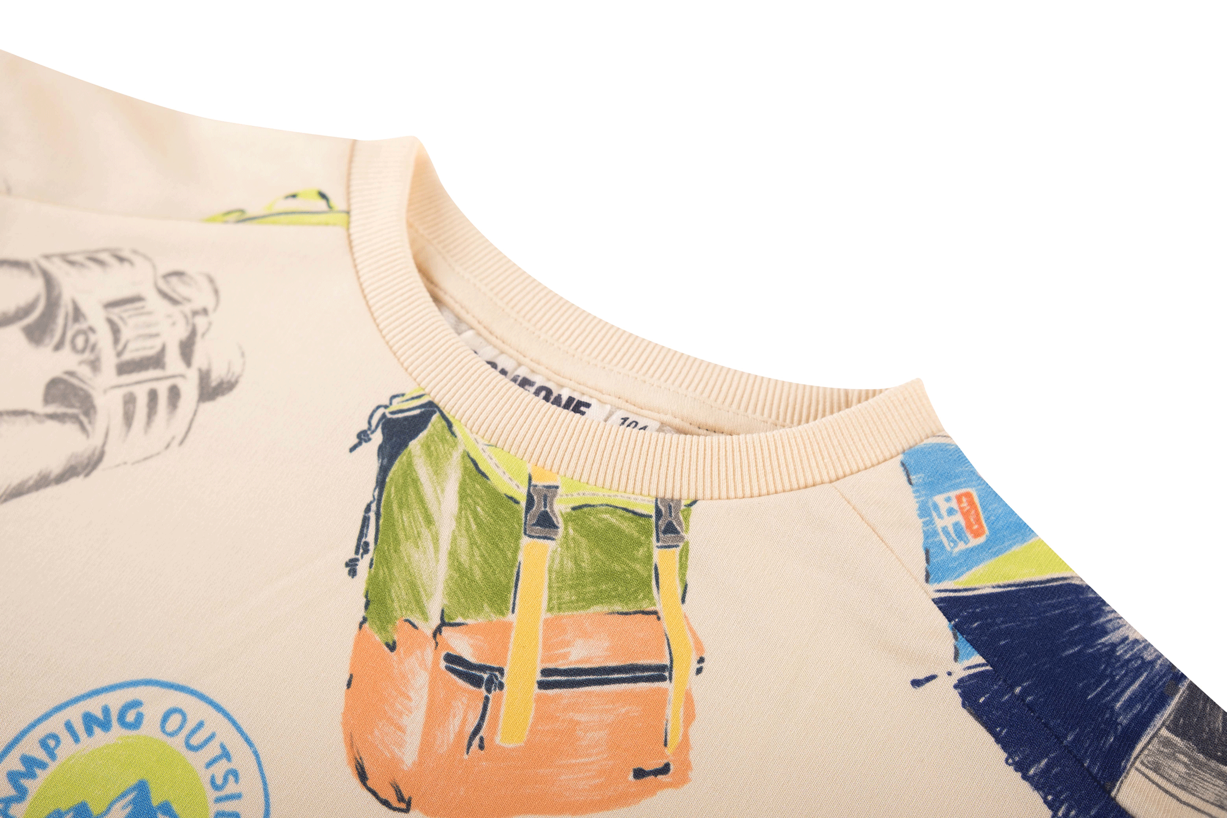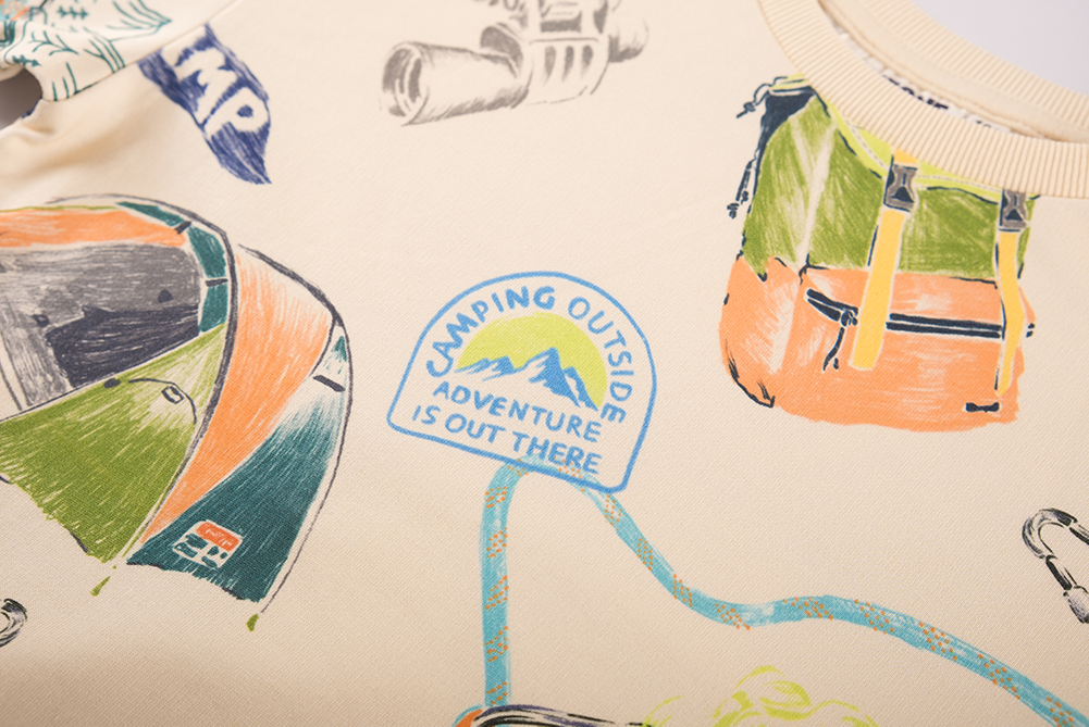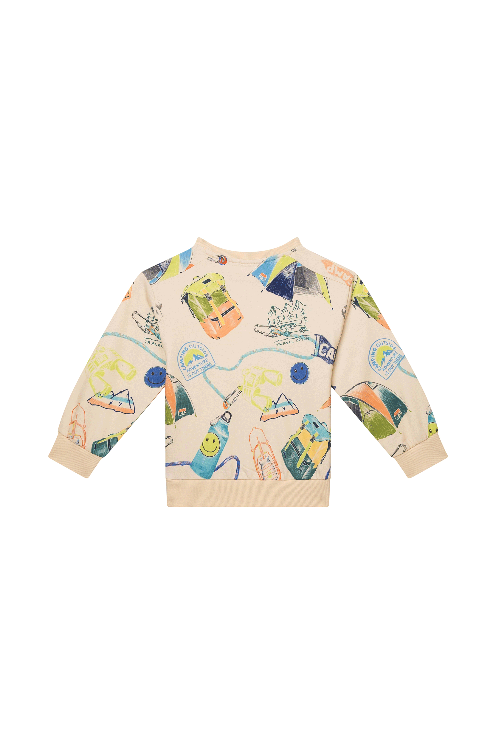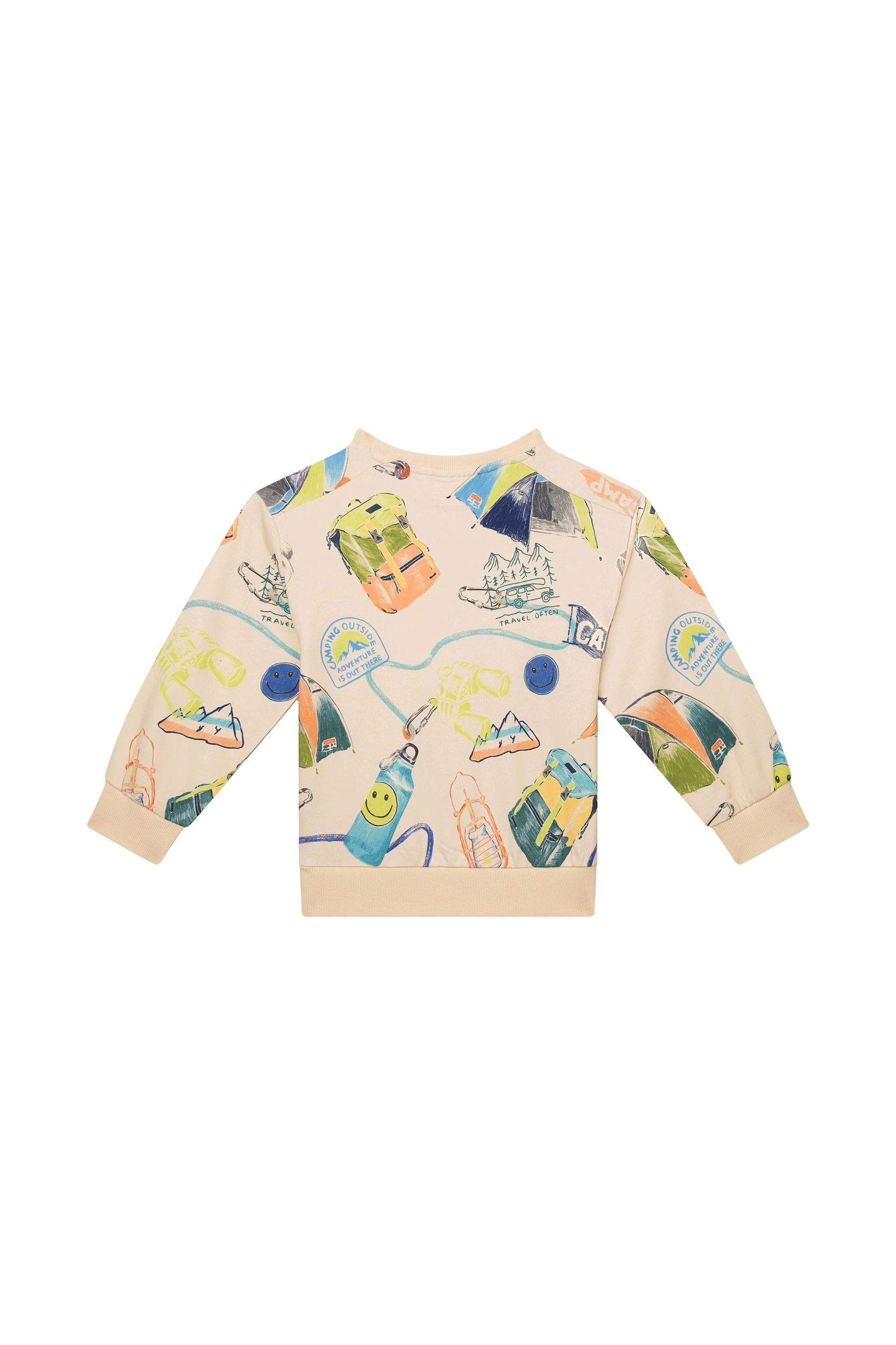 This cheerful sweater is bursting with color and adventure thanks to the all-over print featuring tents, binoculars, jeeps, and other camping icons. The cream base makes all the illustrations stand out, creating a playful and energetic look. Perfect for young explorers who love wearing an outfit with personality and an adventurous touch.
