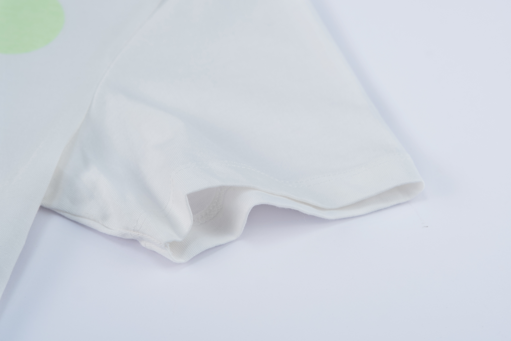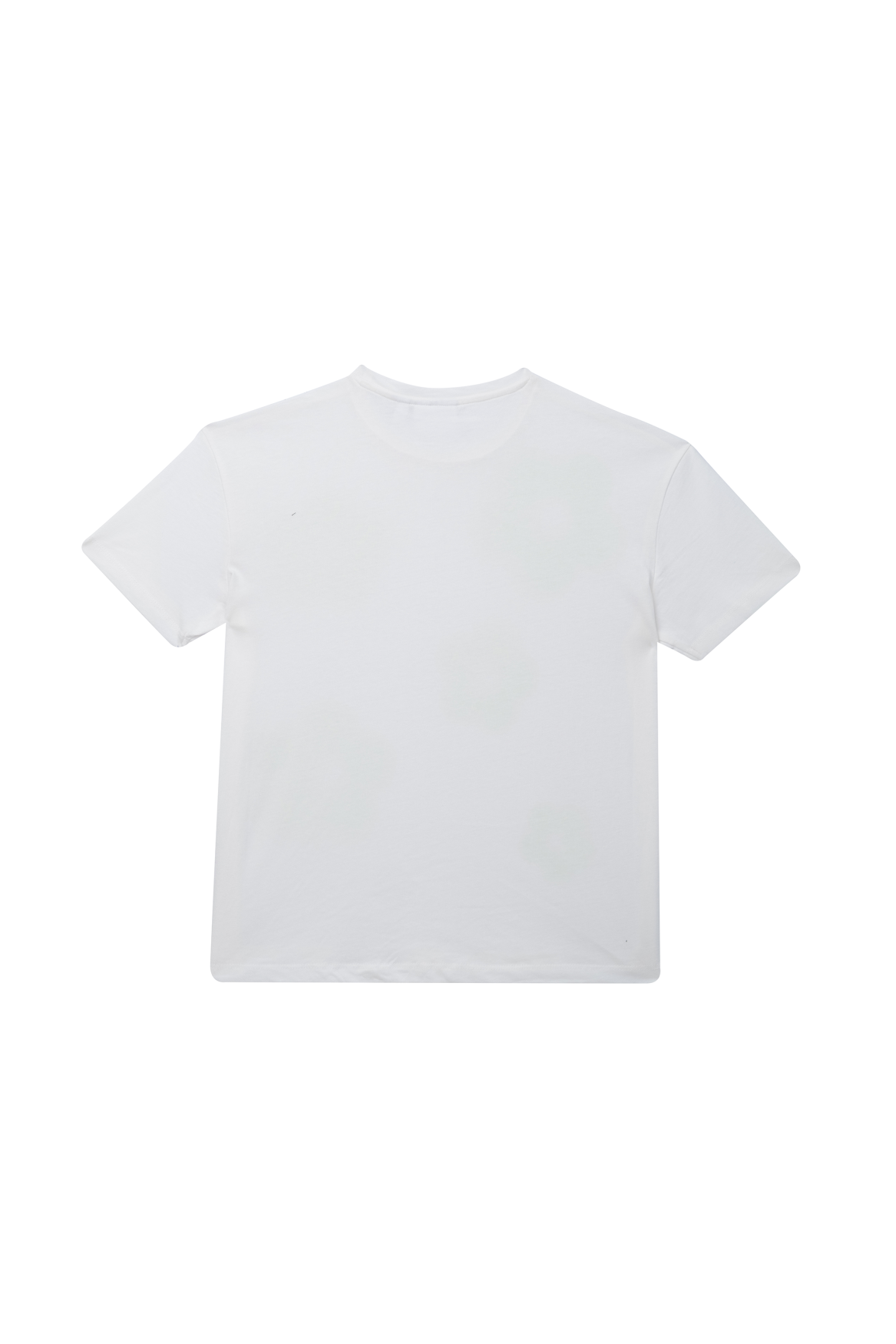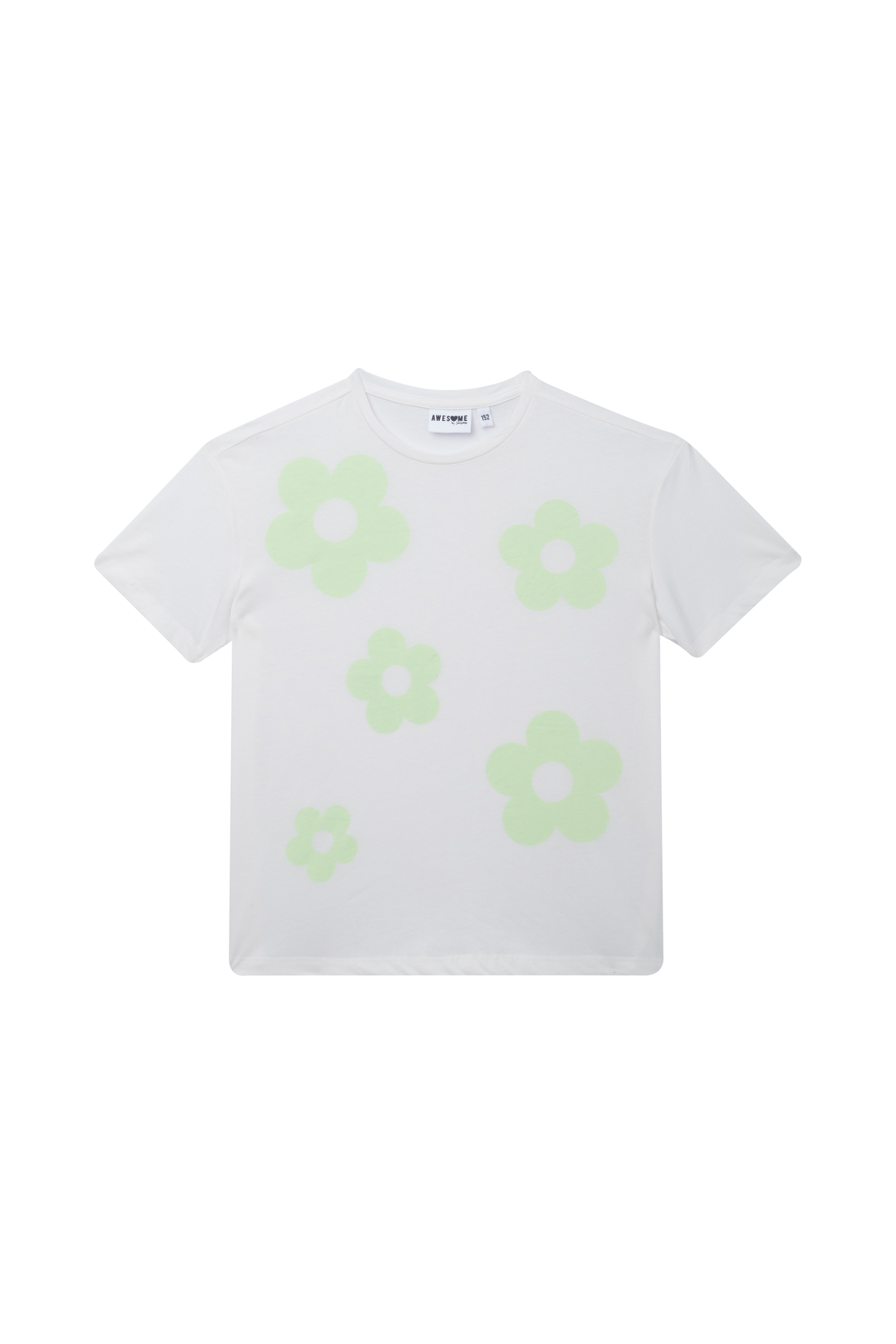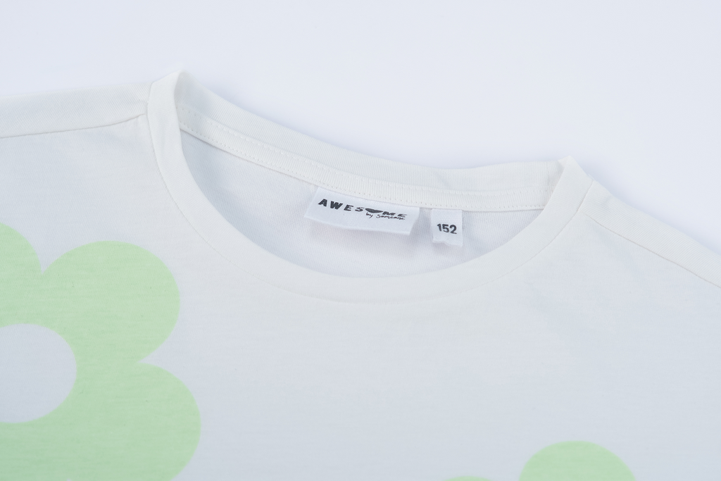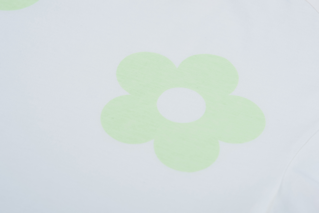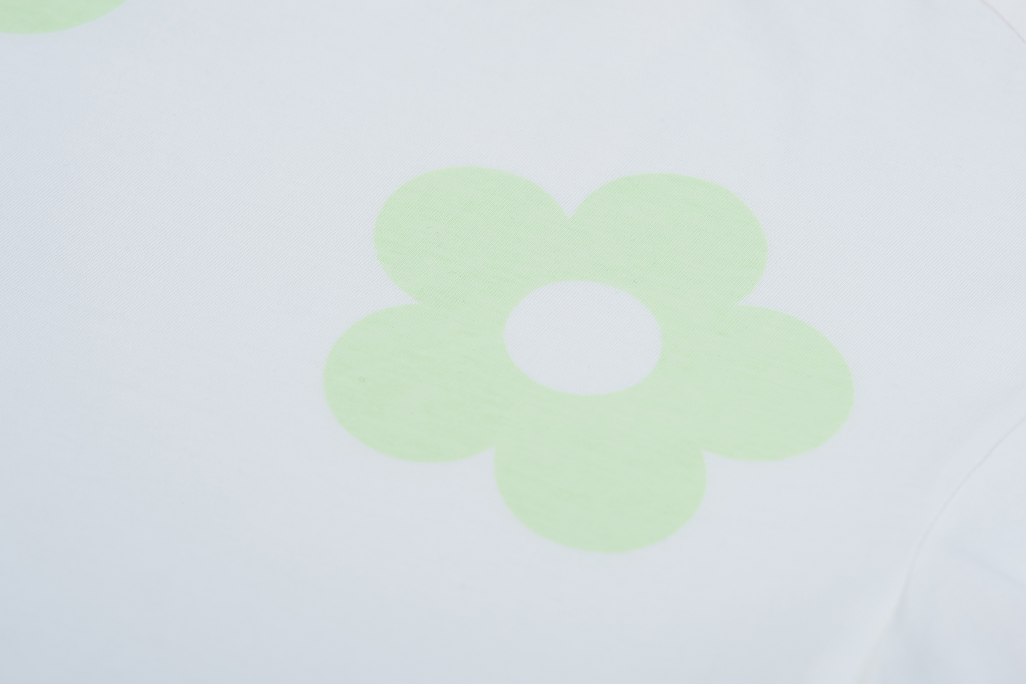 This white T-shirt is a fresh and playful addition to any child’s wardrobe. The front features five light green flowers scattered across the fabric, each with rounded petals and a circular center — a cheerful and airy motif that adds charm to the design. With its crew neckline and short sleeves, this shirt is perfect for sunny days and a bright, upbeat look.