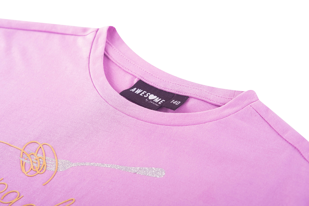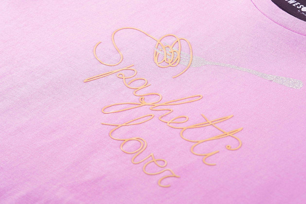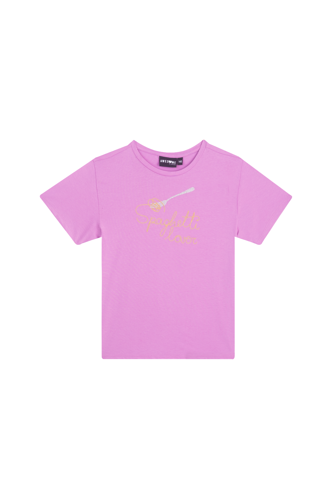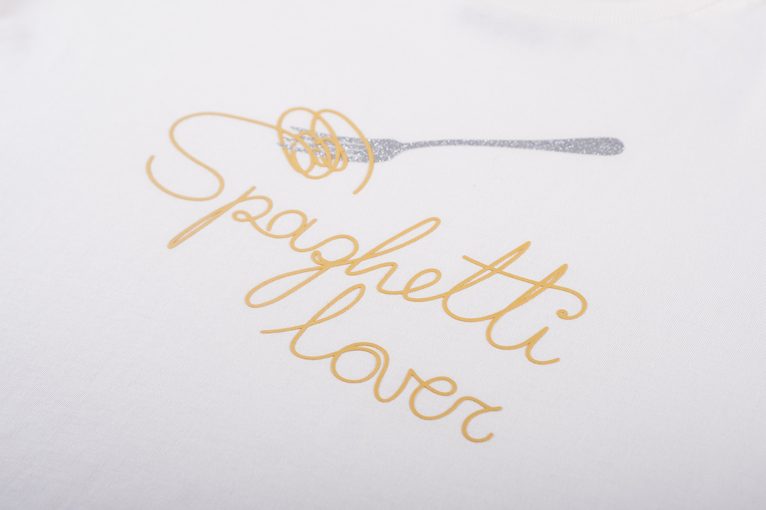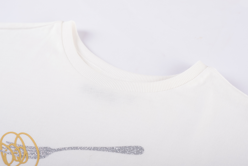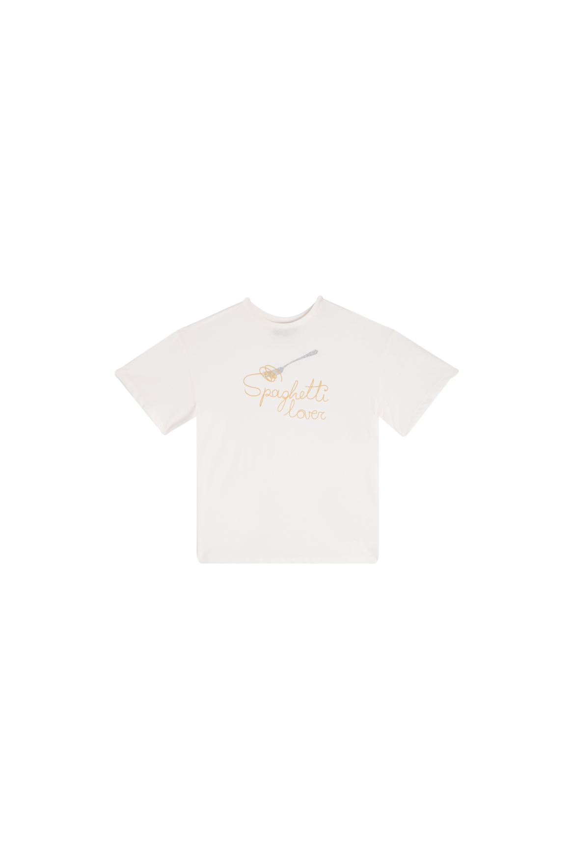 This white T-shirt features a playful and stylish “Spaghetti Lover” print, including a fork twirling spaghetti in soft golden tones. Its minimalist design gives it a fresh and cheerful look, perfect for kids who enjoy fun and comfortable fashion.