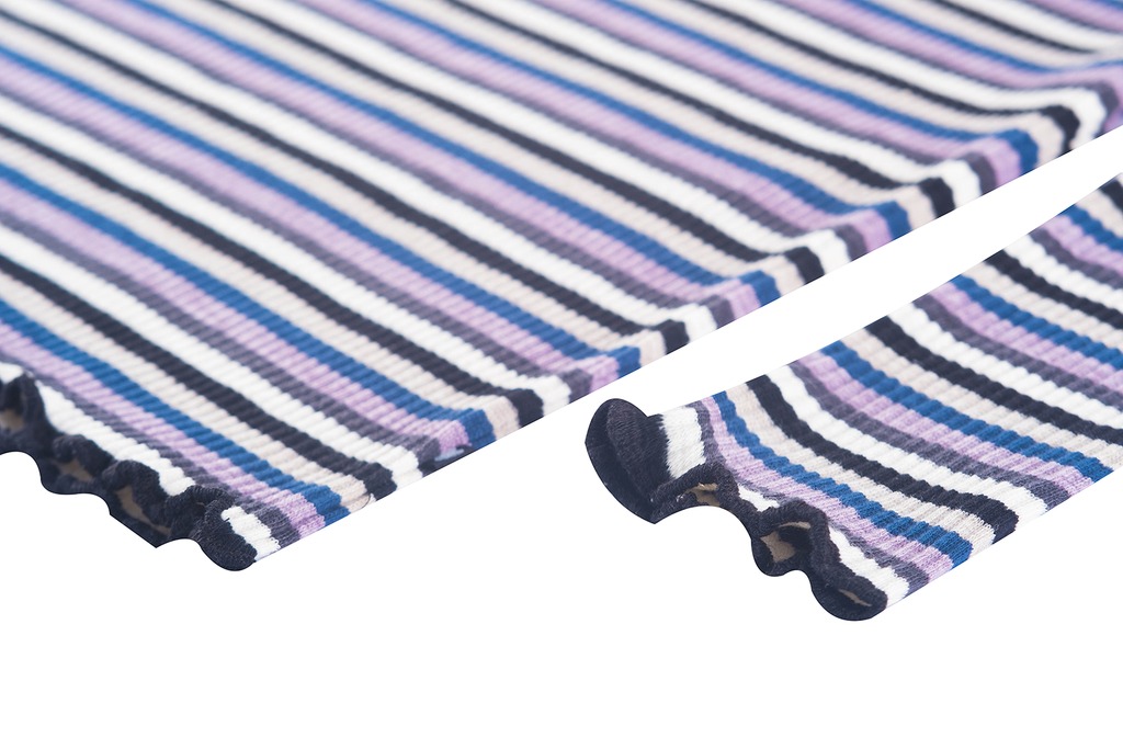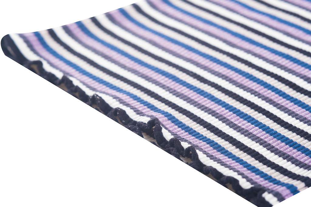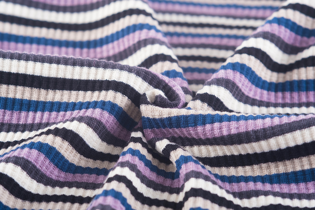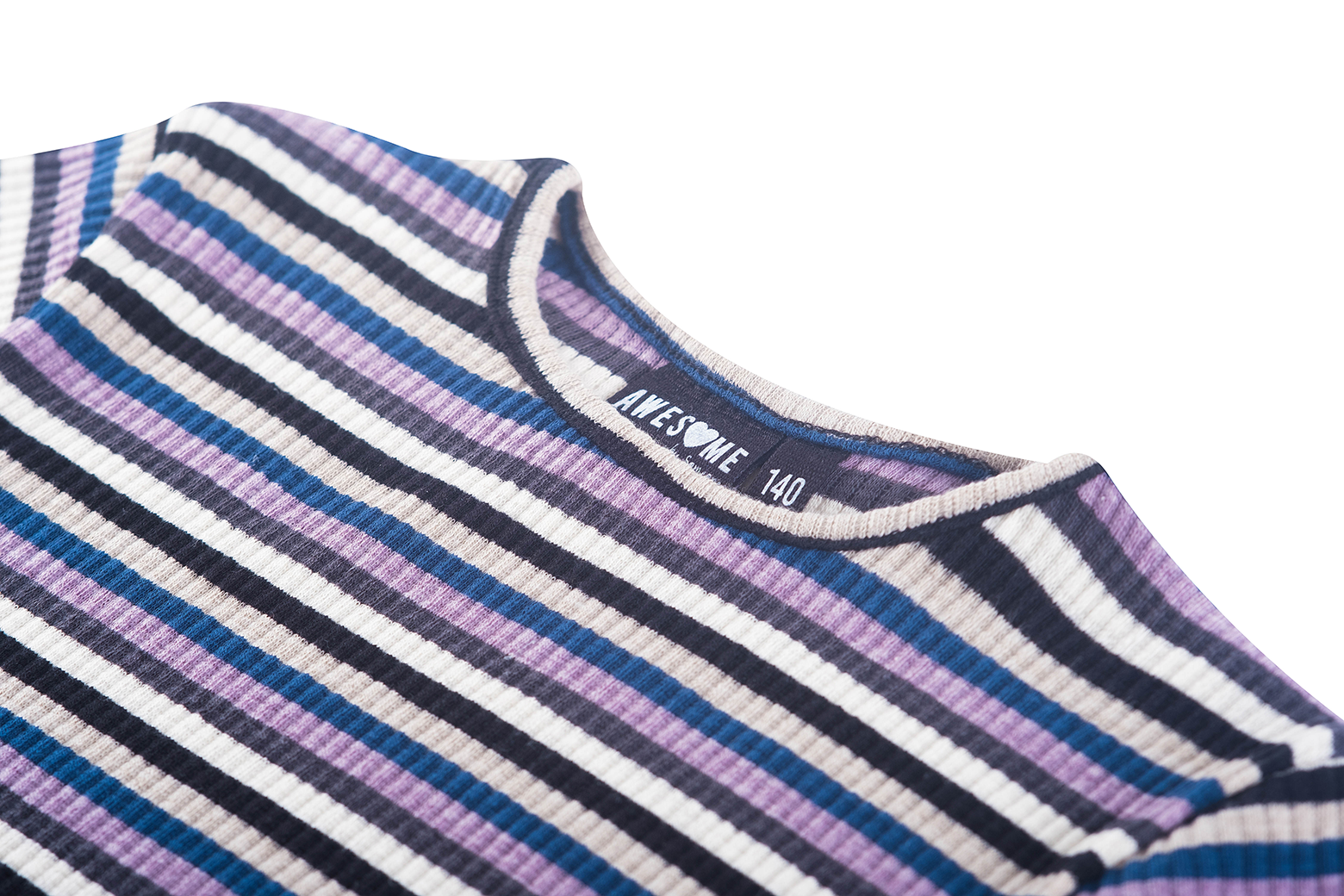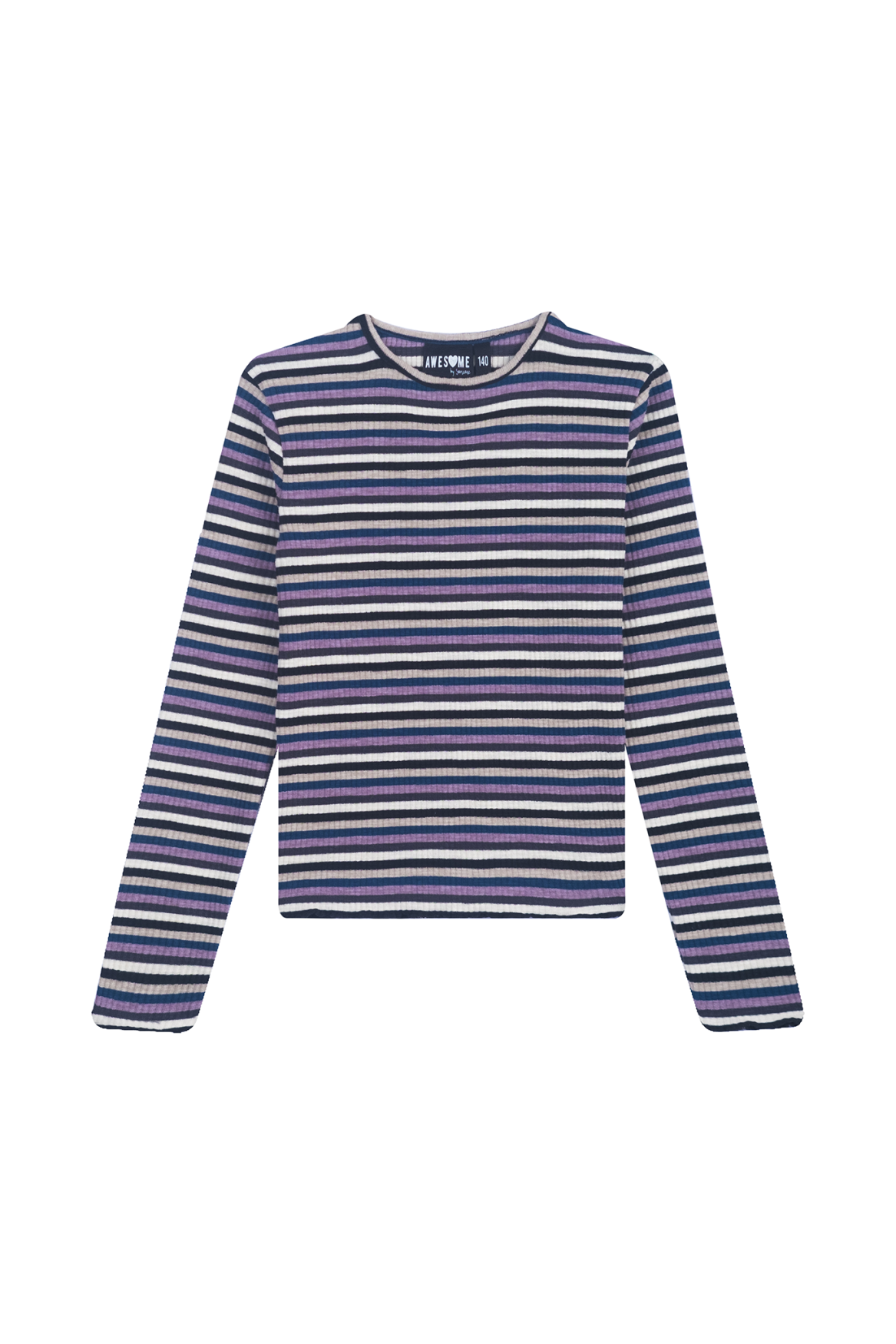 This soft and stretchy ribbed longsleeve features a clean striped pattern in purple, navy, and white. The slim fit and classic round neckline make it easy to combine with jeans or skirts for a casual everyday look.