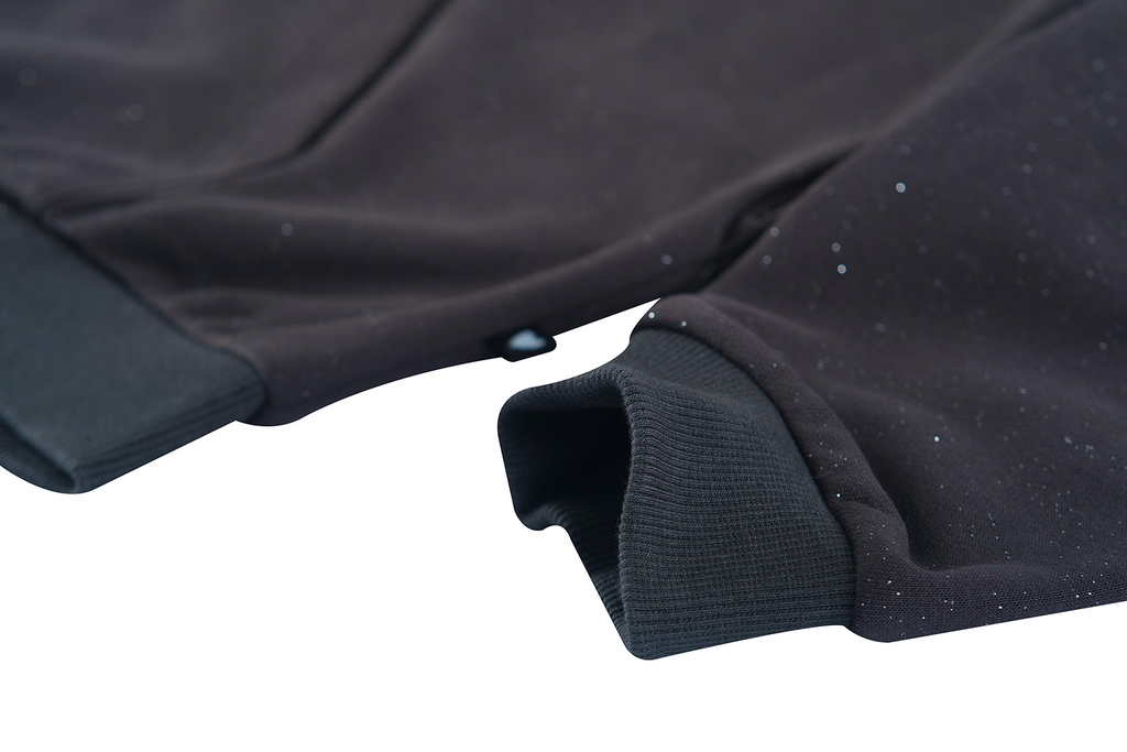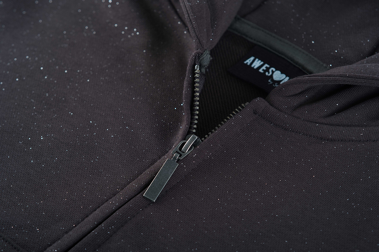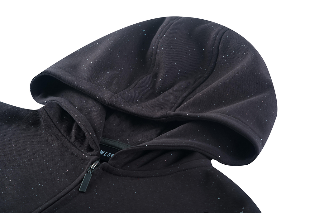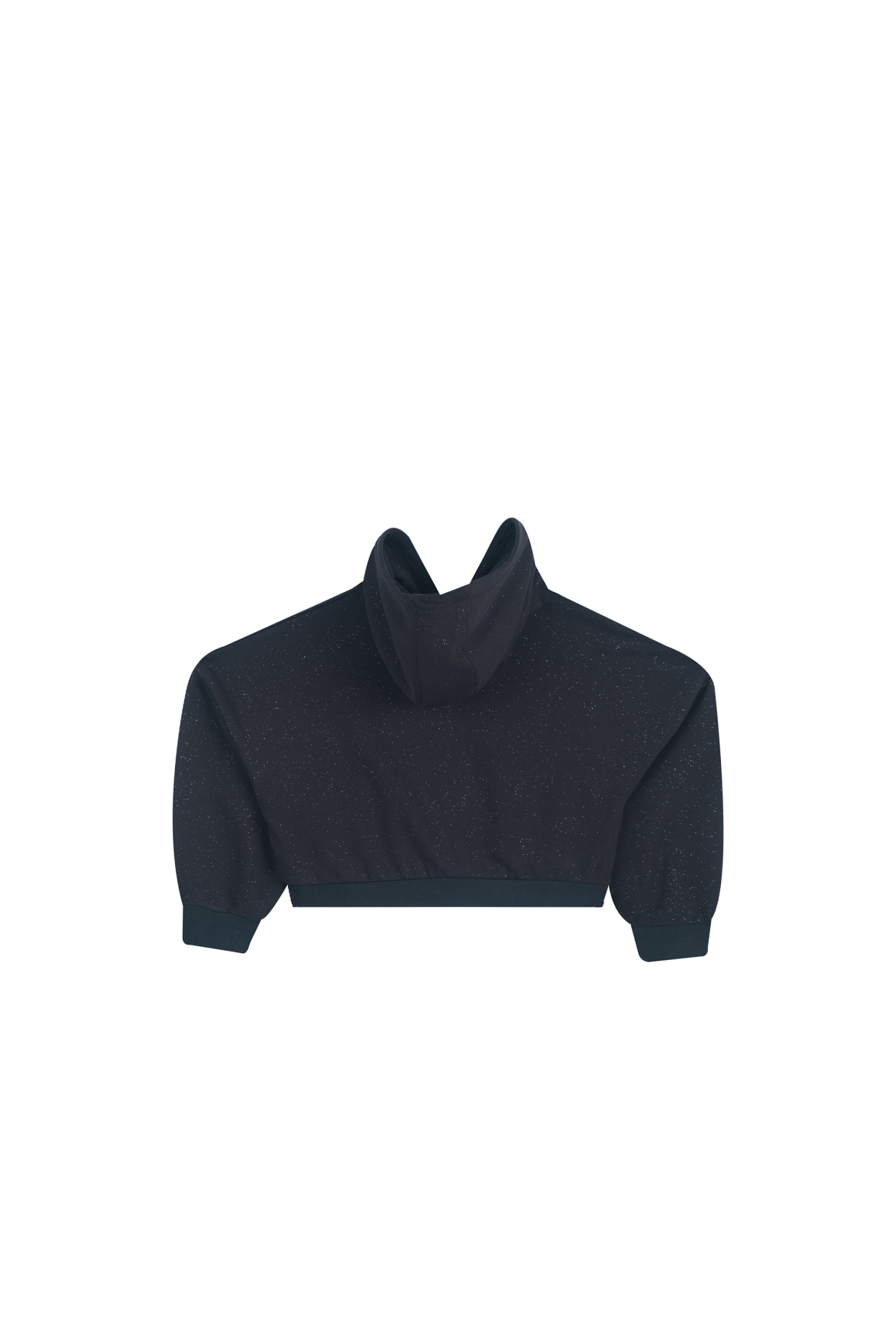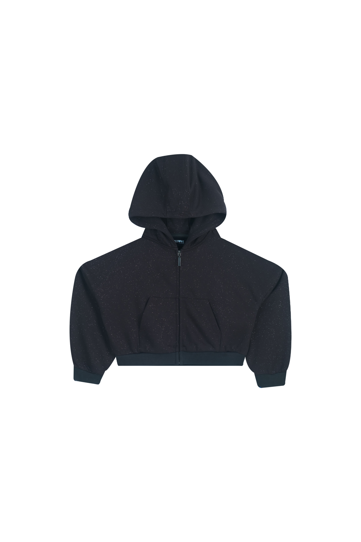 This black cropped hoodie with a subtle speckled pattern is a modern and versatile addition to any wardrobe. The cropped fit creates a trendy, sporty look, while the comfortable design makes it ideal for everyday wear. The hood and zipper add practicality and easy styling. Perfect to pair with high-waisted bottoms or a casual outfit for a stylish, contemporary look.