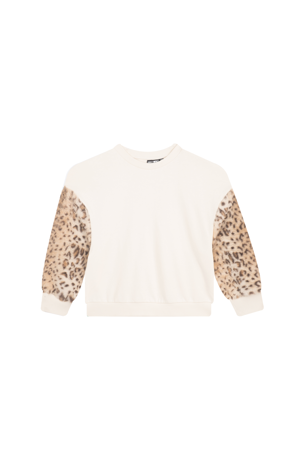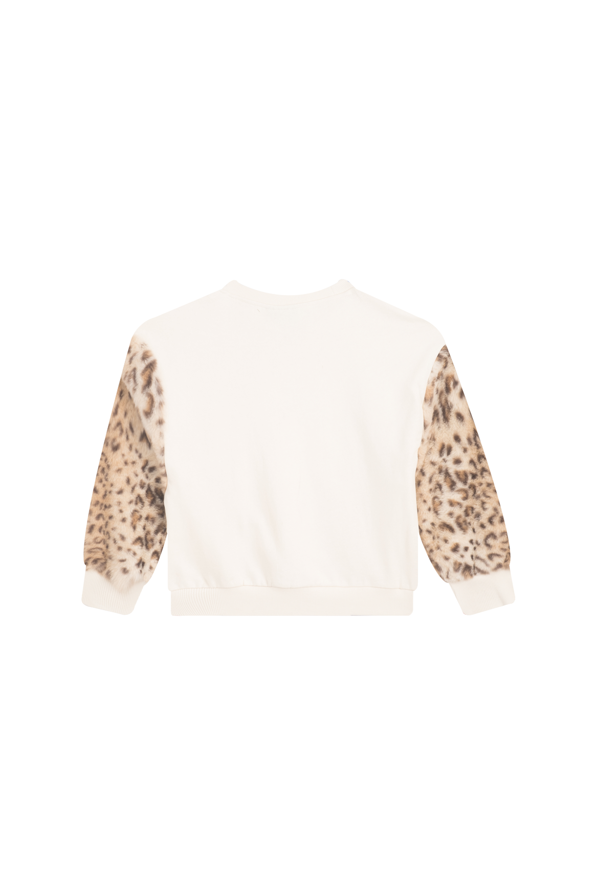 This cream-colored sweater with leopard-print sleeves is a stylish and eye-catching addition to any outfit. The soft, plain body contrasts beautifully with the playful animal print on the sleeves, creating a modern and trendy look. With its comfortable fit and ribbed hems, this sweater is perfect for everyday wear. Ideal to pair with jeans, leggings, or a casual outfit for a bold and fashionable finish.