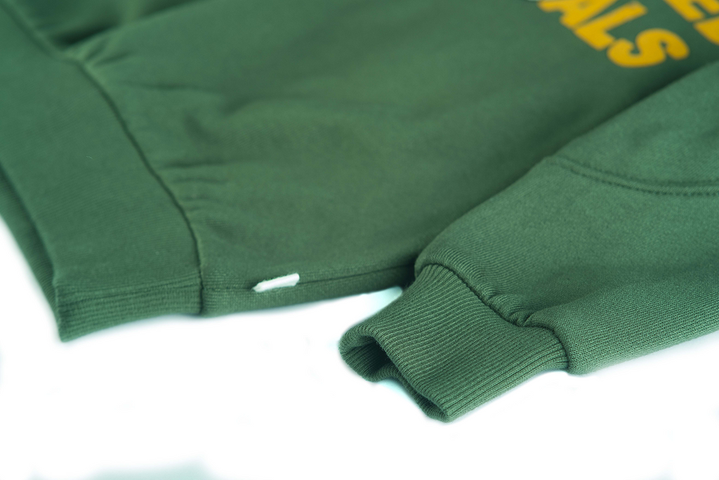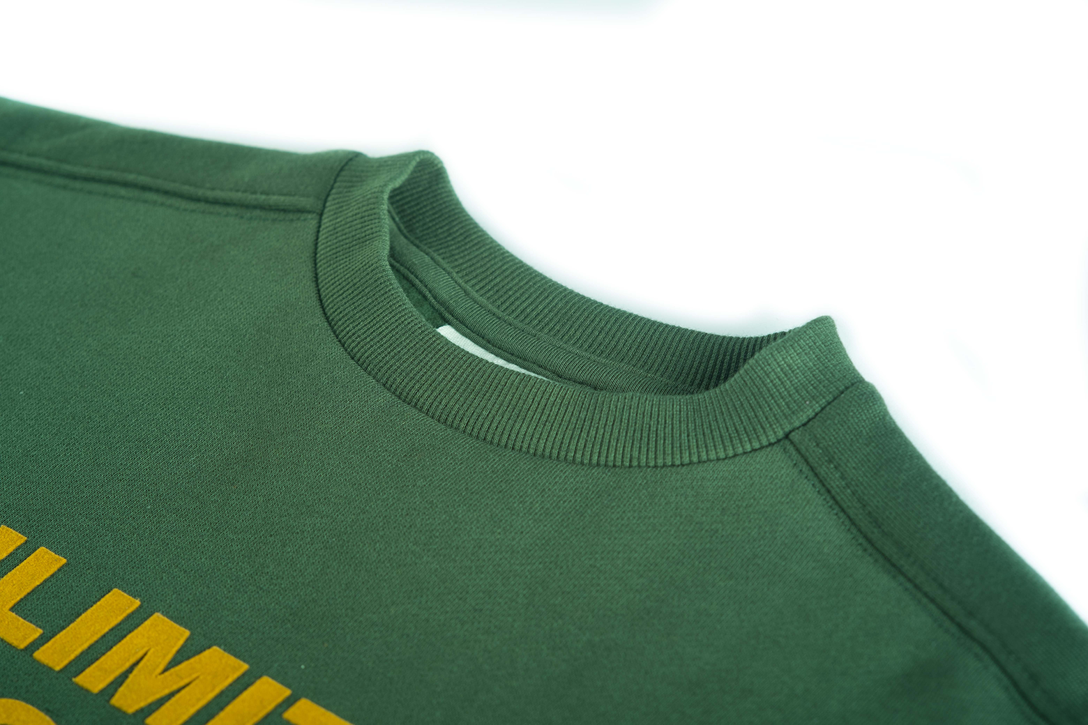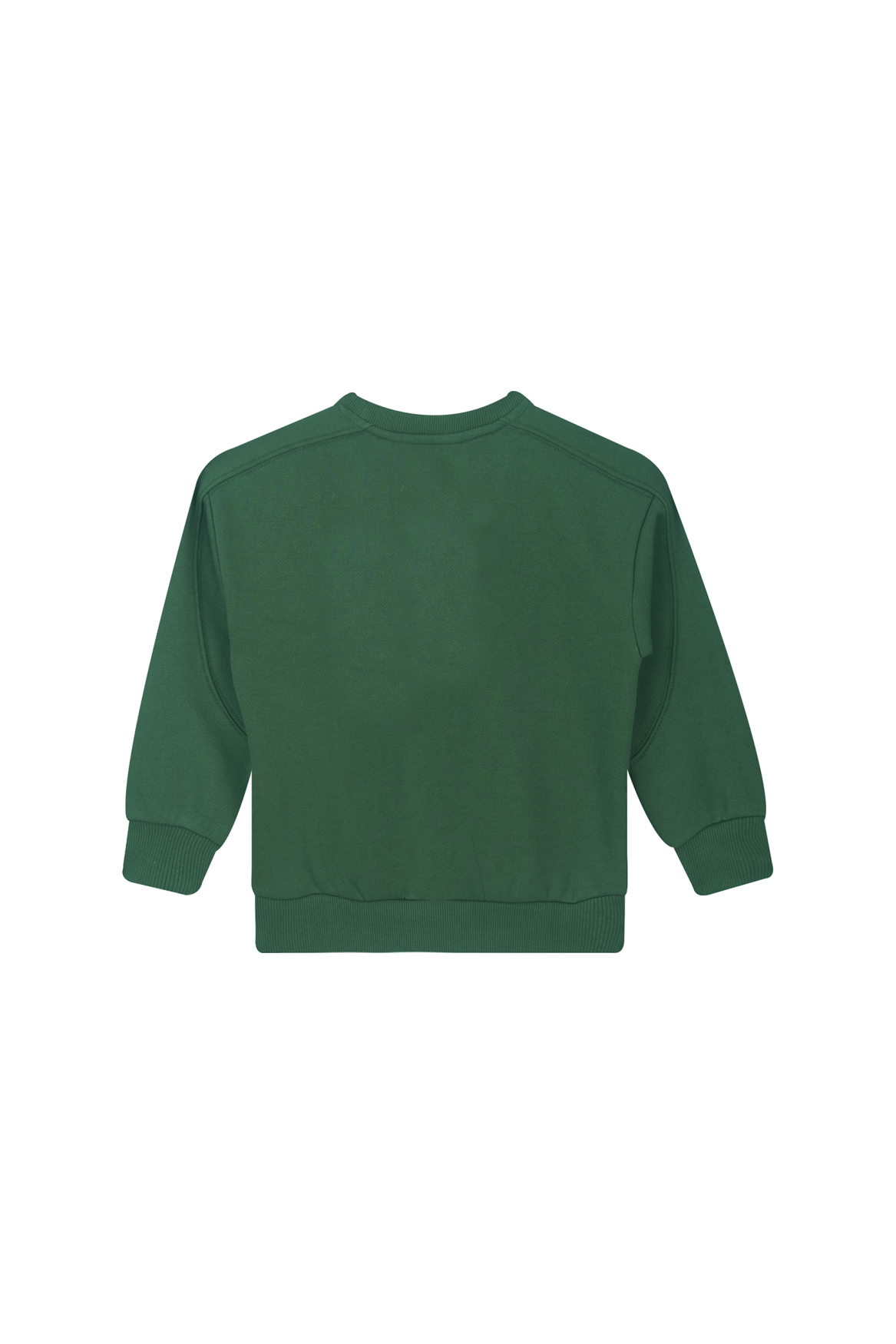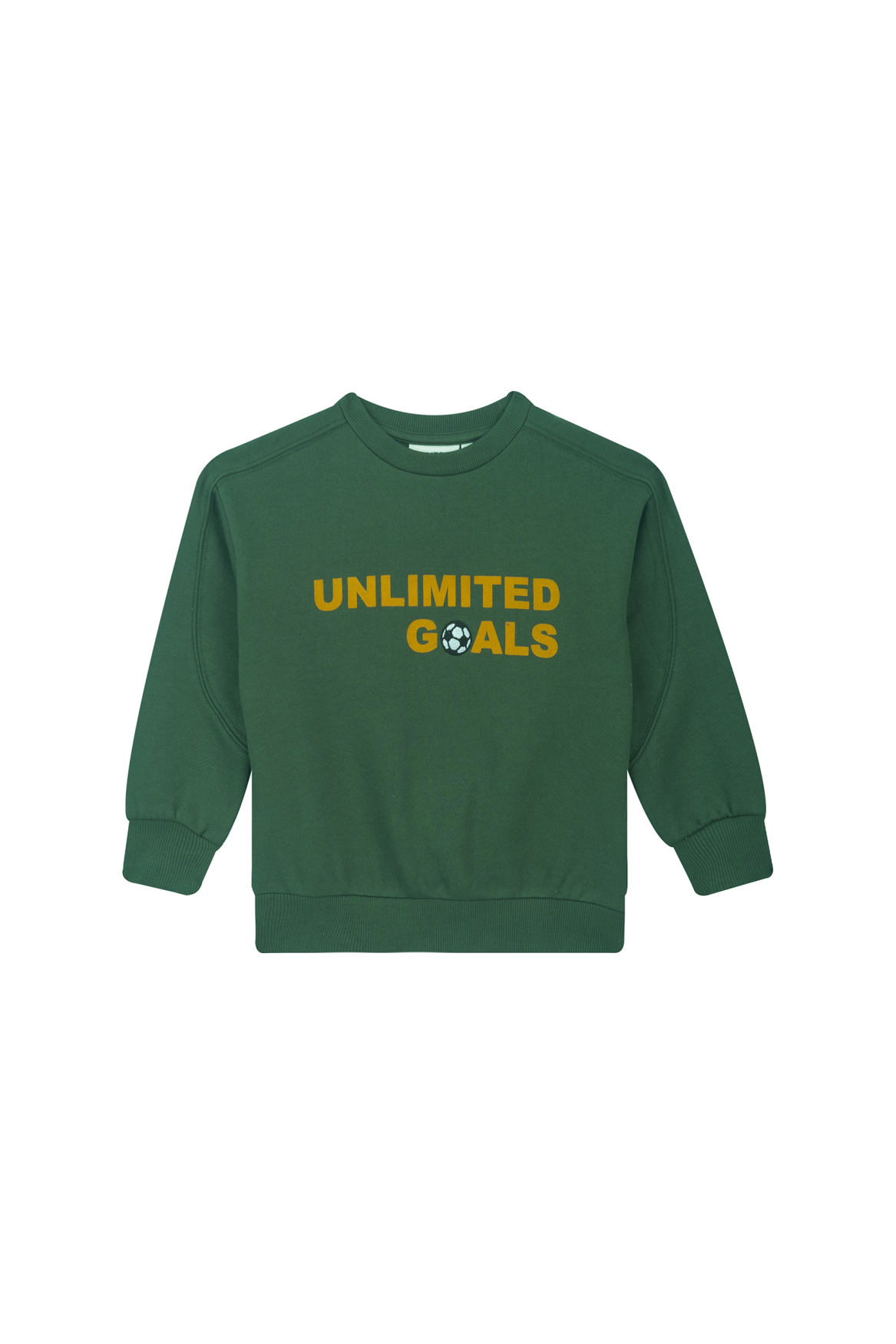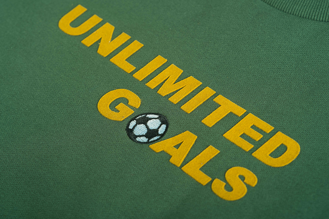 This green sweatshirt is a motivational and sporty pick for kids. Bold yellow-orange letters spell out “UNLIMITED GOALS” across the chest, with the “O” cleverly replaced by a soccer ball — a playful touch that adds character to the design. The crew neckline and ribbed trims ensure a comfy fit. Ideal for young dreamers and football fans who never stop aiming high.