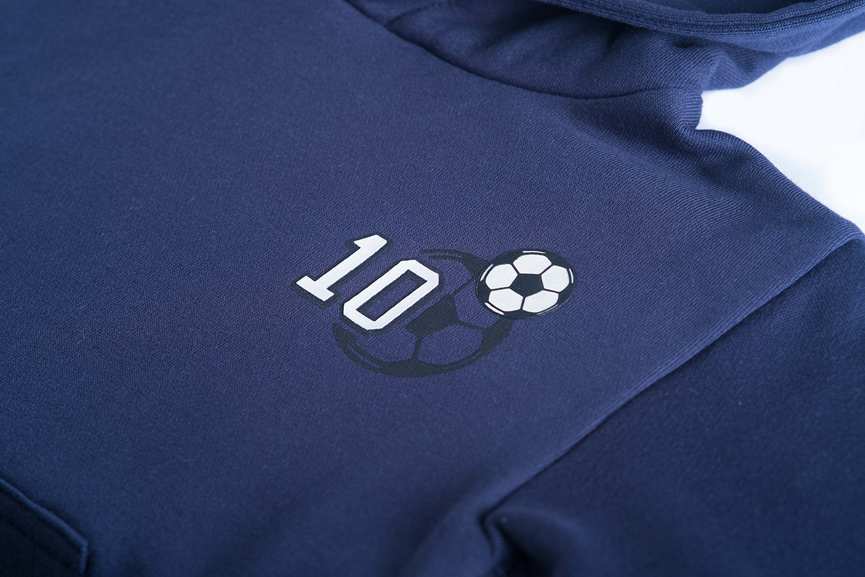 This dark blue hoodie is a sporty must-have for young football fans. It features a front kangaroo pocket, ribbed trims, and a subtle chest print with the number “10” and a small soccer ball. The hood adds extra warmth and comfort for chilly days — perfect for kids who love to stay active and enjoy the game.