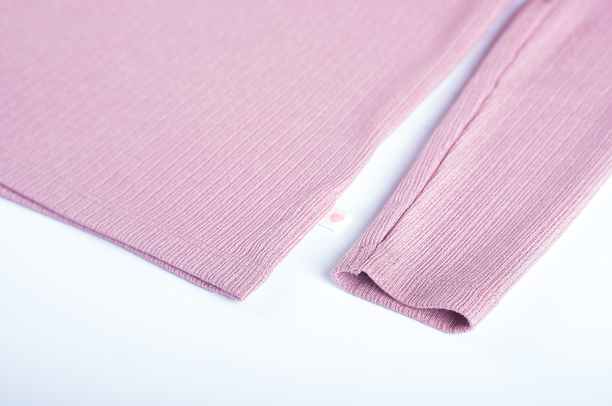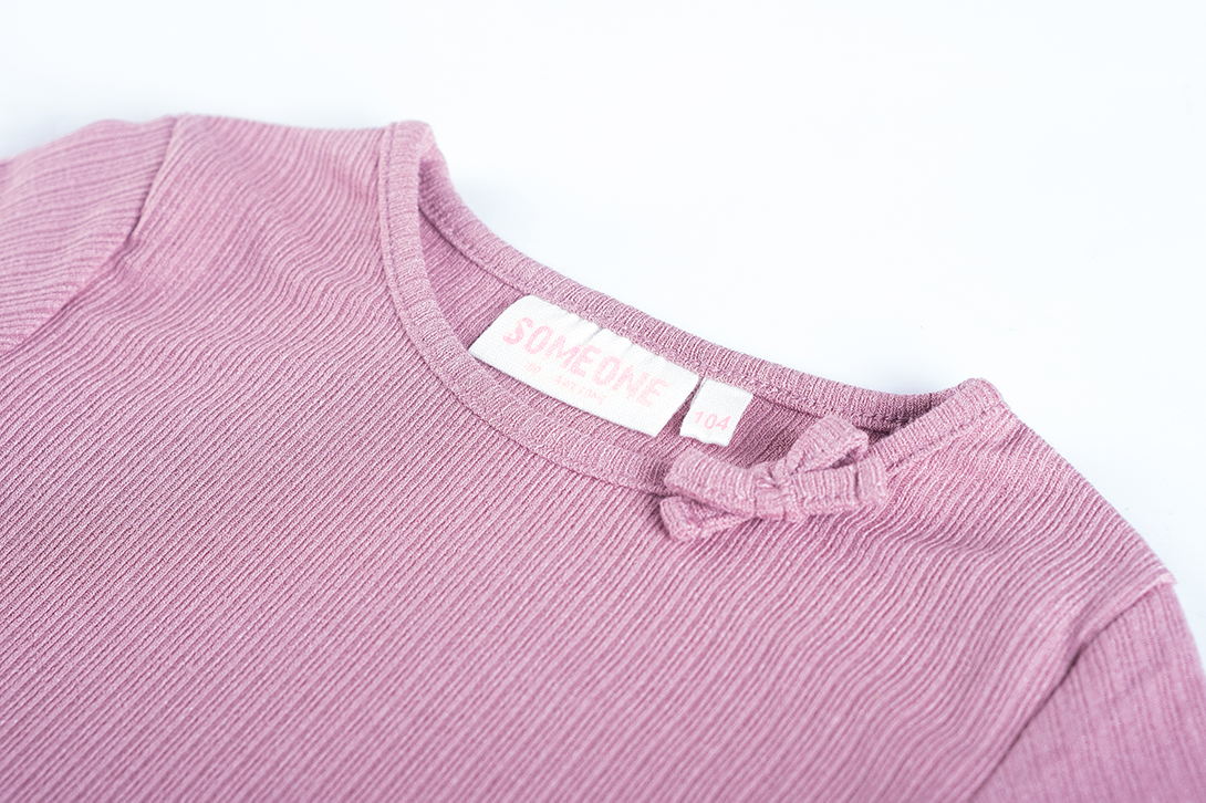 This dusty pink long-sleeved top is an elegant and soft-looking garment with a refined detail. A small decorative bow sits on the left shoulder, adding a subtle, playful touch to the design. The round neckline and fine ribbed texture provide a calm base that lets the bow stand out beautifully. A top that pairs effortlessly and suits both everyday wear and slightly dressier occasions.