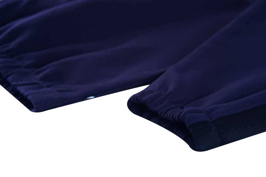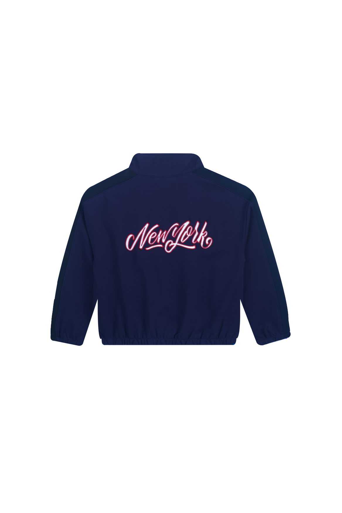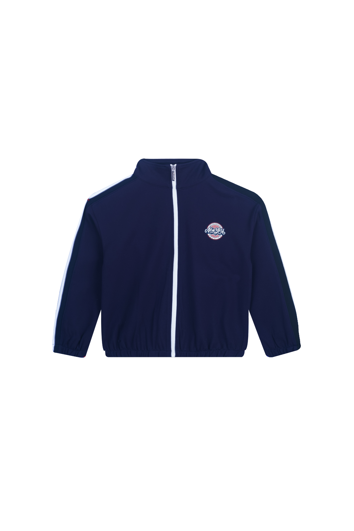 A sporty navy training jacket featuring a high collar and contrasting white zipper. The striped tape along the sleeves adds a retro athletic look, while the small chest logo gives it a clean, cool touch. Comfortable, lightweight, and perfect for everyday wear.