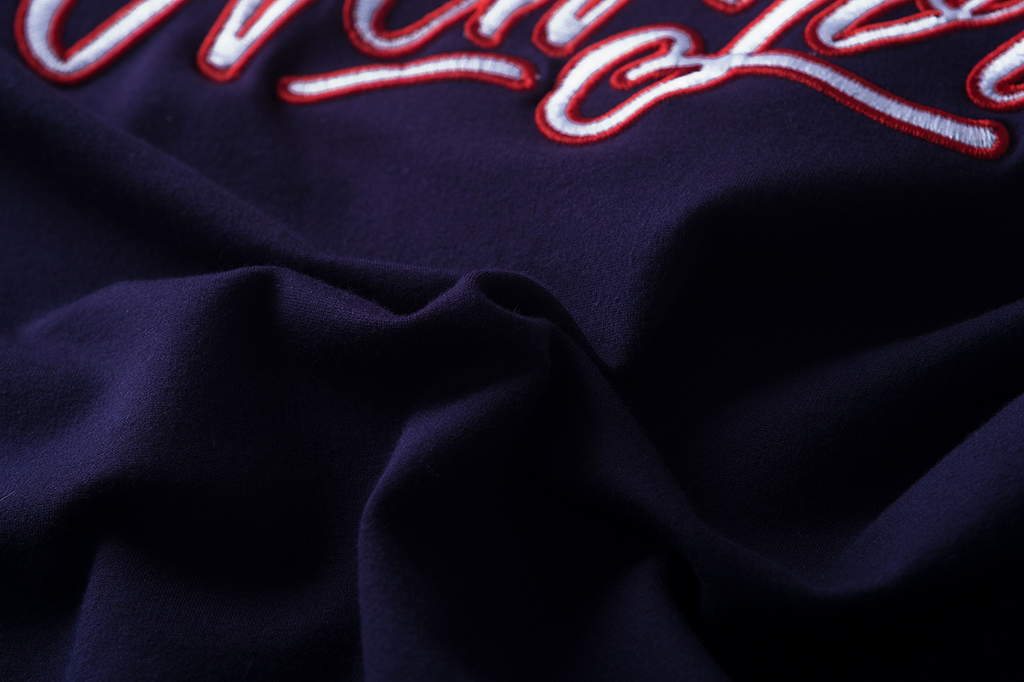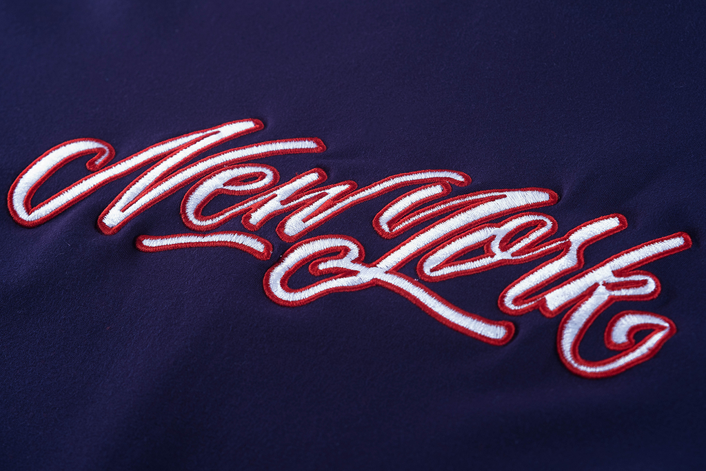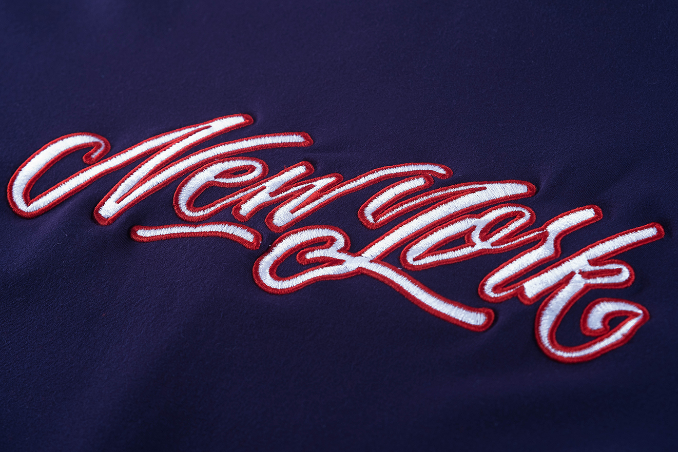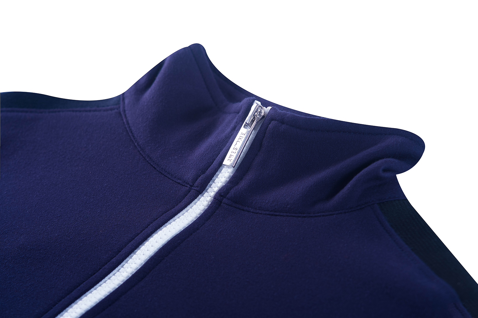 A sporty navy training jacket featuring a high collar and contrasting white zipper. The striped tape along the sleeves adds a retro athletic look, while the small chest logo gives it a clean, cool touch. Comfortable, lightweight, and perfect for everyday wear.