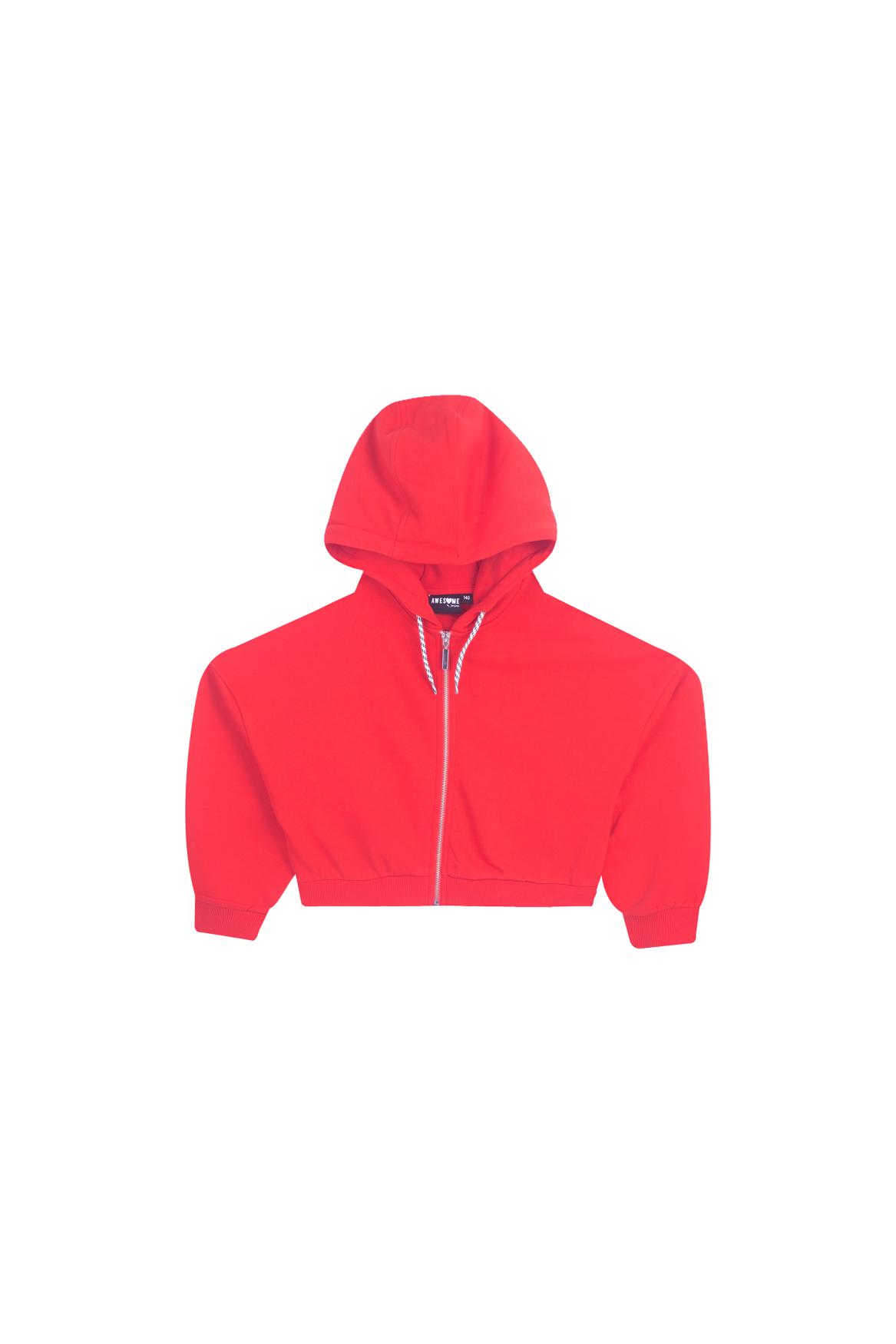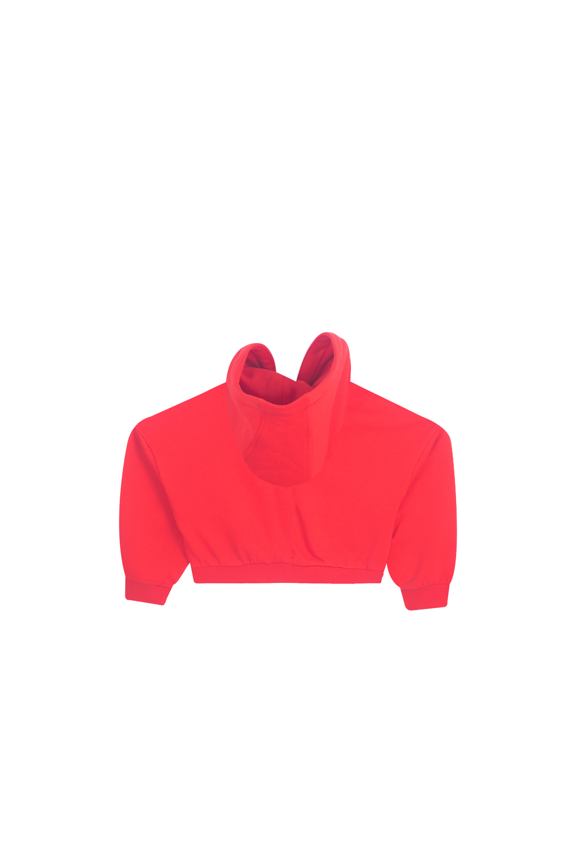 This bright red cropped hoodie is a comfortable and eye-catching piece for any outfit. The shorter fit creates a modern, sporty look, while the soft fabric ensures all-day comfort. The hood and drawstring add practicality, making it great for everyday wear. Perfect to pair with high-waisted jeans or sporty bottoms for a fresh and trendy style.