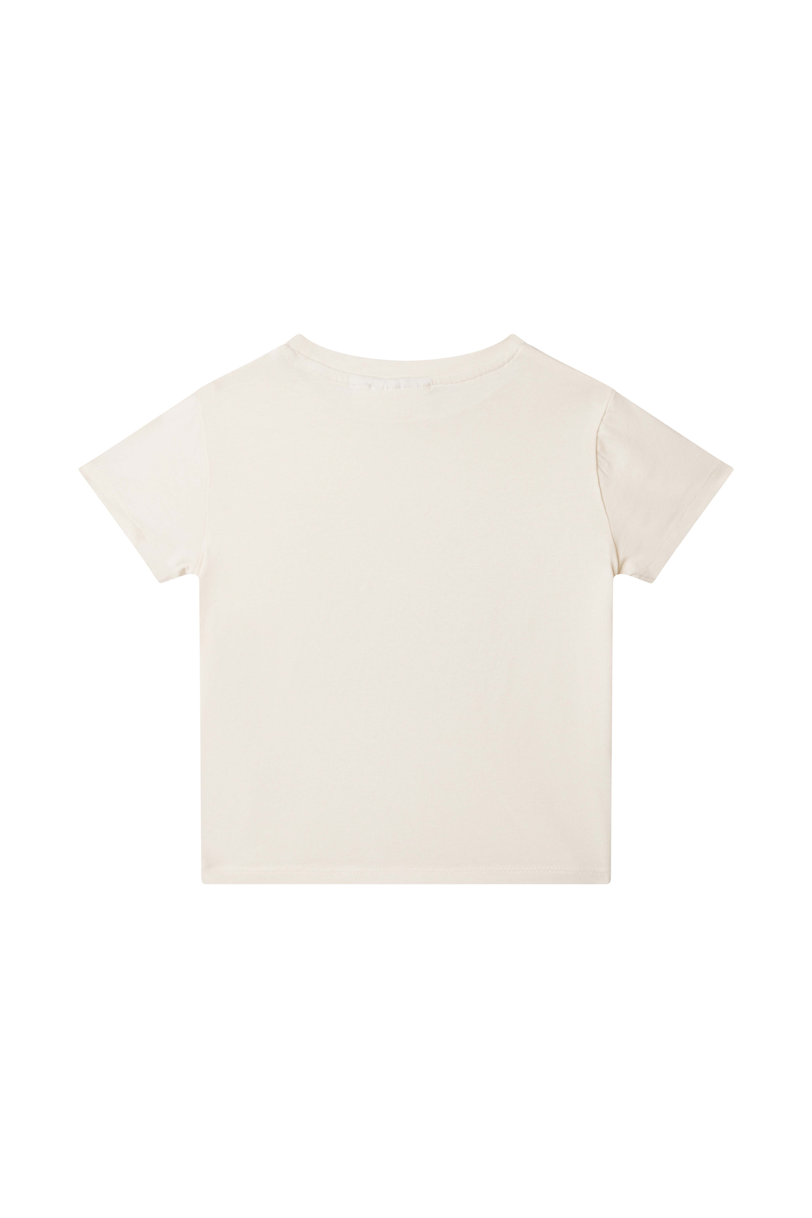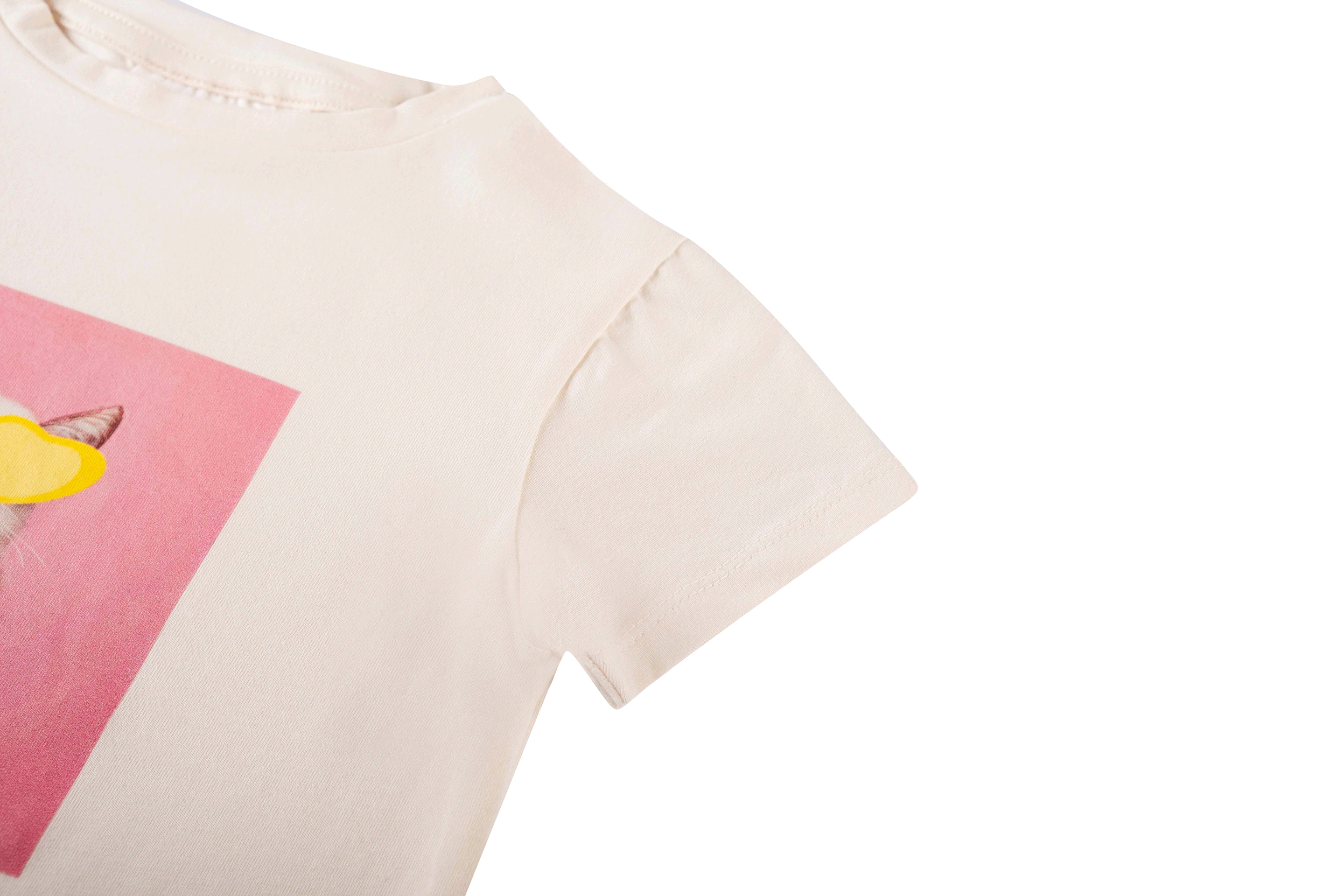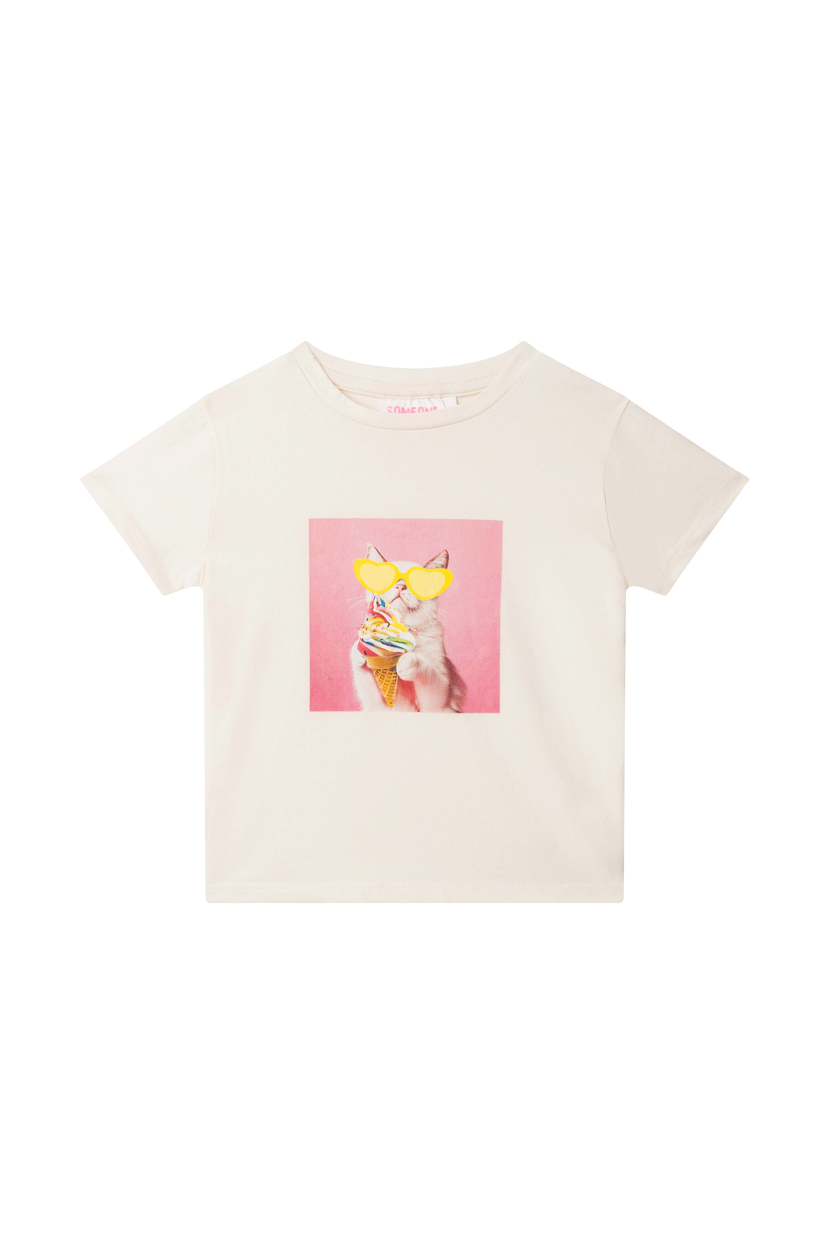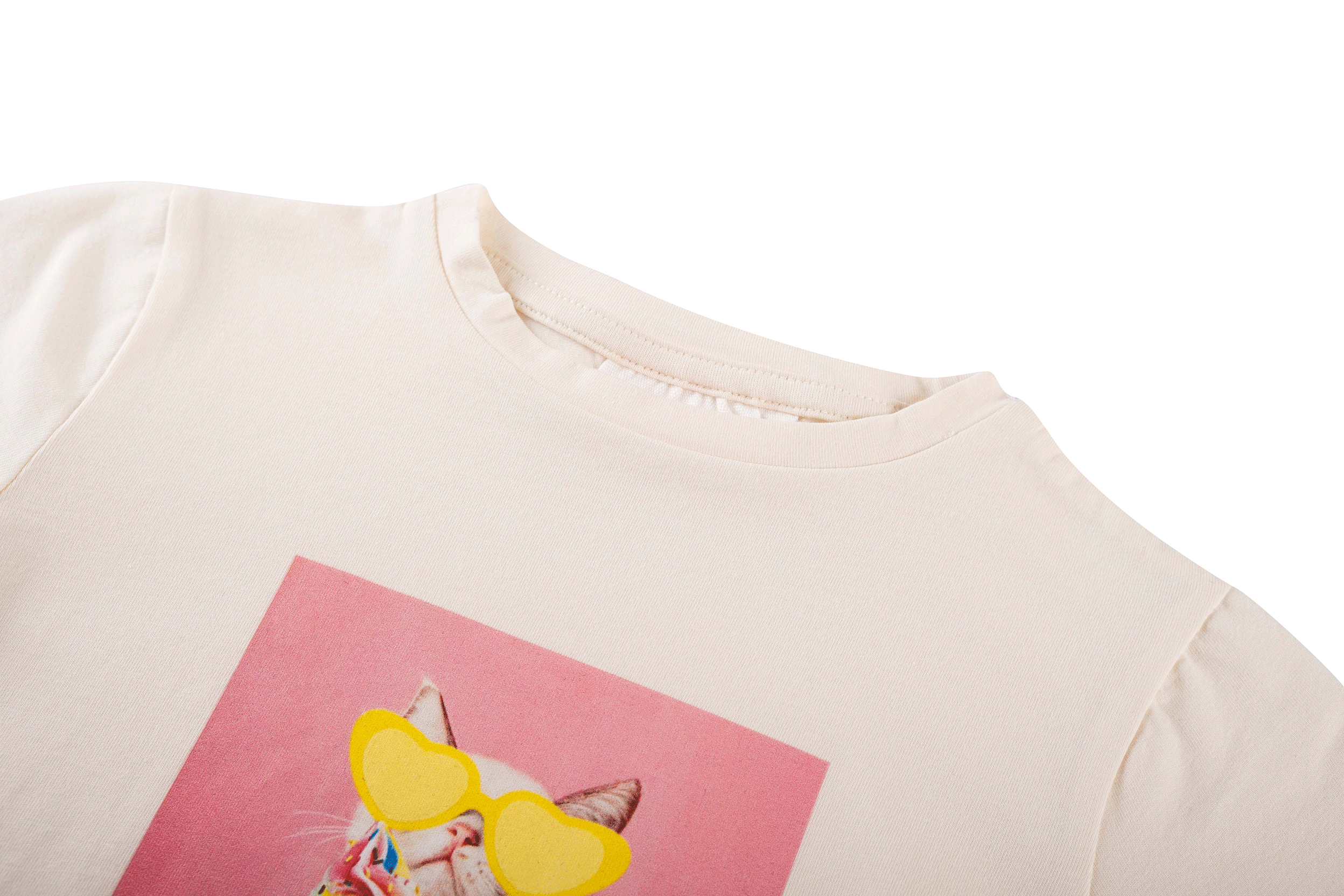 This T-shirt brings an instant smile with its playful print of a cat holding an ice cream while wearing bright yellow heart-shaped sunglasses. The soft colors create a cheerful summer look that stands out in a fun way. It’s perfect for kids who like outfits with personality and a little humor. Easy to pair with shorts, skirts, or simple denim for a bright and sunny feel.