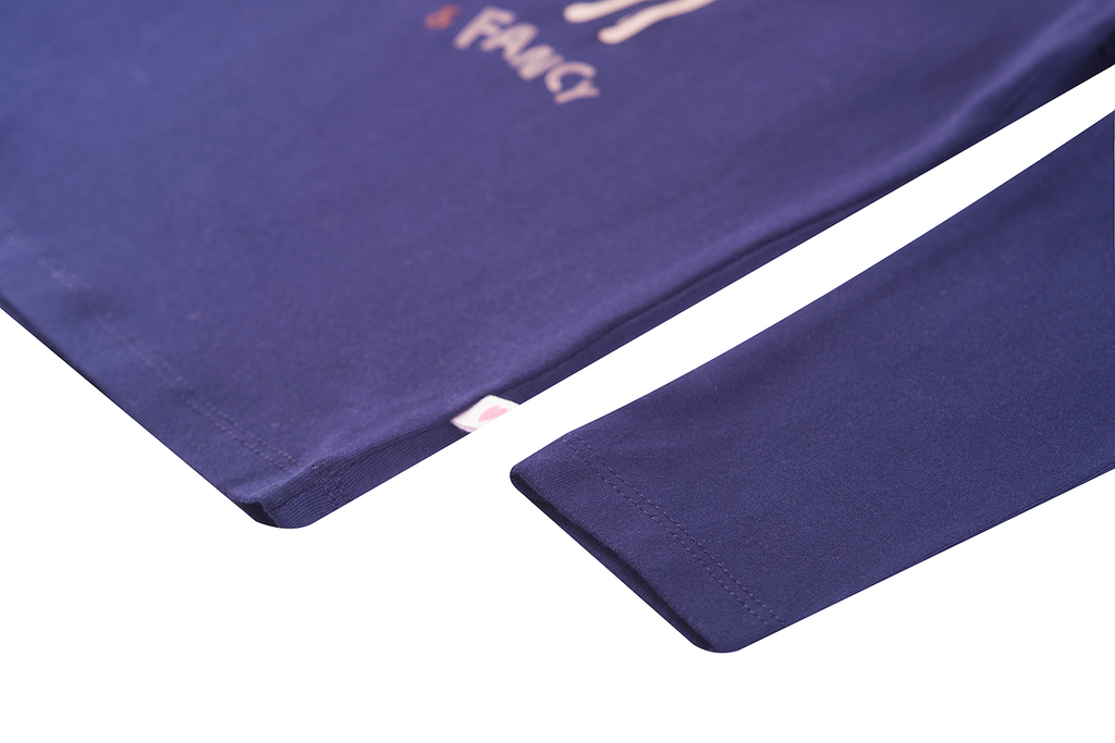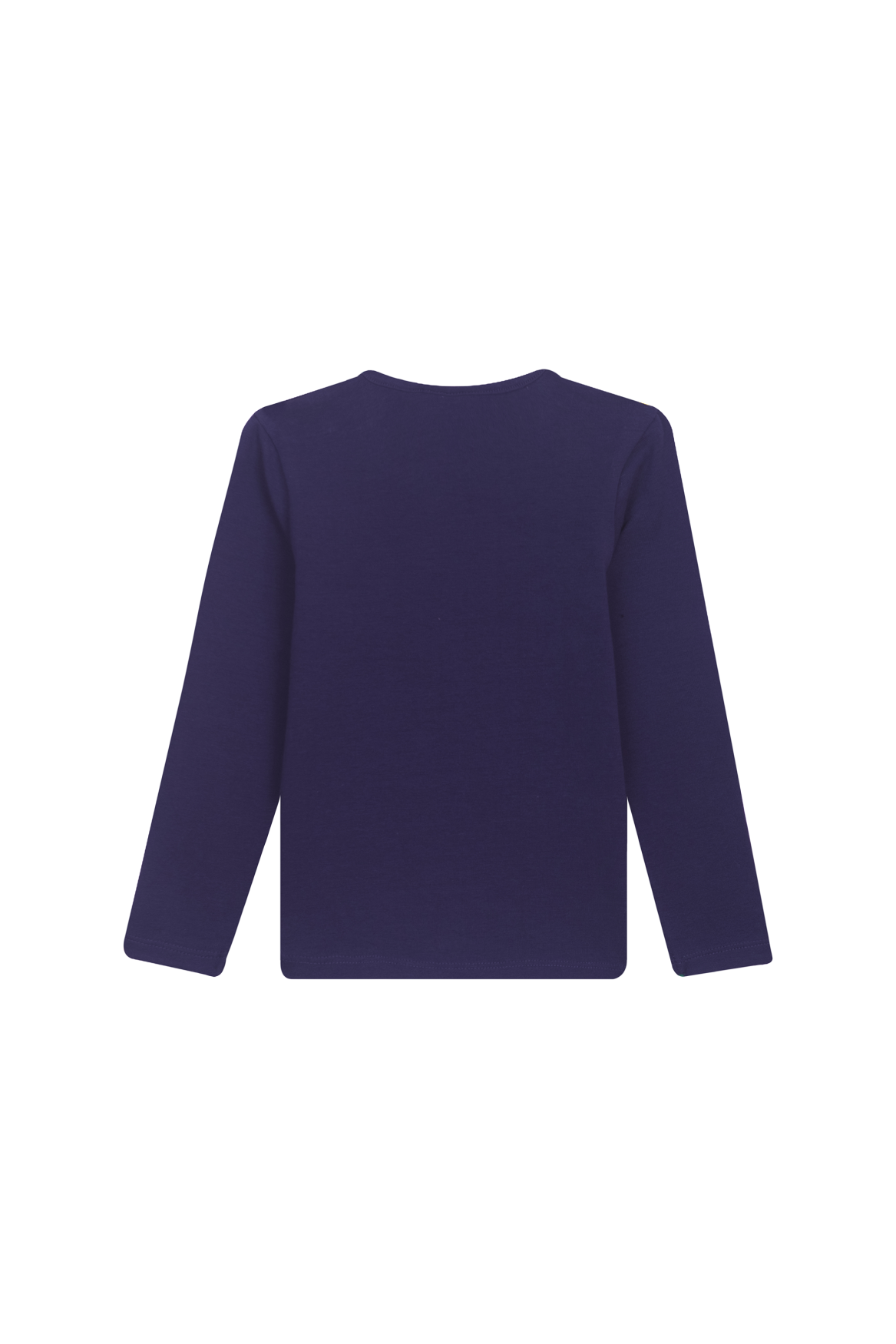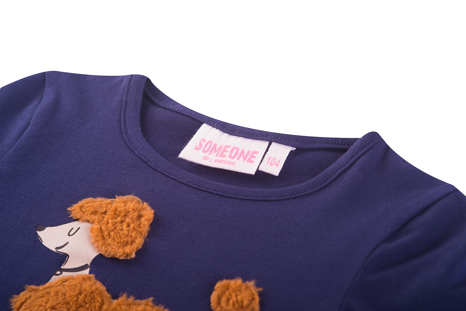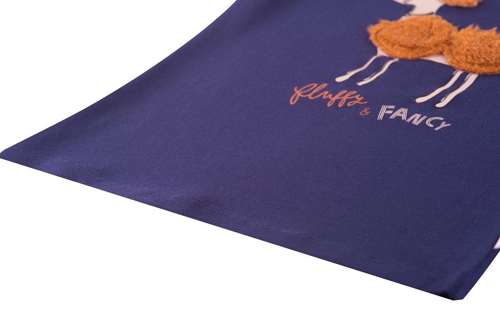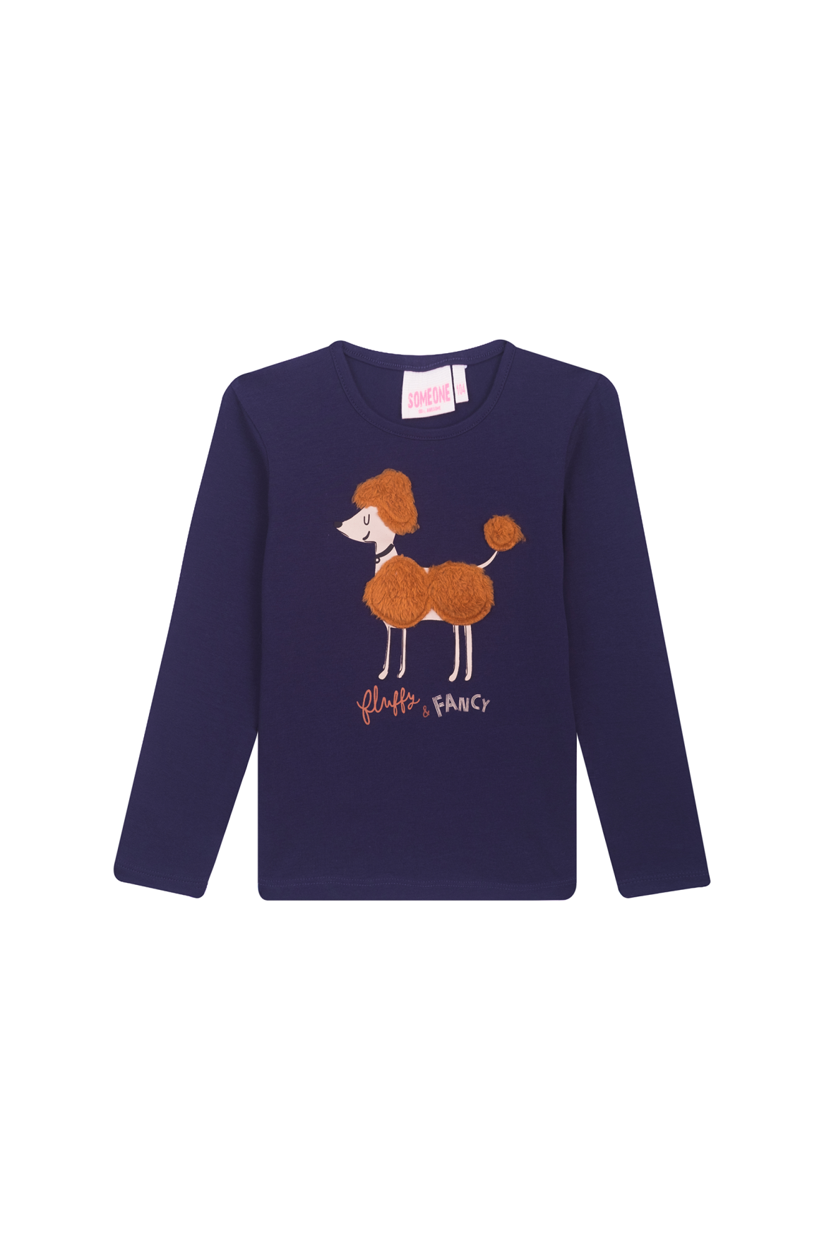 This navy blue long-sleeved top is a playful and stylish piece for girls who love unique prints. The poodle on the front, with its fluffy orange accents and the text "fluffy & FANCY", gives the shirt a cheerful and fashionable vibe. The mix of illustration and texture makes this garment extra special and eye-catching. Perfect for a casual outfit with a creative twist, or as a standout piece under a cardigan or jacket. A top full of character that adds a bold touch of flair to any look.